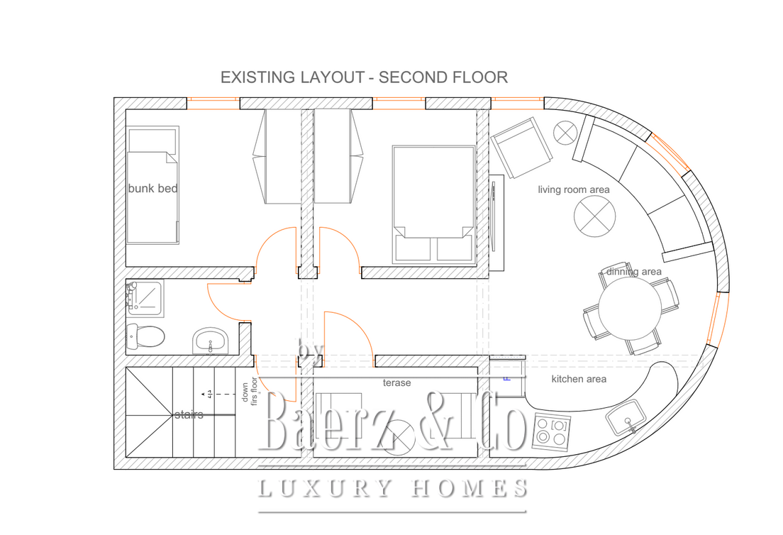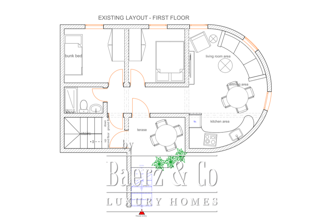 يتكون هذا المنزل من ثلاثة مستويات، يحتوي كل منها على شقة مستقلة بمساحة 50 مترًا مربعًا. تبدو الواجهة الحجرية انعكاسًا للتراث المعماري للمنطقة، وتنسجم بأناقة مع محيطها. تتوفر مواقف خاصة لسيارتين وطريق معبد يصل مباشرة للمنزل، ما يضمن سهولة الوصول، بينما يفتح المدخل في الطابق الأول لمزيد من الخصوصية.