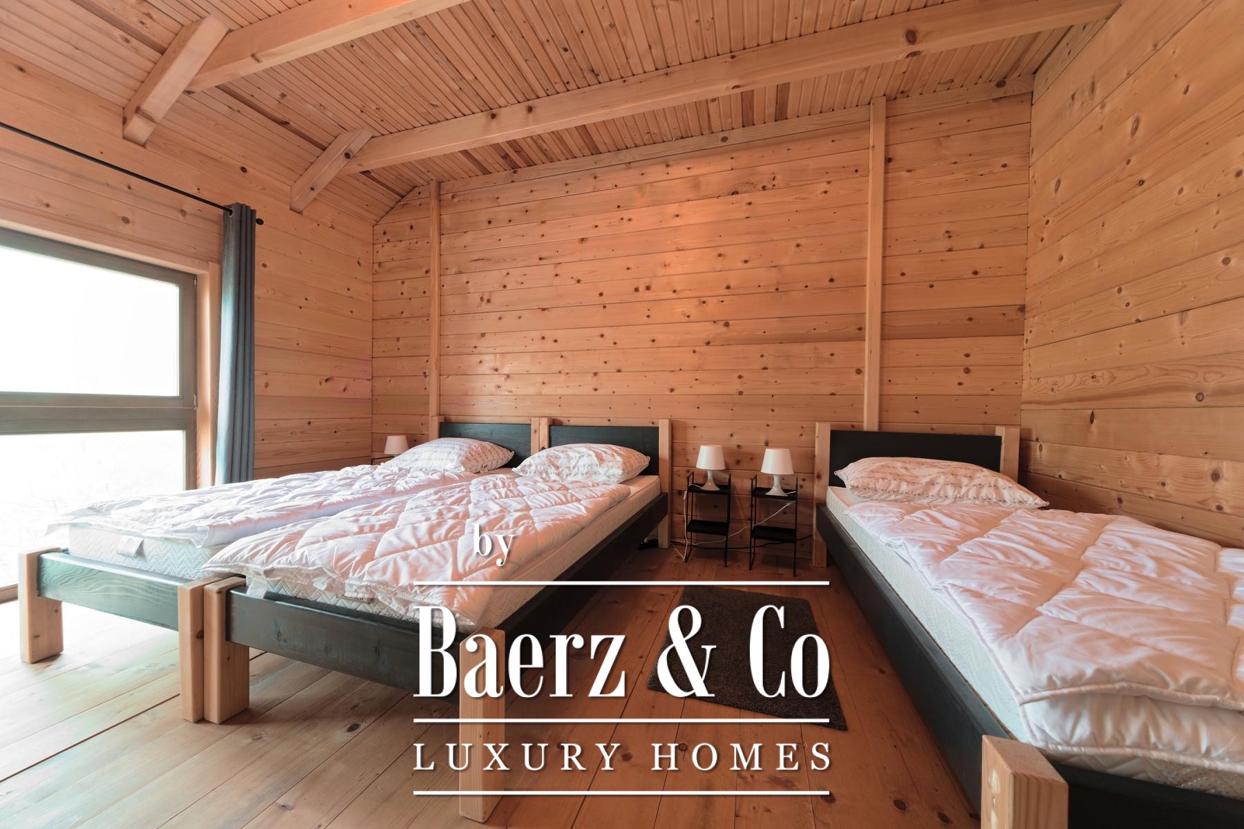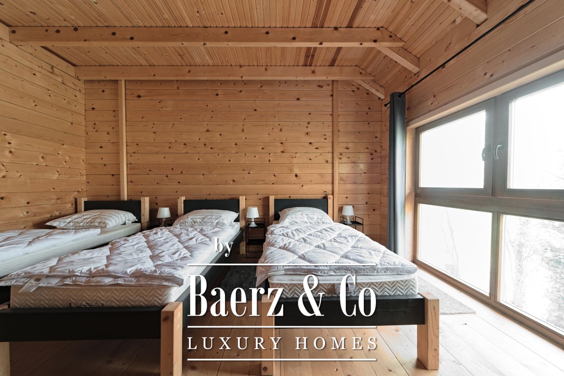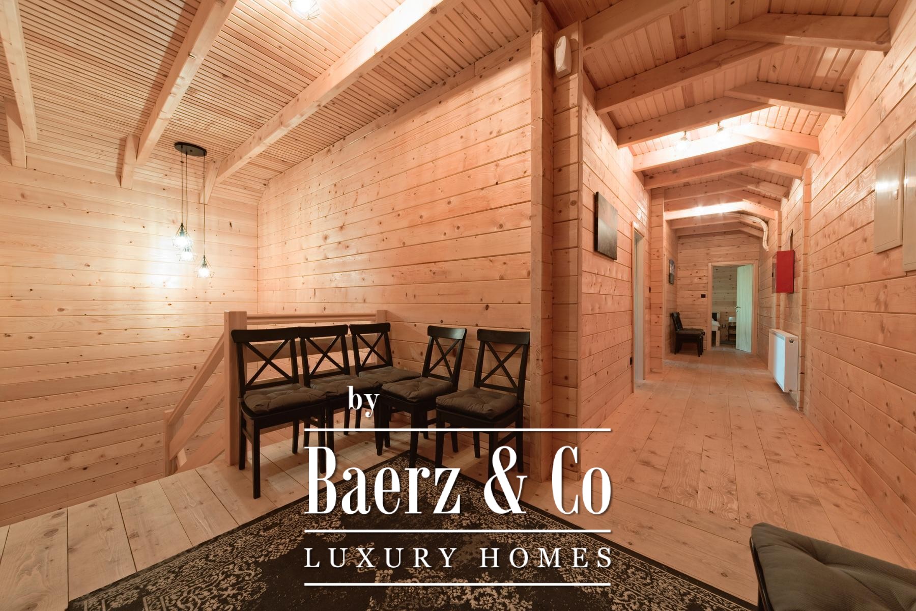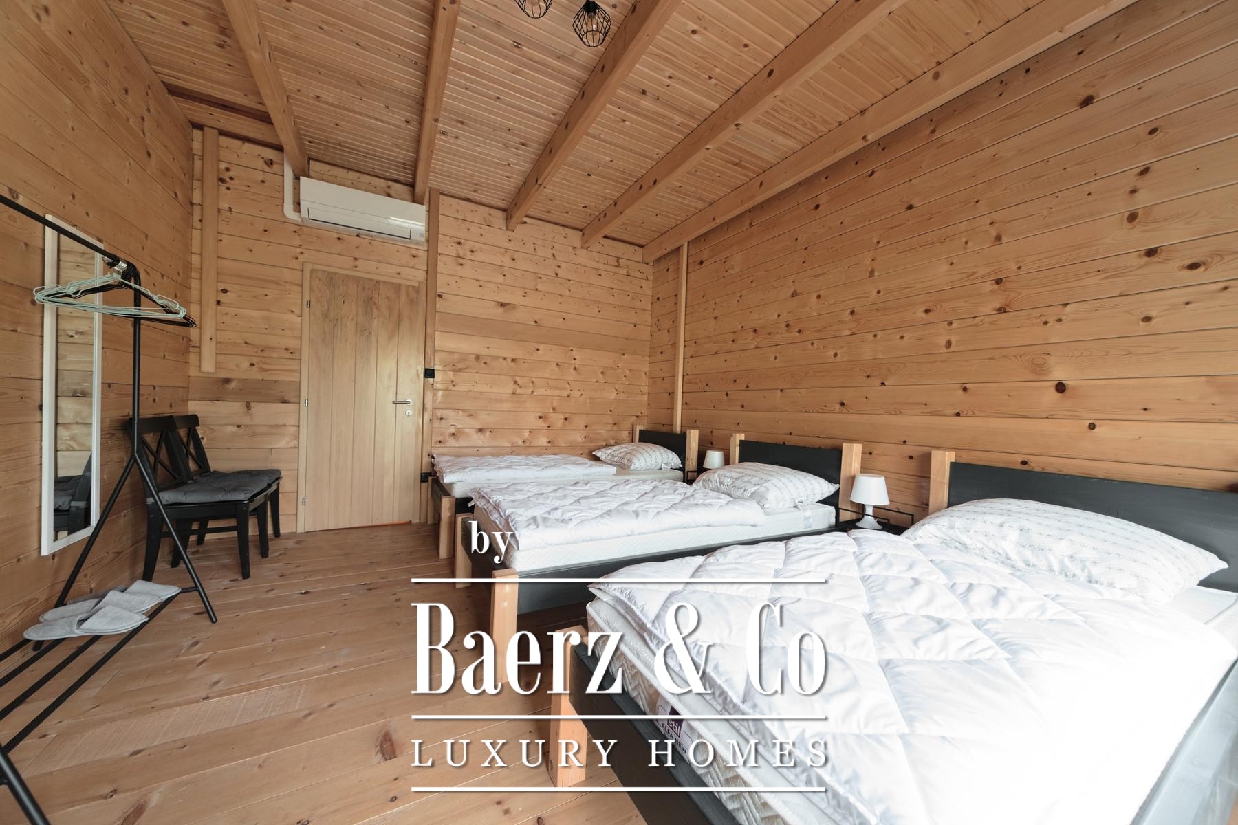 وبجوار المنزل الرئيسي، توفر خمسة منازل خشبية جديدة كل منها 80 متراً مربعاً من مساحة المعيشة. يتكوّن التصميم من منطقة معيشة مشرقة ودورة مياه في الطابق الأرضي، بينما يوجد غرفتا نوم في الطابق العلوي. تطل الشرفات الخاصة في الخلف على الأراضي الواسعة، مع نظام تدفئة صُمّم ليكون فعالاً ومستقلاً.