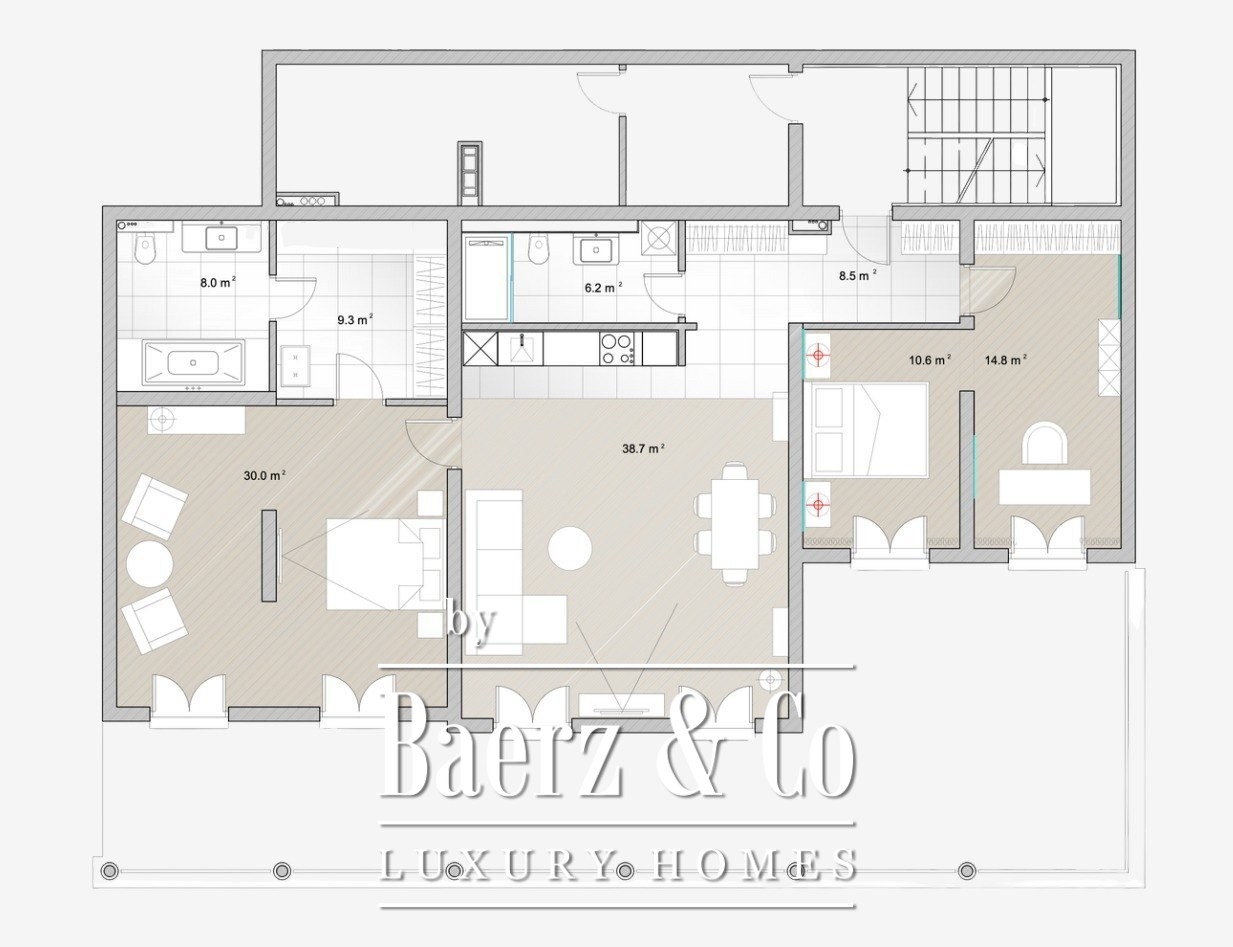 تقع شقة هرسك نوفي بهدوء في الطابق الثاني من مجمع حصري يتألف من خمسة مبانٍ أنيقة، فوق الساحل مباشرة في مونتينيغرو. تمتد هذه الإقامة على مساحة إجمالية تبلغ 179 مترًا مربعًا، منها شرفة بانورامية بمساحة 54 مترًا مربعًا، لتخلق تواصلاً سلسًا بين الراحة الداخلية ونور البحر المتوسط. يضفي توزيع المساحات إحساسًا بالإيقاع: ردهة استقبال، ثلاث غرف نوم، غرفة معيشة مفتوحة مع مطبخ ومنطقة طعام، وحمامين، جميعها مصممة لتعظيم وضوح البيئة الطبيعية.