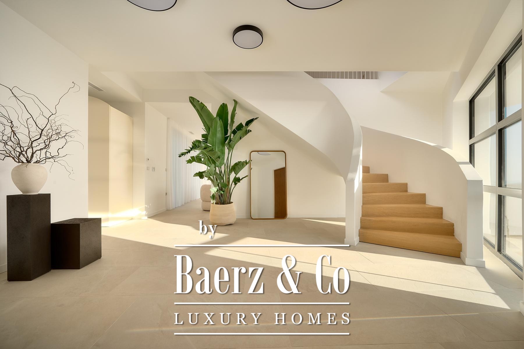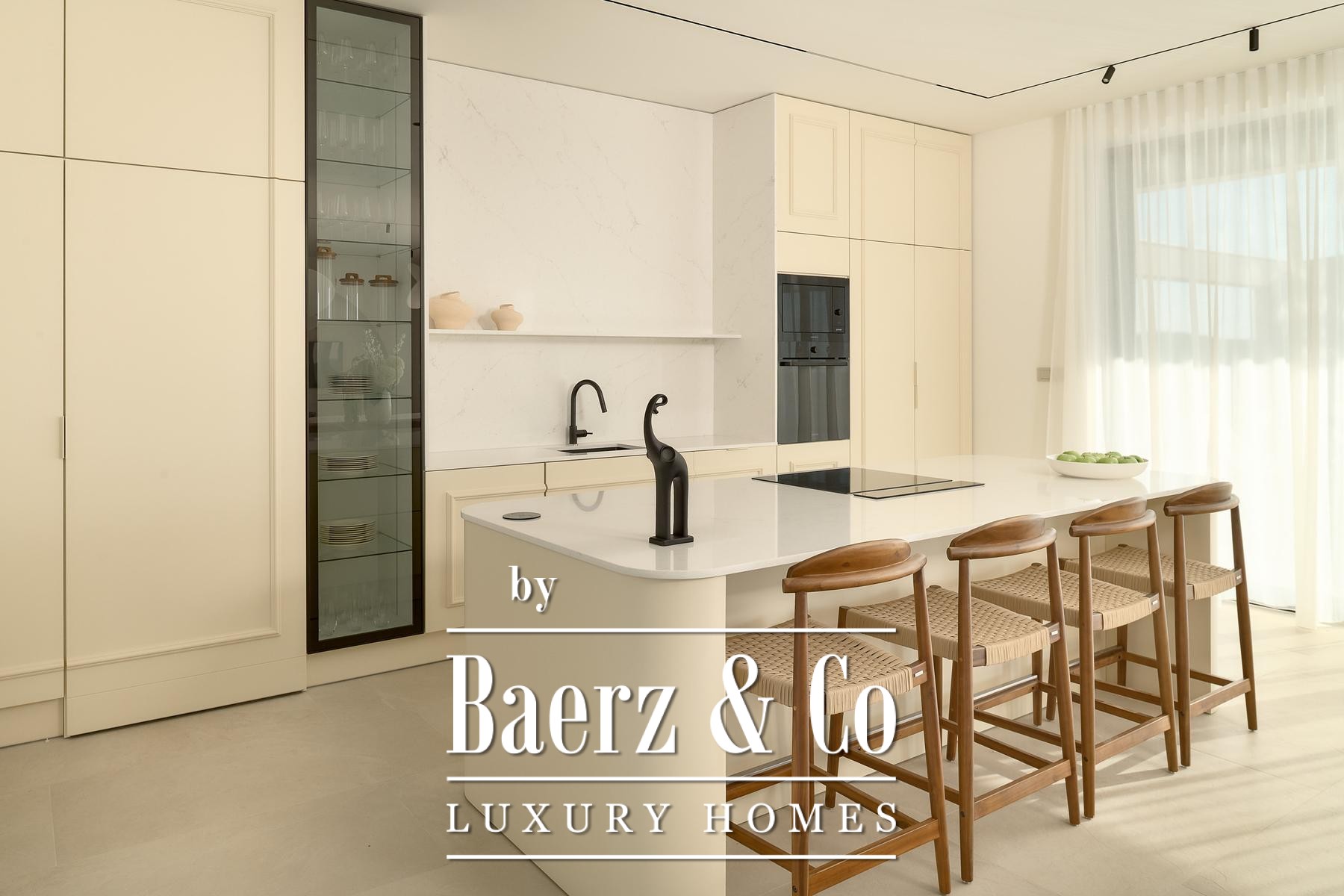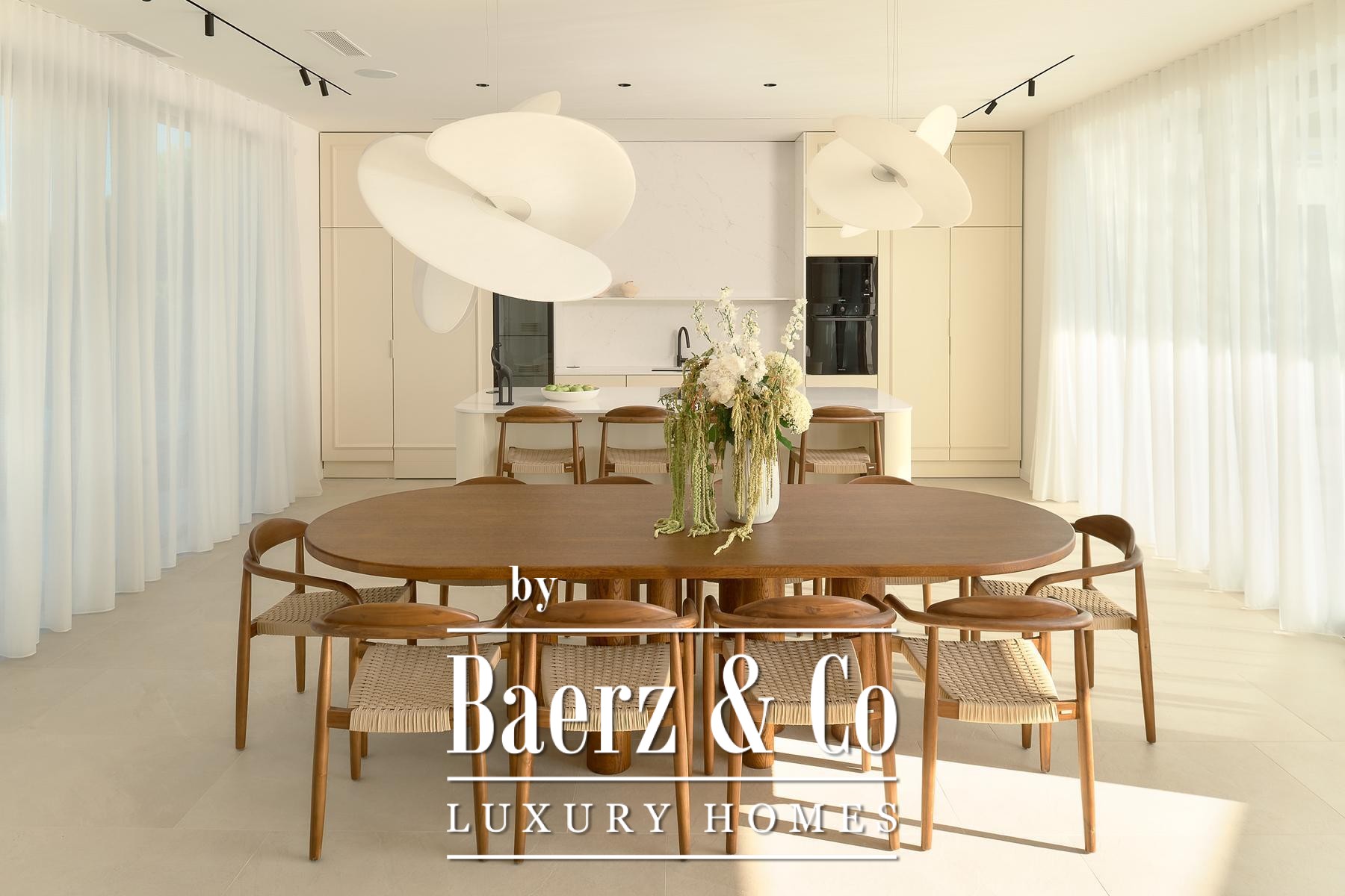 يرحب بك الطابق الأرضي في مساحة معيشة وطعام مضيئة بمخطط مفتوح تتصل بسلاسة بمطبخ عصري، وتُعزز بجدران زجاجية تمتد من الأرض إلى السقف ما يسمح بدخول الضوء الطبيعي ويربط بين الداخل والخارج دون عناء. تستضيف التراسات الواسعة مناطق للاسترخاء والاستضافة، بما في ذلك مطبخ صيفي وشواية بجوار المسبح اللا متناهي ومنصة التشمس.