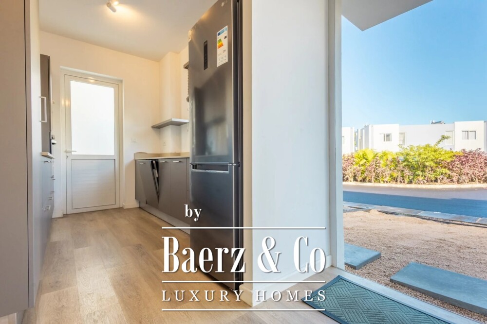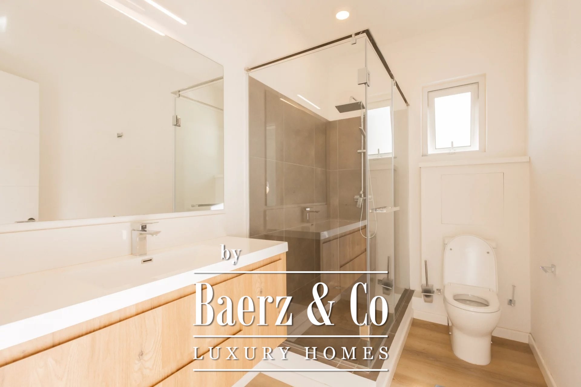 في الخارج، يوفر المسبح الخاص لحظات من الهدوء وإطلالات بانورامية على المساحات الخضراء وحوض السباحة، مما يضفي إحساسًا بالضوء والانفتاح على تفاصيل الحياة اليومية. وتوسع الشرفة مساحة المعيشة، لتمنح النسمات الطبيعية والمشاهد الخضراء.
