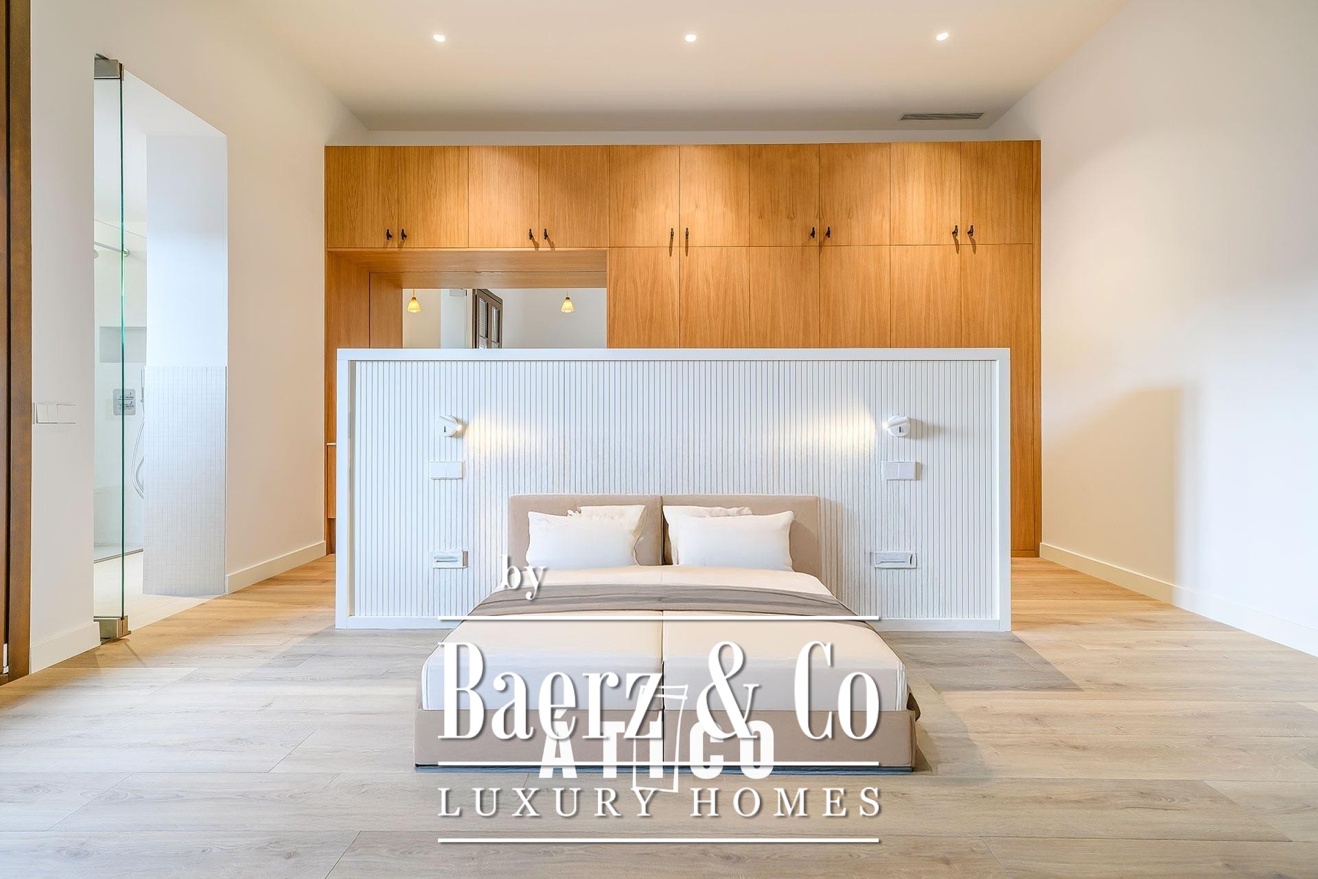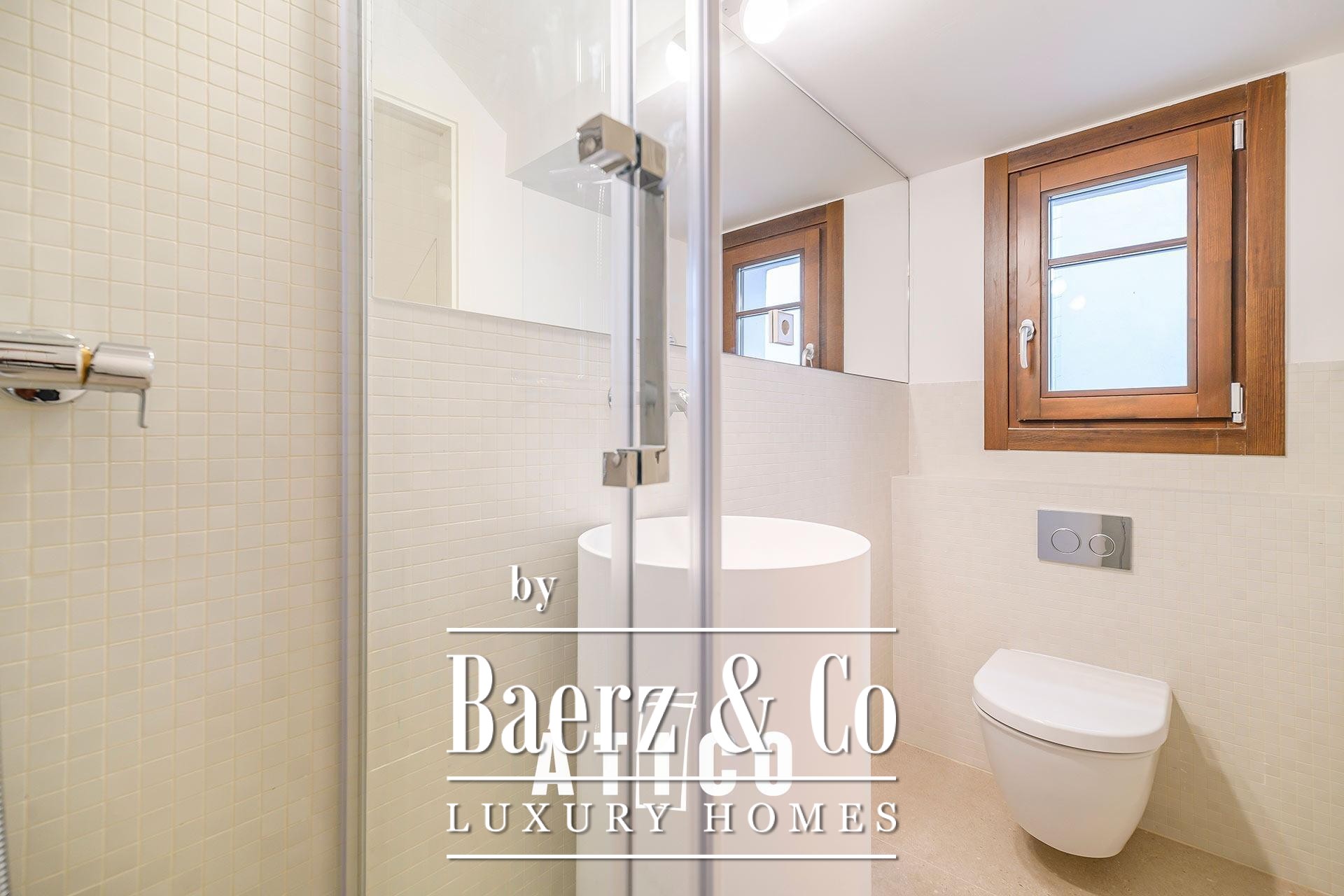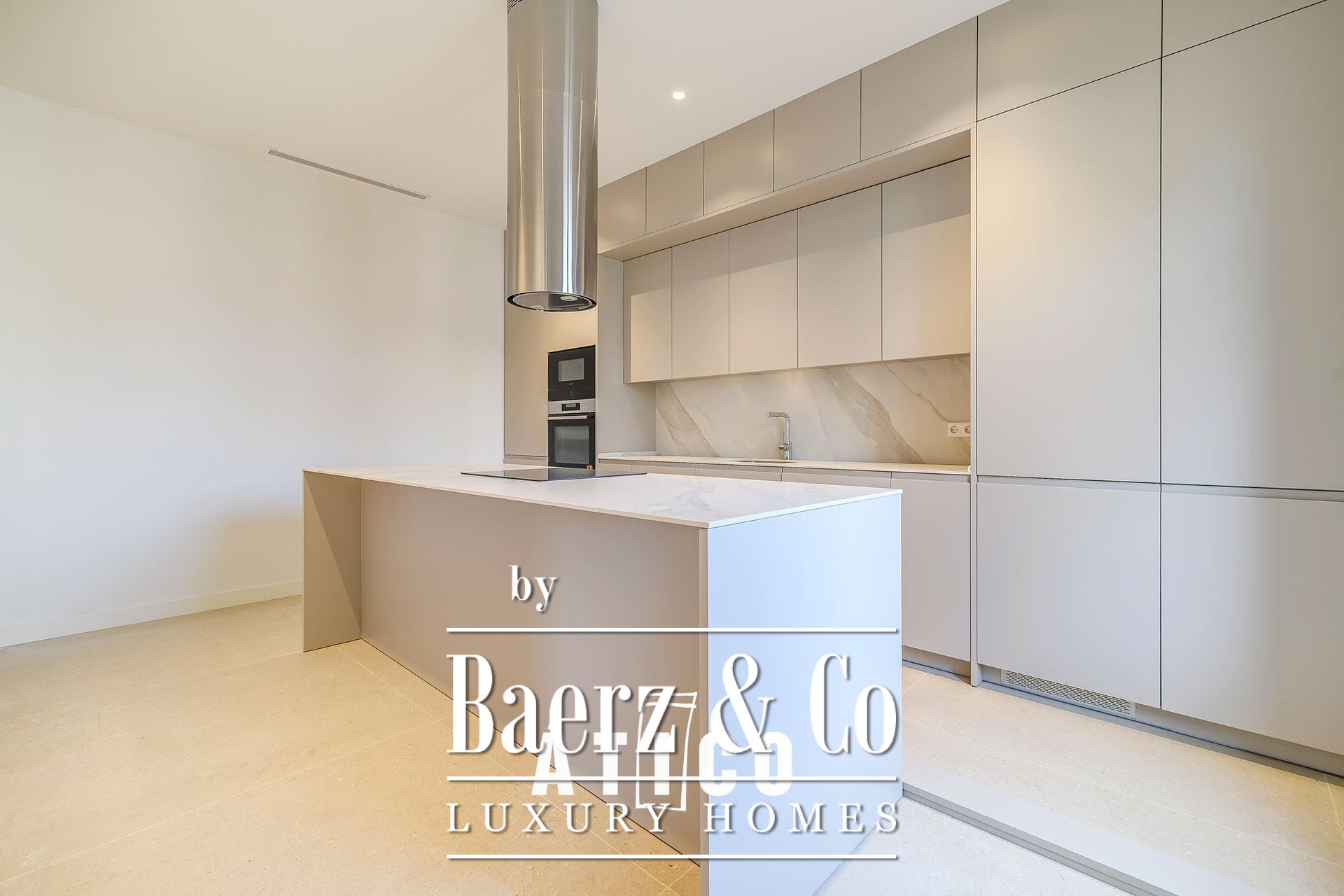 Im oberen Stockwerk finden sich ein Schlafzimmer, ein vielseitig nutzbarer Raum für Arbeit oder Freizeit sowie ein voll ausgestattetes Bad. Eine 38,85 m² große Terrasse erweitert den Wohnraum nach draußen und bietet den perfekten Rahmen für offene Zusammenkünfte oder stille Momente unter dem Himmel der Stadt. Drei Schlafzimmer und drei Bäder sorgen für eine ausgewogene Balance aus Komfort und Rückzug, während ausgesuchte Materialien und tadellose Verarbeitung den durchgehenden Anspruch an höchste Handwerkskunst unterstreichen. Die Küche ist ebenso durchdacht gestaltet, sie bietet großzügigen Stauraum und eine durchdachte Lösung für den Alltag.