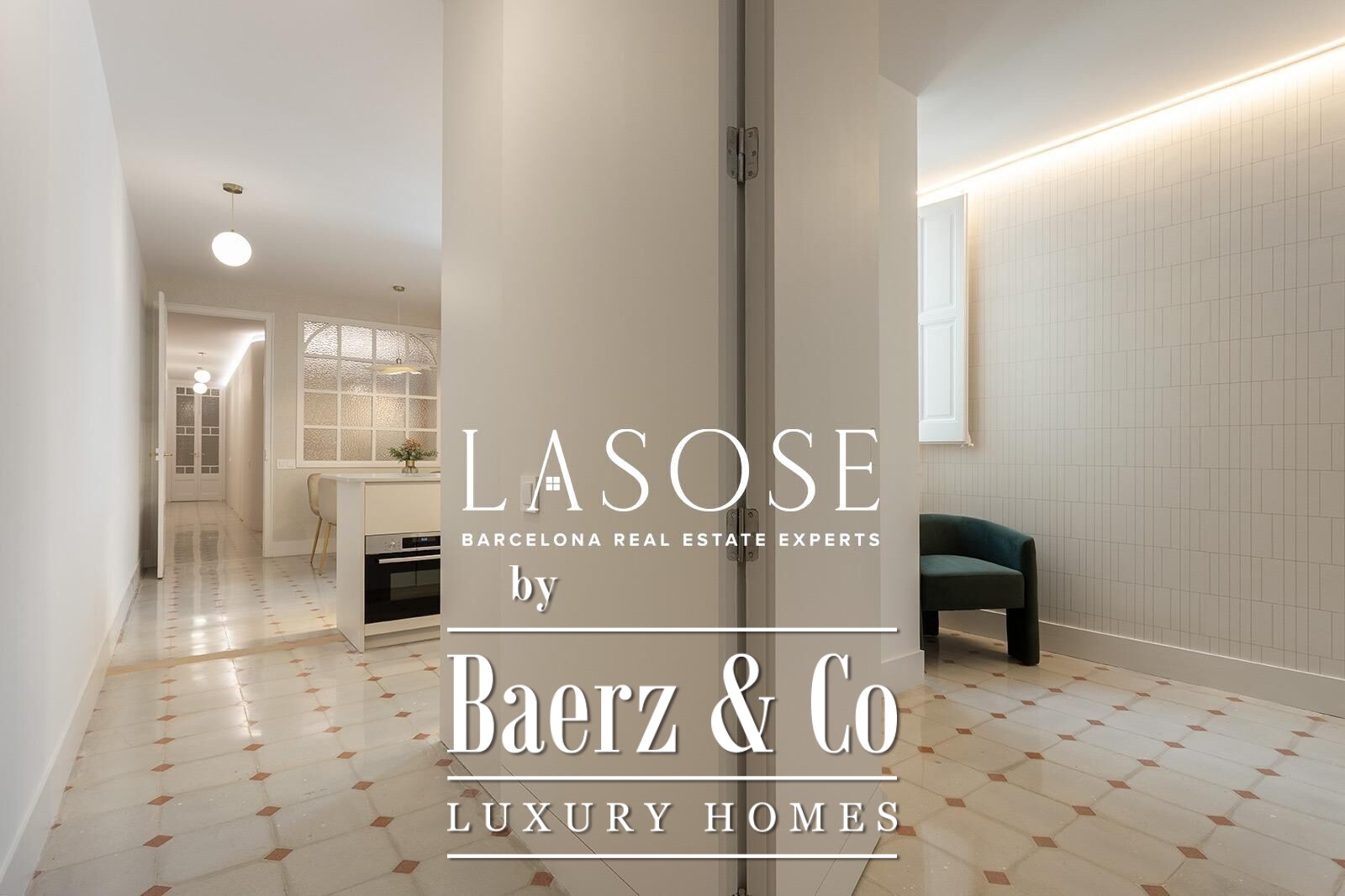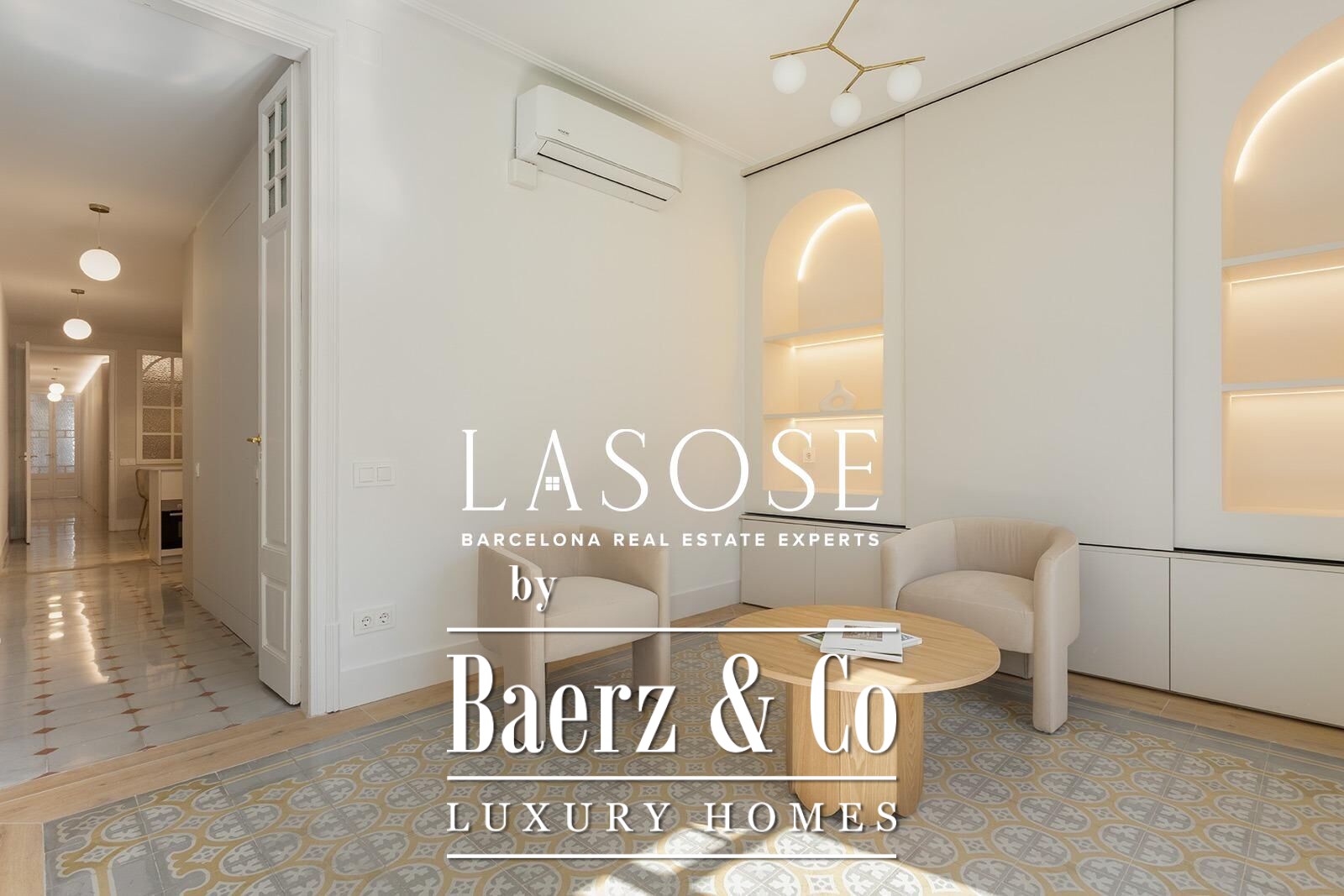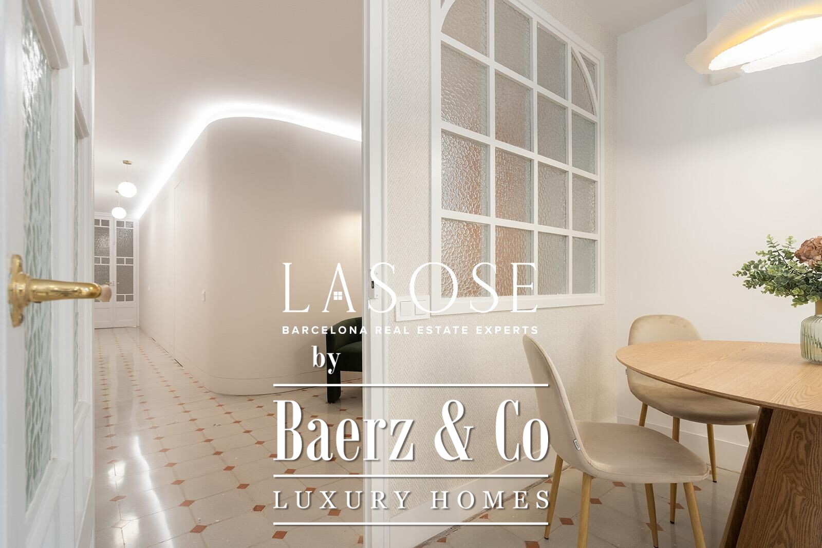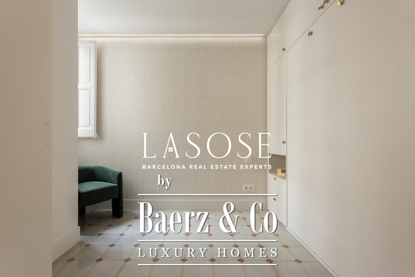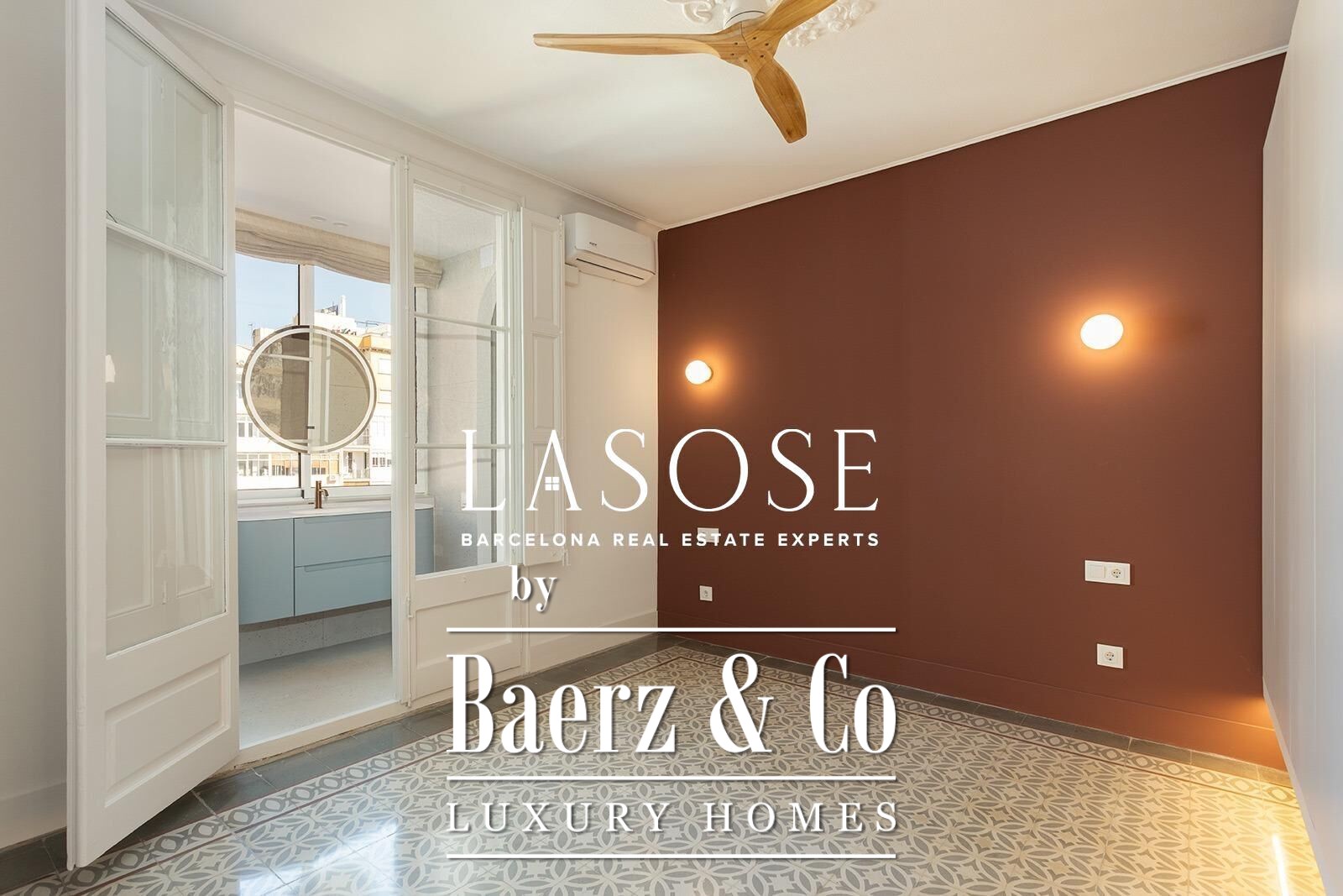 Apartment Barcelona ist eine Residenz, in der sich historische Architektur mit zeitgenössischer Renovierung vereint und die sich im obersten Stockwerk des Eixample befindet. Die 115 m² große Wohnung, die 2025 vollständig erneuert wurde, empfängt reichlich Tageslicht durch den nach Südosten ausgerichteten Balkon, der den Wohnbereich mit Wärme erfüllt und vom Salon aus einen offenen Ausblick bietet. Originale Hydraulikfliesen und eine sorgfältig restaurierte katalanische Decke zeugen von handwerklicher Raffinesse der Epoche, während moderne Beleuchtung, elegante Bäder und neue Geräte sich harmonisch in das stilvolle Gesamtbild einfügen.