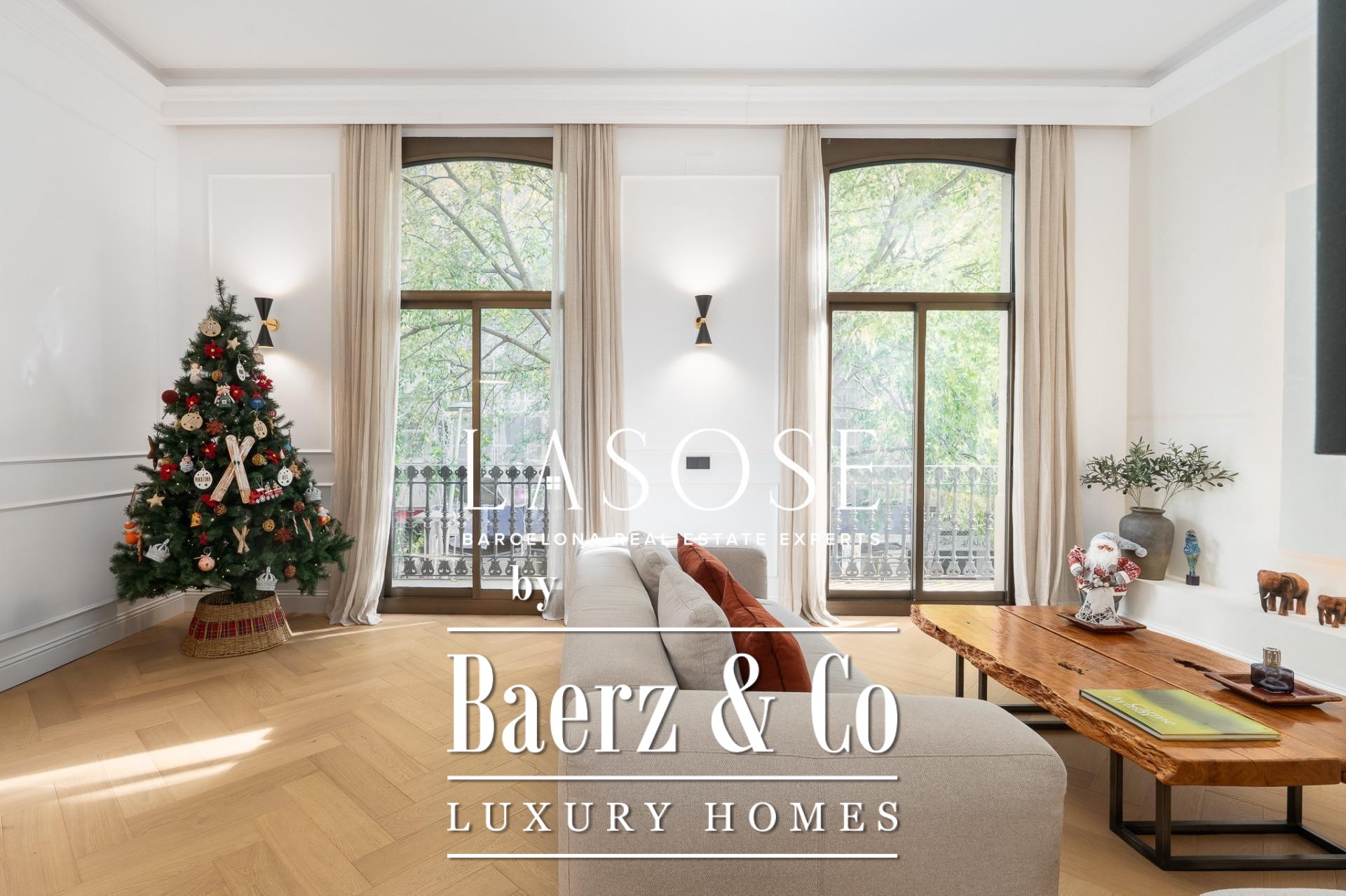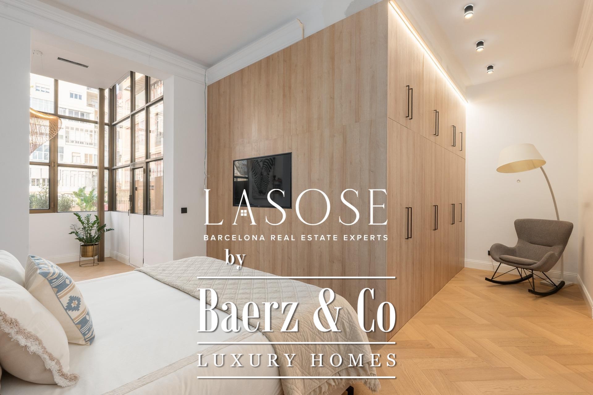 Dieses modernistische Apartment im Quadrat d'Or von Barcelona ist eine seltene Gelegenheit und bietet 150 Quadratmeter sorgfältig restaurierte Innenfläche sowie eine außergewöhnliche rückwärtige Terrasse von etwa 100 Quadratmetern. Die Wohnung befindet sich in einem denkmalgeschützten Gebäude und wurde 2024 mit hochwertigen Ausstattungen vollständig saniert. Historische Details wie Außenholzarbeiten aus natürlicher Eiche, hohe Innentüren und individuell gestaltete Einbauschränke sind erhalten geblieben und unterstreichen die zeitlose Qualität.