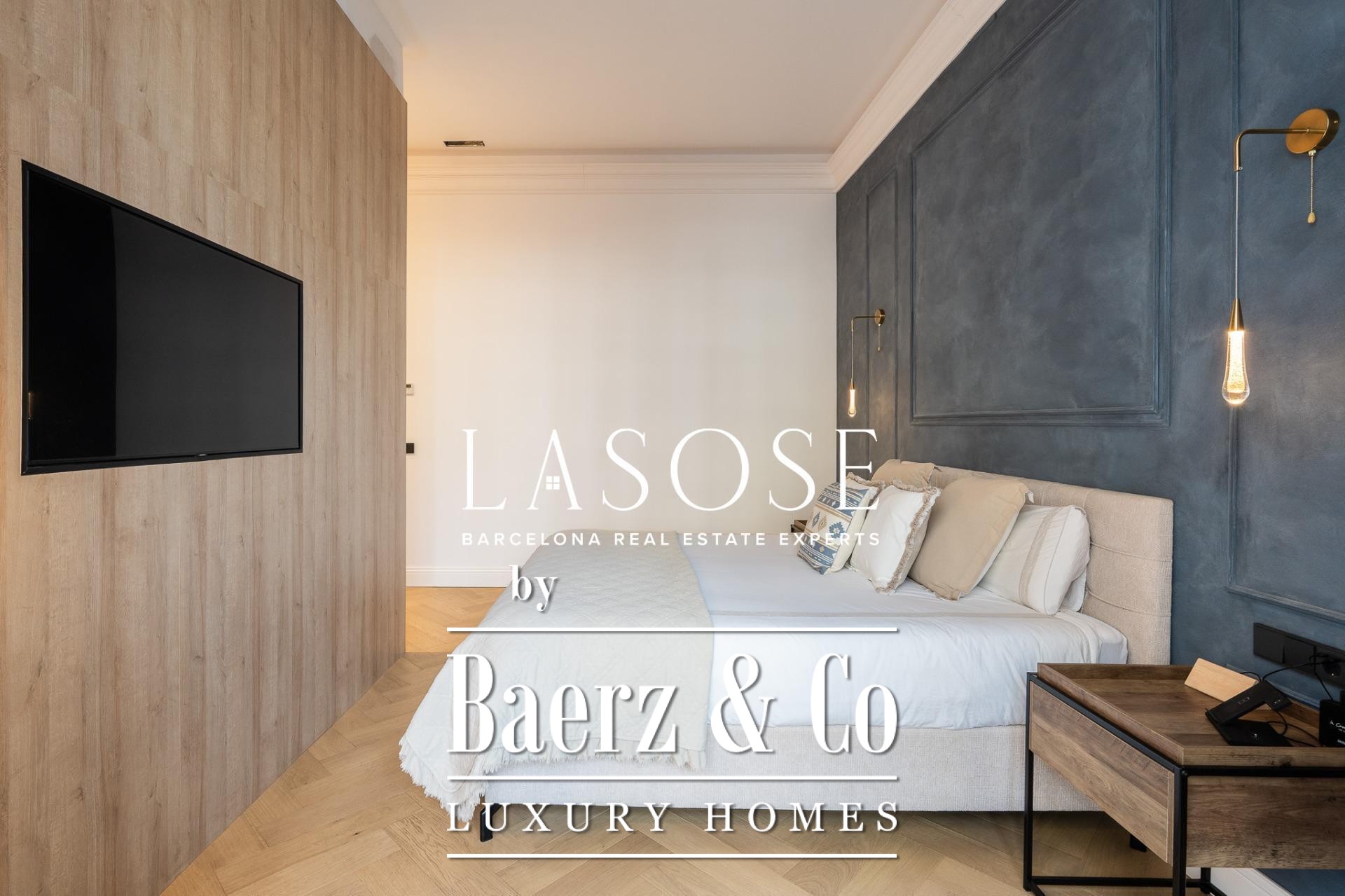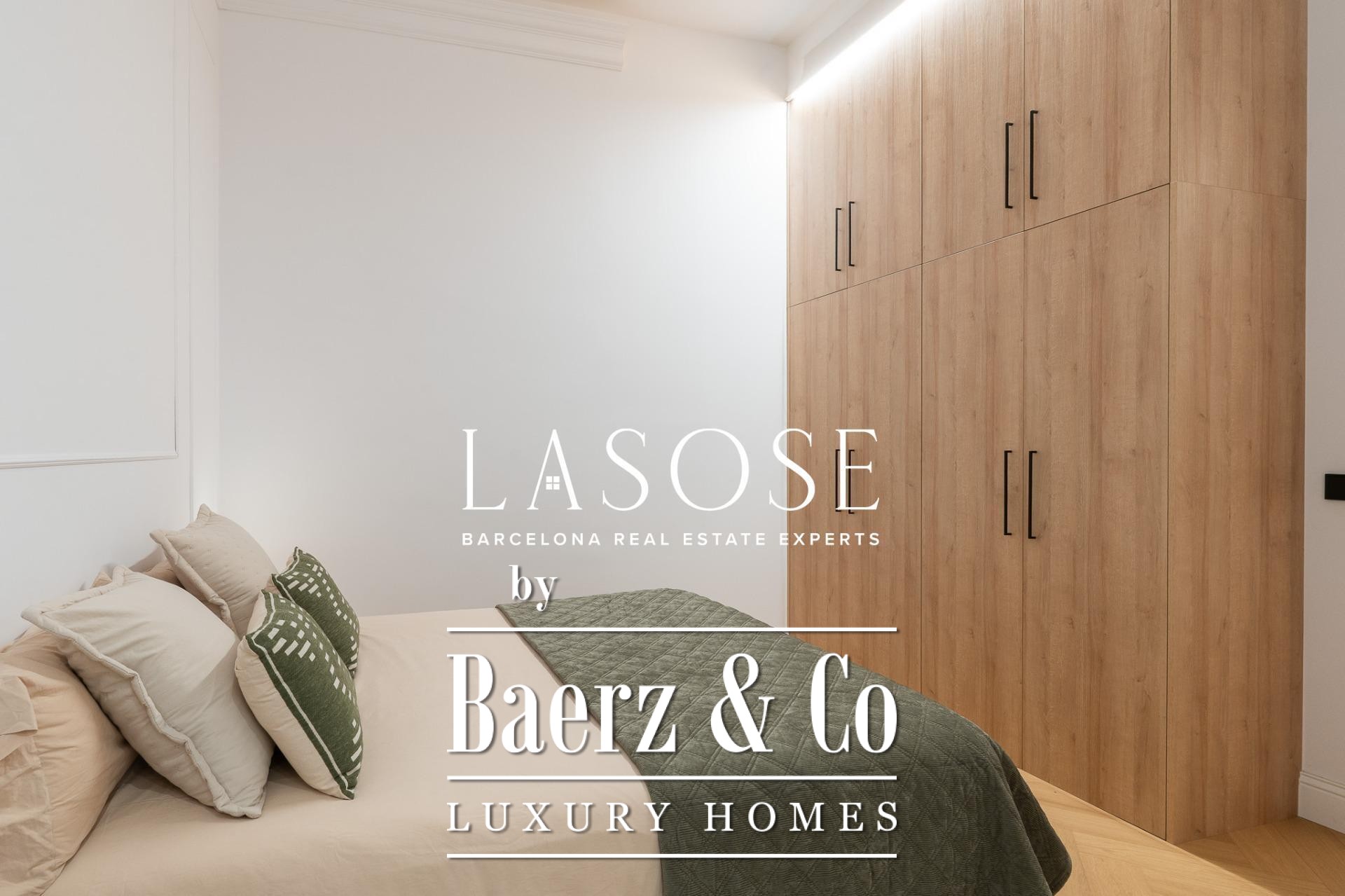 Der Grundriss des Apartments umfasst einen großzügigen, unabhängigen Wohn- und Essbereich mit hohen Decken, drei Schlafzimmer—darunter eine elegante Suite, ein Doppelzimmer und ein Einzelzimmer—sowie zwei voll ausgestattete Bäder. Die Küche ist modern gestaltet, komplett ausgestattet und setzt edle Materialien ein, was ein nahtloses Zusammenspiel von Moderne und Tradition ermöglicht. Ein Balkon von etwa 4,61 Quadratmetern spendet viel Licht, bietet Ausblick auf die Stadt und verbindet mit der Atmosphäre der Carrer de Casp.
