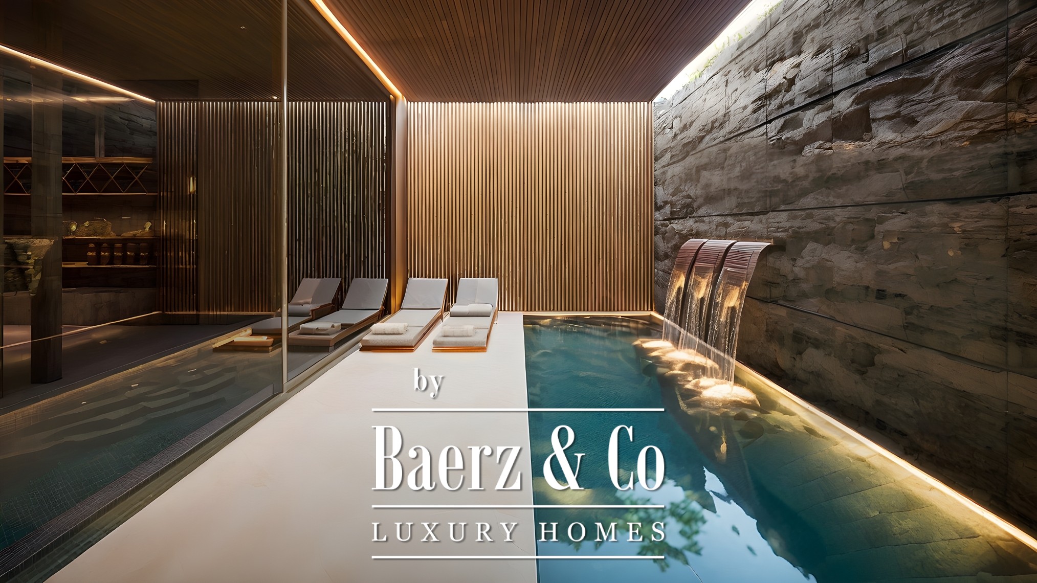 The main floor opens onto the garden through a large living-dining room with an integrated designer kitchen, fully equipped and connected to the outside area. Large full-height windows allow a perfect fusion between interior and exterior, giving way to the covered porch, the private pool and the chill-out area. On this level there is also a guest bedroom with its own bathroom and a guest toilet.