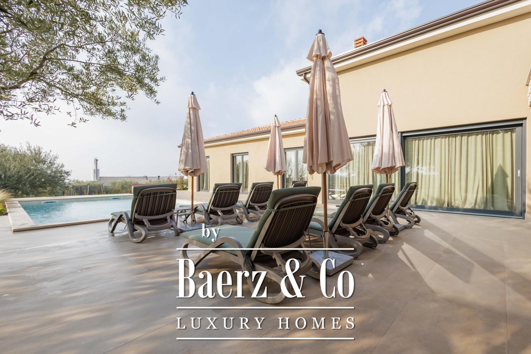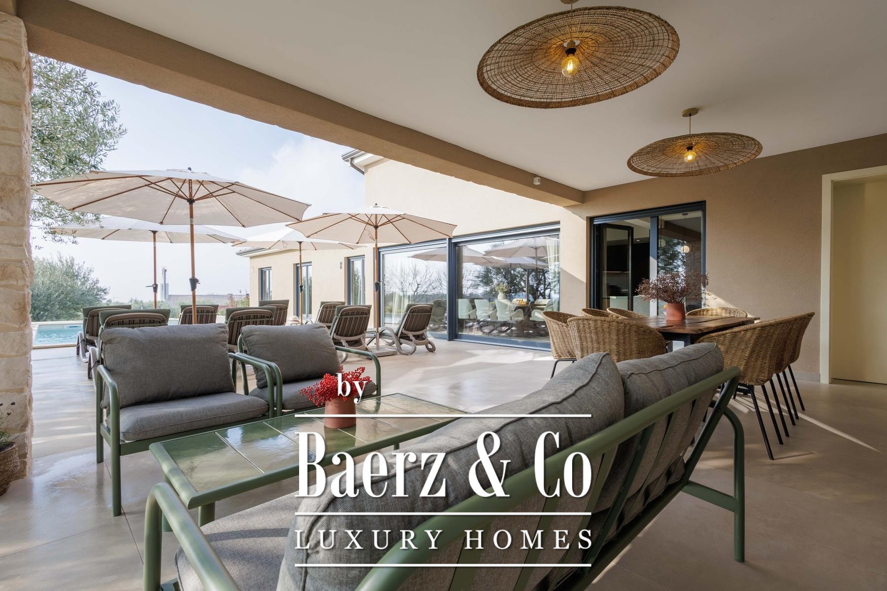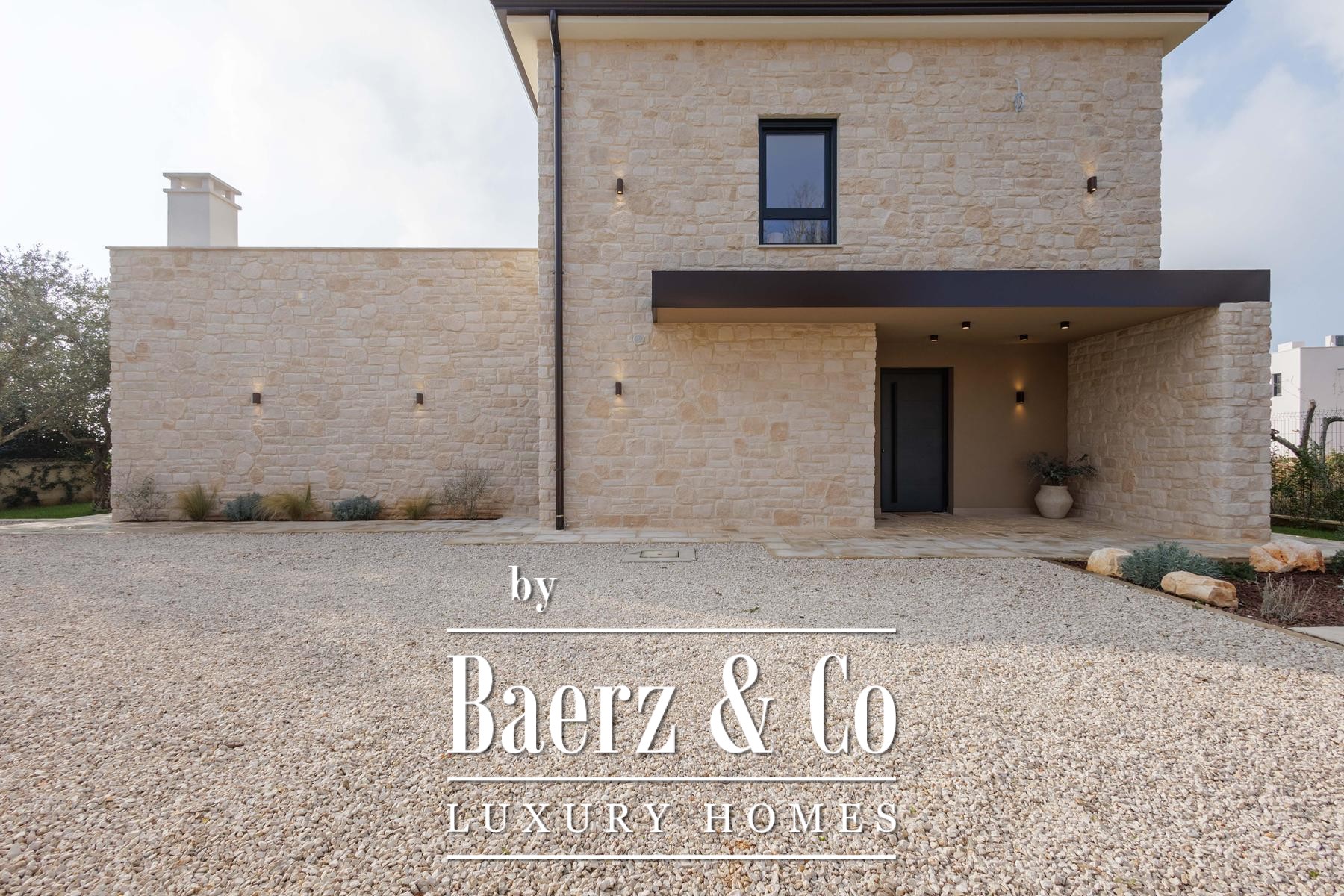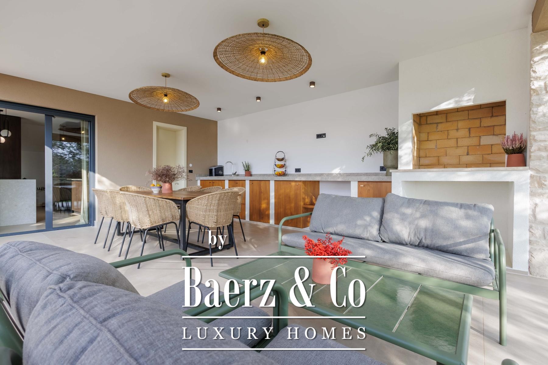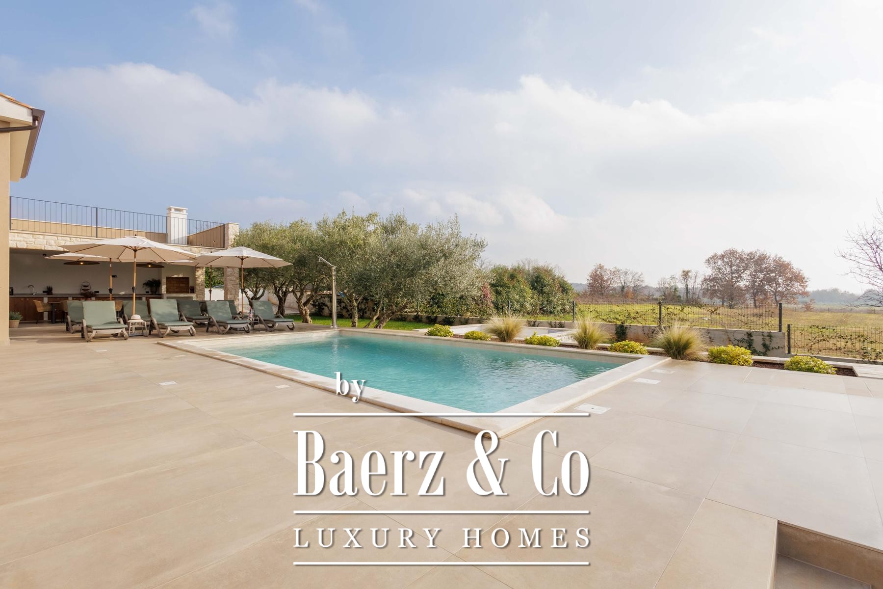 For sale is a modern newly built villa in authentic Istrian style, located in the peaceful area of Kaštelir - Labinci, one of the most desirable parts of western Istria. This exceptional property perfectly combines traditional Istrian charm with contemporary design and top-class comfort, and is built as a high-standard low-energy home.The villa is spread over two floors and features four spacious bedrooms, each with its own en-suite bathroom. Three bedrooms are situated on the ground floor, while the master bedroom occupies the first floor, complete with a private bathroom, walk-in wardrobe, and a large terrace offering a spectacular panoramic view of the sea and the surrounding landscape.The property is equipped with underfloor heating powered by a heat pump and air conditioning throughout, ensuring maximum comfort year-round. Underfloor heating is also installed in the outdoor kitchen, emphasizing practicality and thoughtful design. Additionally, there are two separate guest toilets.The outdoor area is designed as a true oasis of relaxation and luxury, featuring a fully equipped summer kitchen, sunbathing area, swimming pool, fire pit, and a space prepared for a jacuzzi. The beautifully landscaped garden includes a lush green lawn and six olive trees, maintained by a fully automated irrigation system.This stunning villa offers the perfect blend of authentic Istrian elegance and modern luxury, representing an ideal opportunity for those seeking a peaceful residence or a premium investment in the luxury tourism segment of western Istria.