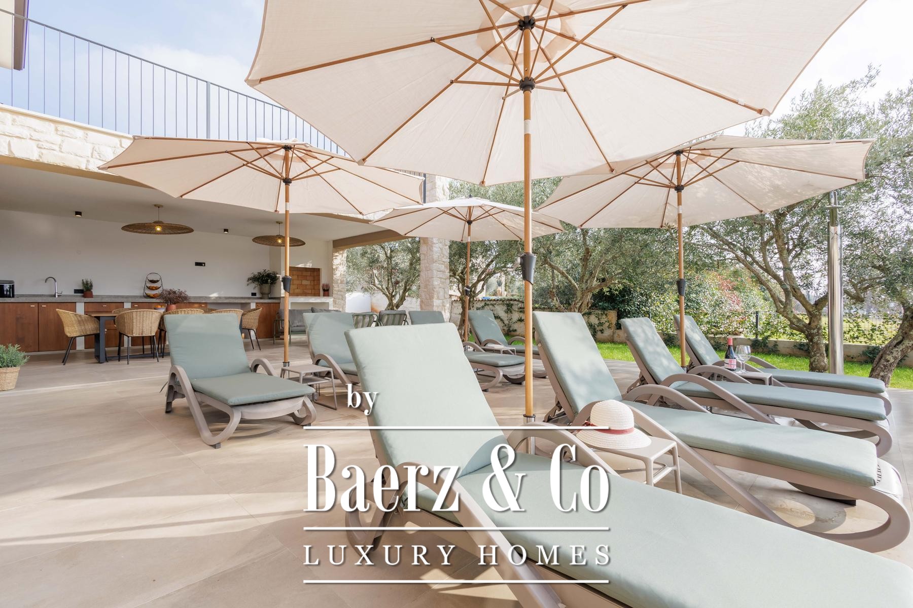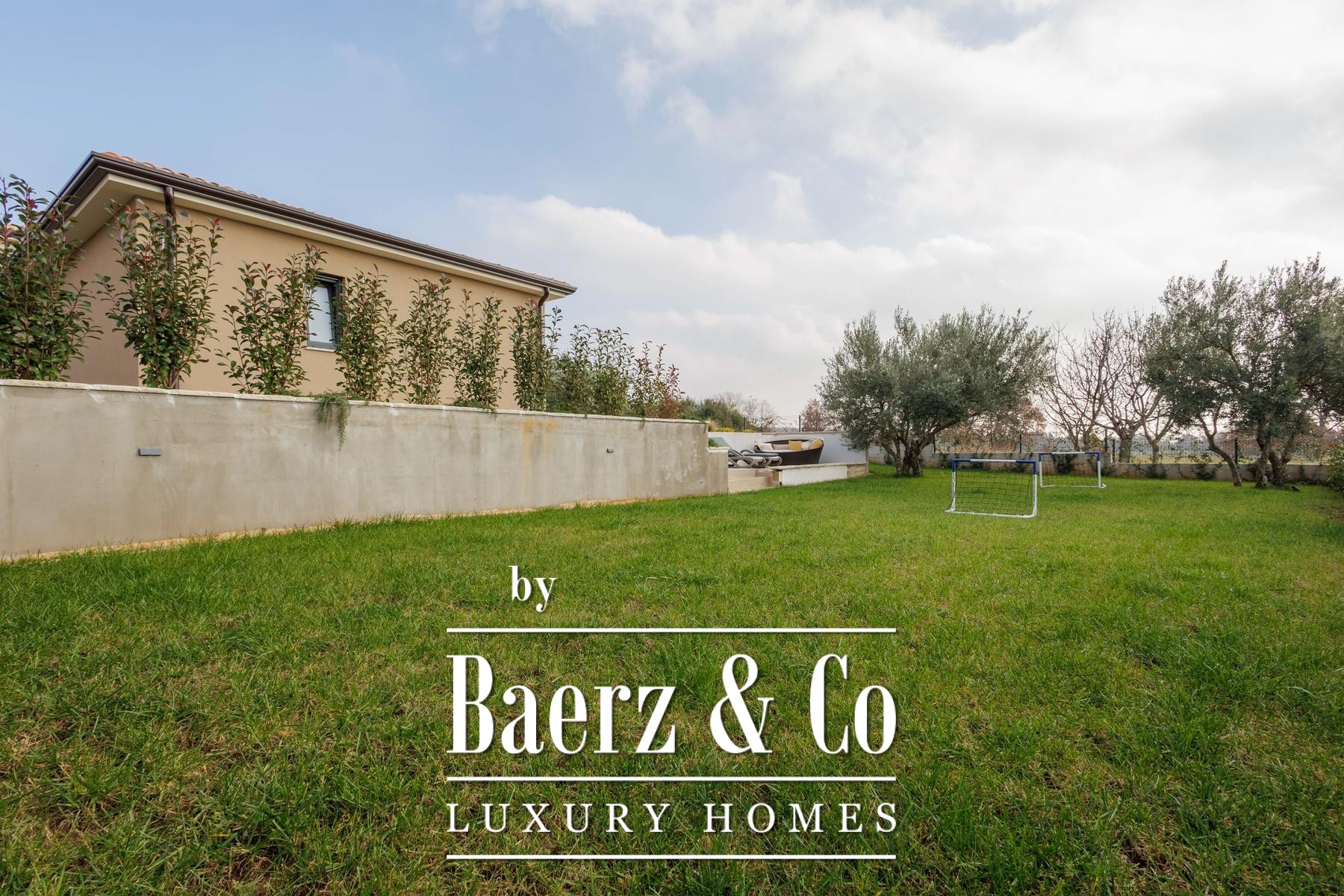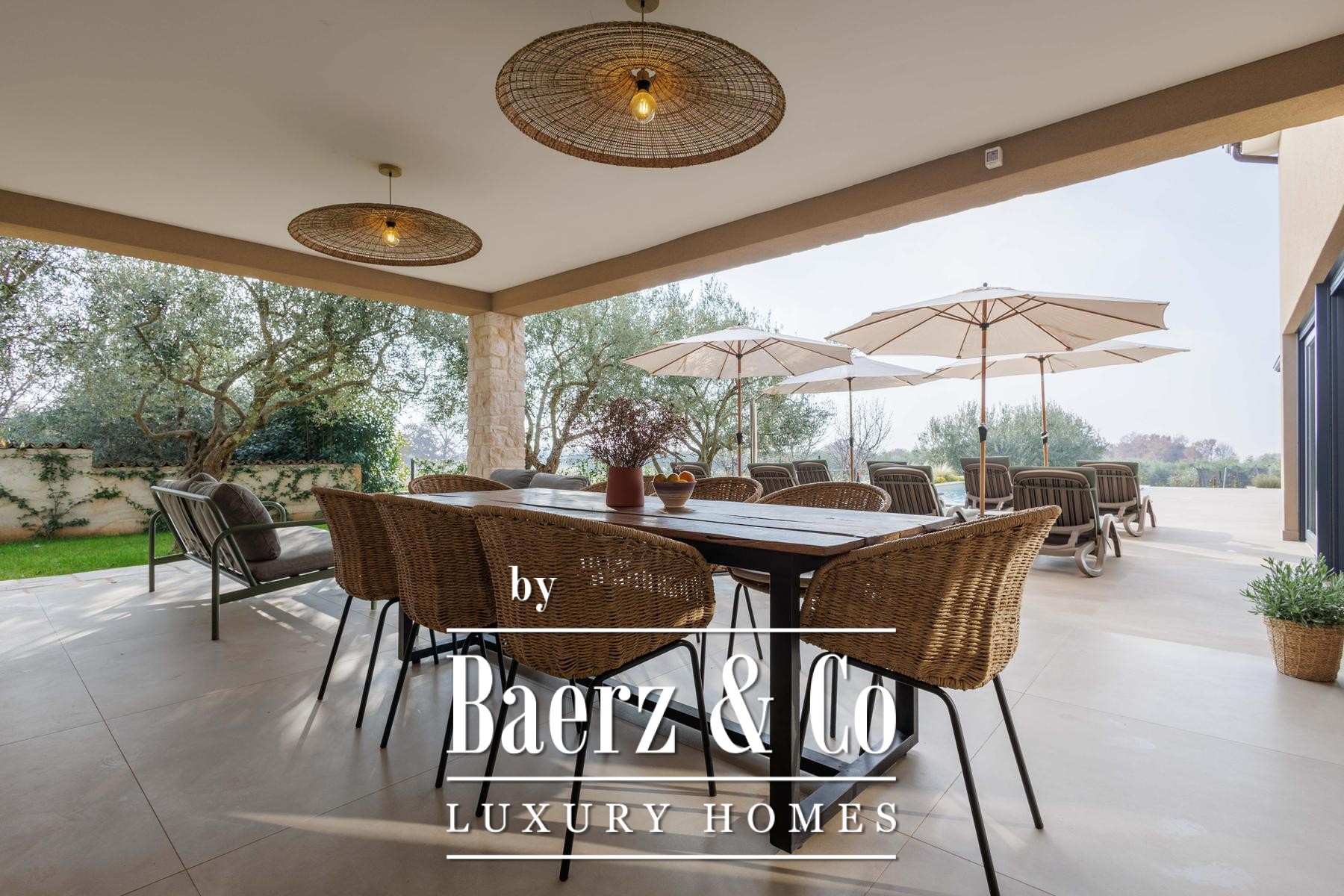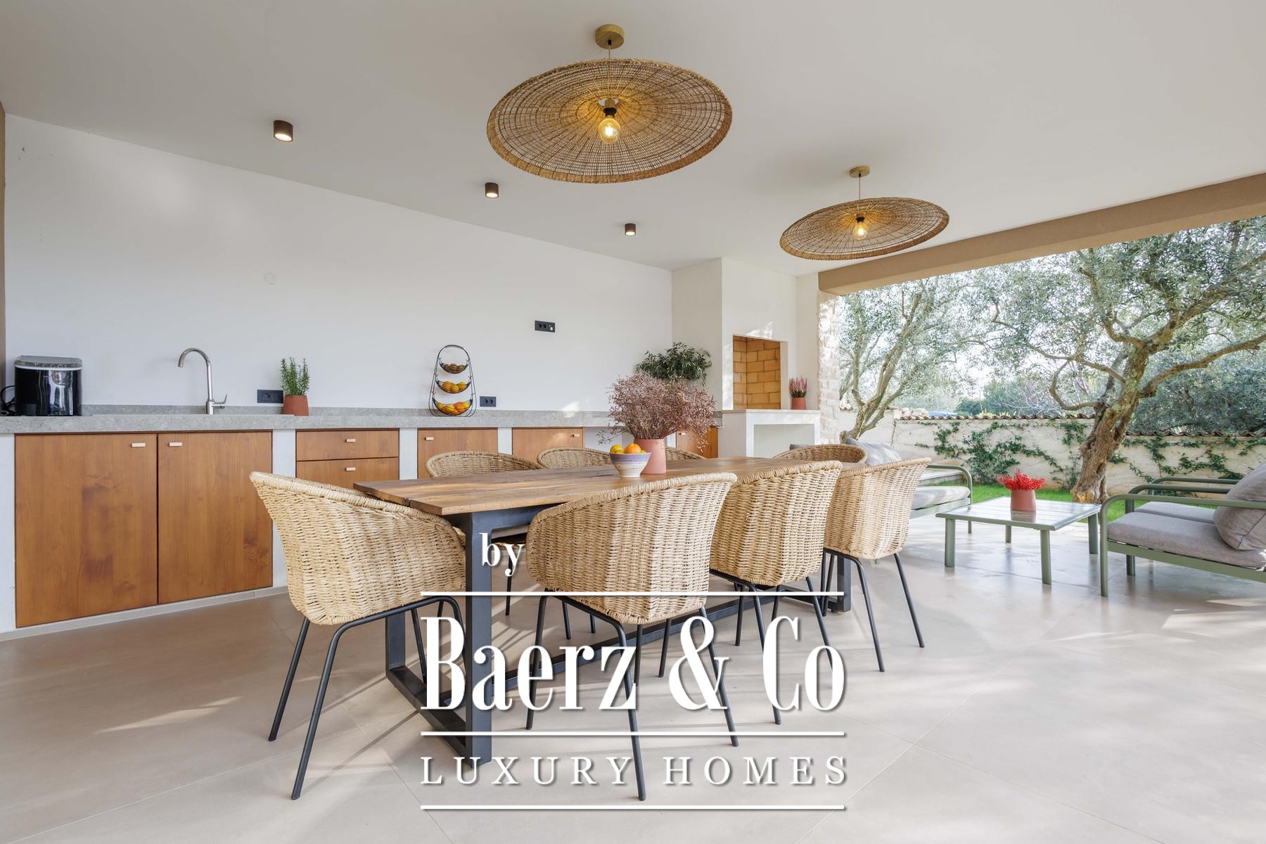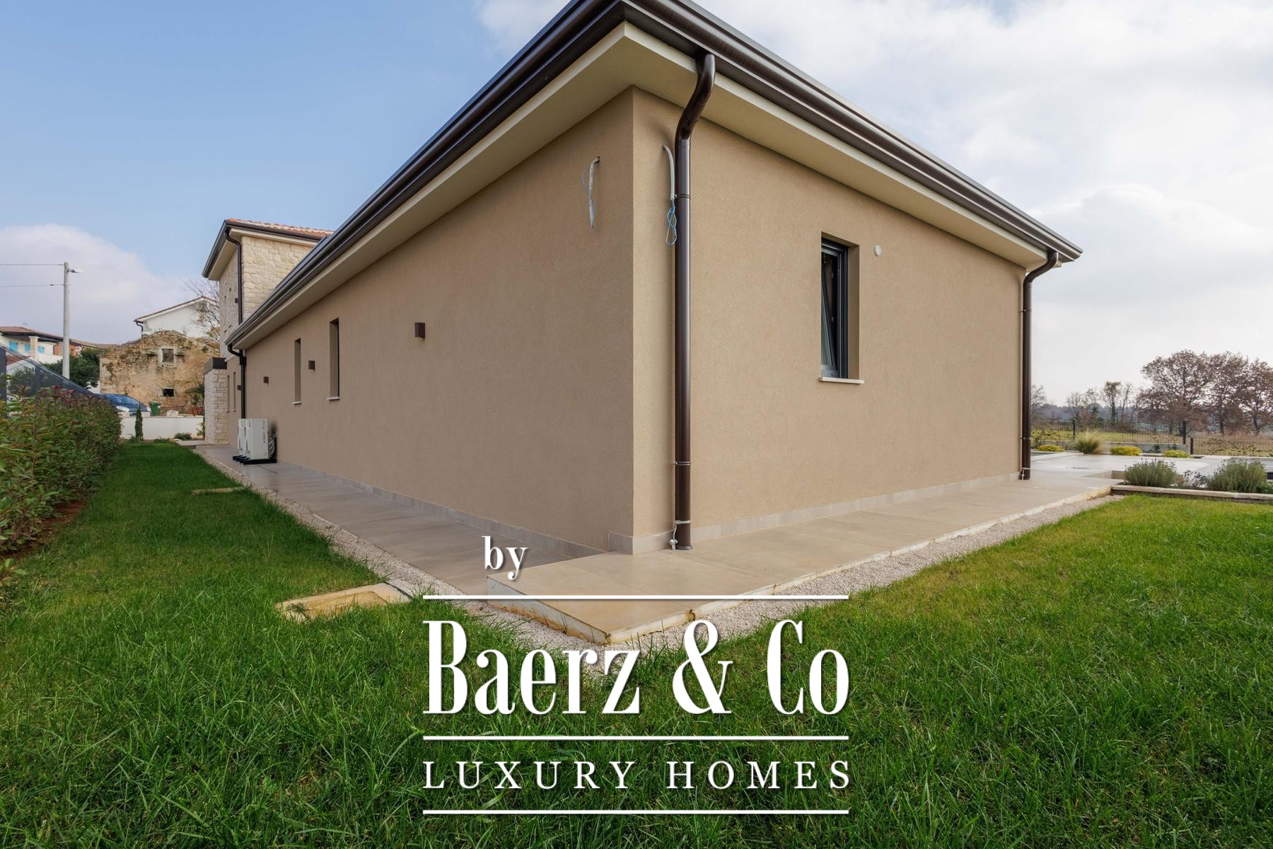 For sale is a modern newly built villa in authentic Istrian style, located in the peaceful area of Kaštelir - Labinci, one of the most desirable parts of western Istria. This exceptional property perfectly combines traditional Istrian charm with contemporary design and top-class comfort, and is built as a high-standard low-energy home.The villa is spread over two floors and features four spacious bedrooms, each with its own en-suite bathroom. Three bedrooms are situated on the ground floor, while the master bedroom occupies the first floor, complete with a private bathroom, walk-in wardrobe, and a large terrace offering a spectacular panoramic view of the sea and the surrounding landscape.The property is equipped with underfloor heating powered by a heat pump and air conditioning throughout, ensuring maximum comfort year-round. Underfloor heating is also installed in the outdoor kitchen, emphasizing practicality and thoughtful design. Additionally, there are two separate guest toilets.The outdoor area is designed as a true oasis of relaxation and luxury, featuring a fully equipped summer kitchen, sunbathing area, swimming pool, fire pit, and a space prepared for a jacuzzi. The beautifully landscaped garden includes a lush green lawn and six olive trees, maintained by a fully automated irrigation system.This stunning villa offers the perfect blend of authentic Istrian elegance and modern luxury, representing an ideal opportunity for those seeking a peaceful residence or a premium investment in the luxury tourism segment of western Istria.