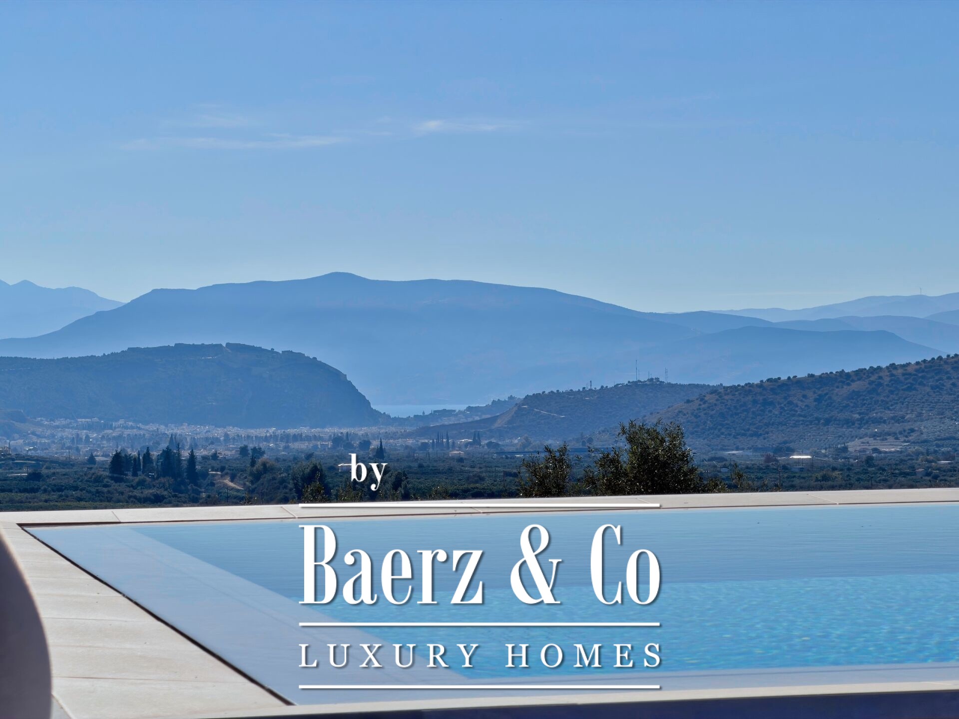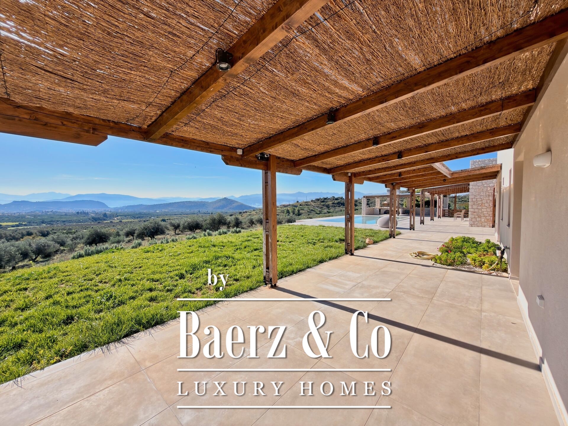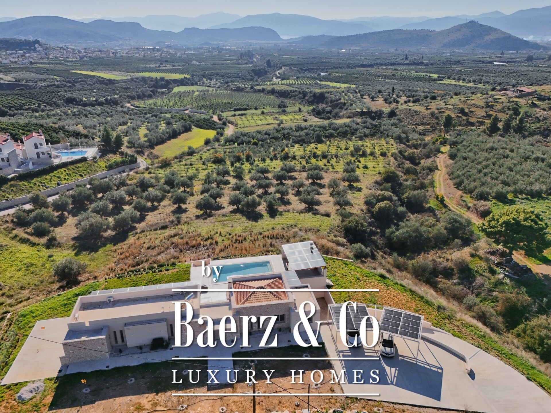 Die Luxusvilla Nafplio bietet eine seltene Gelegenheit, in einer modernen Residenz in einer der ruhigsten und landschaftlich eindrucksvollsten Gegenden Griechenlands zu wohnen. Dieses 232 m² große Erdgeschosshaus befindet sich auf einem 5.255 m² großen Grundstück, dessen Panoramablick über Nafplio und die Westausrichtung das natürliche Licht tief in jeden Raum lenken. So entsteht ein offenes Wohngefühl, das sich harmonisch in die umgebende Landschaft einfügt.