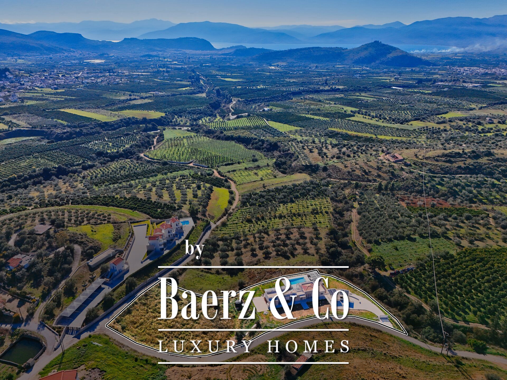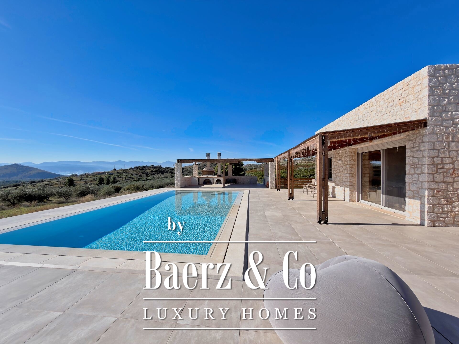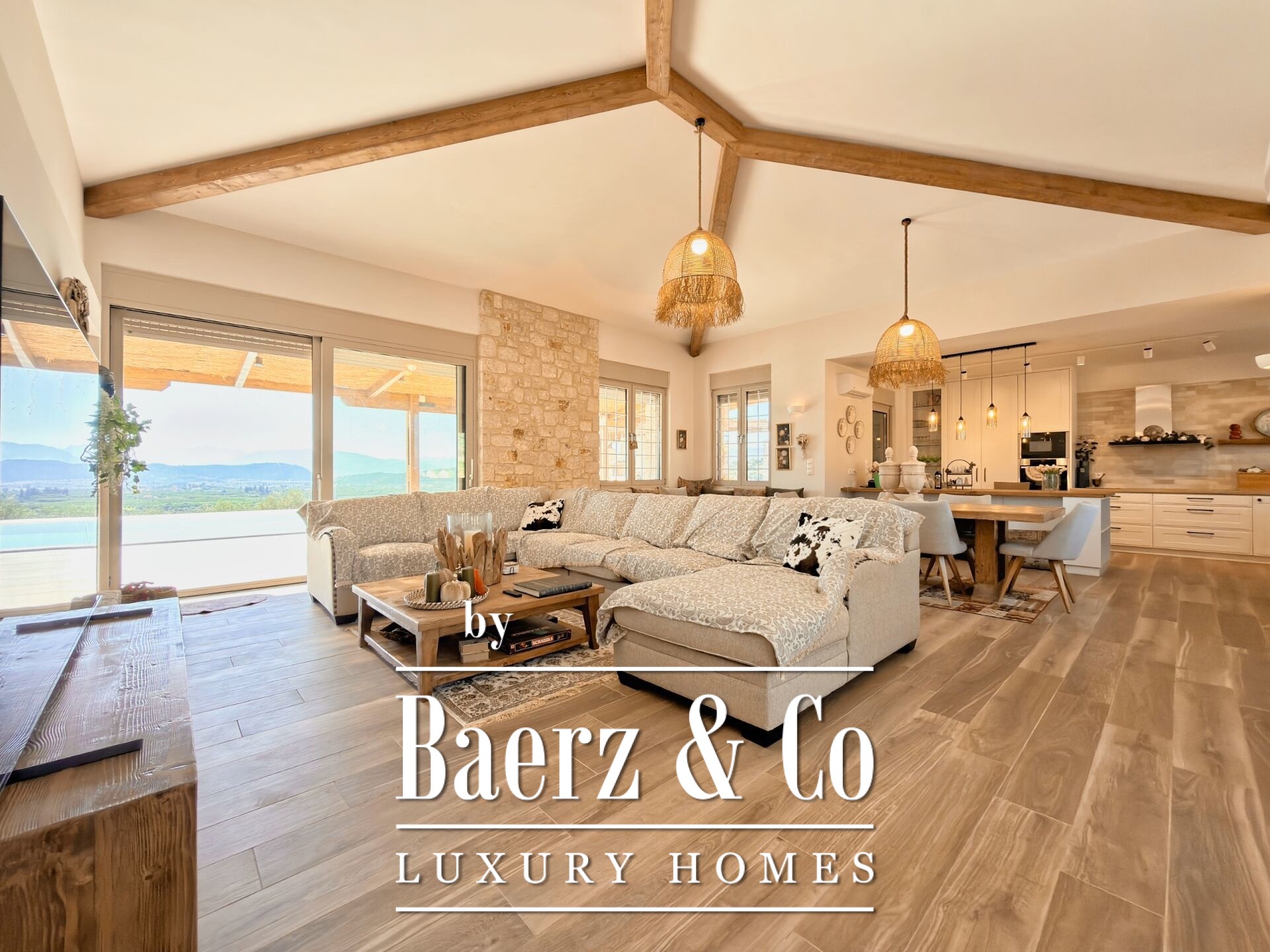 Die Luxusvilla Nafplio bietet eine seltene Gelegenheit, in einer modernen Residenz in einer der ruhigsten und landschaftlich eindrucksvollsten Gegenden Griechenlands zu wohnen. Dieses 232 m² große Erdgeschosshaus befindet sich auf einem 5.255 m² großen Grundstück, dessen Panoramablick über Nafplio und die Westausrichtung das natürliche Licht tief in jeden Raum lenken. So entsteht ein offenes Wohngefühl, das sich harmonisch in die umgebende Landschaft einfügt.