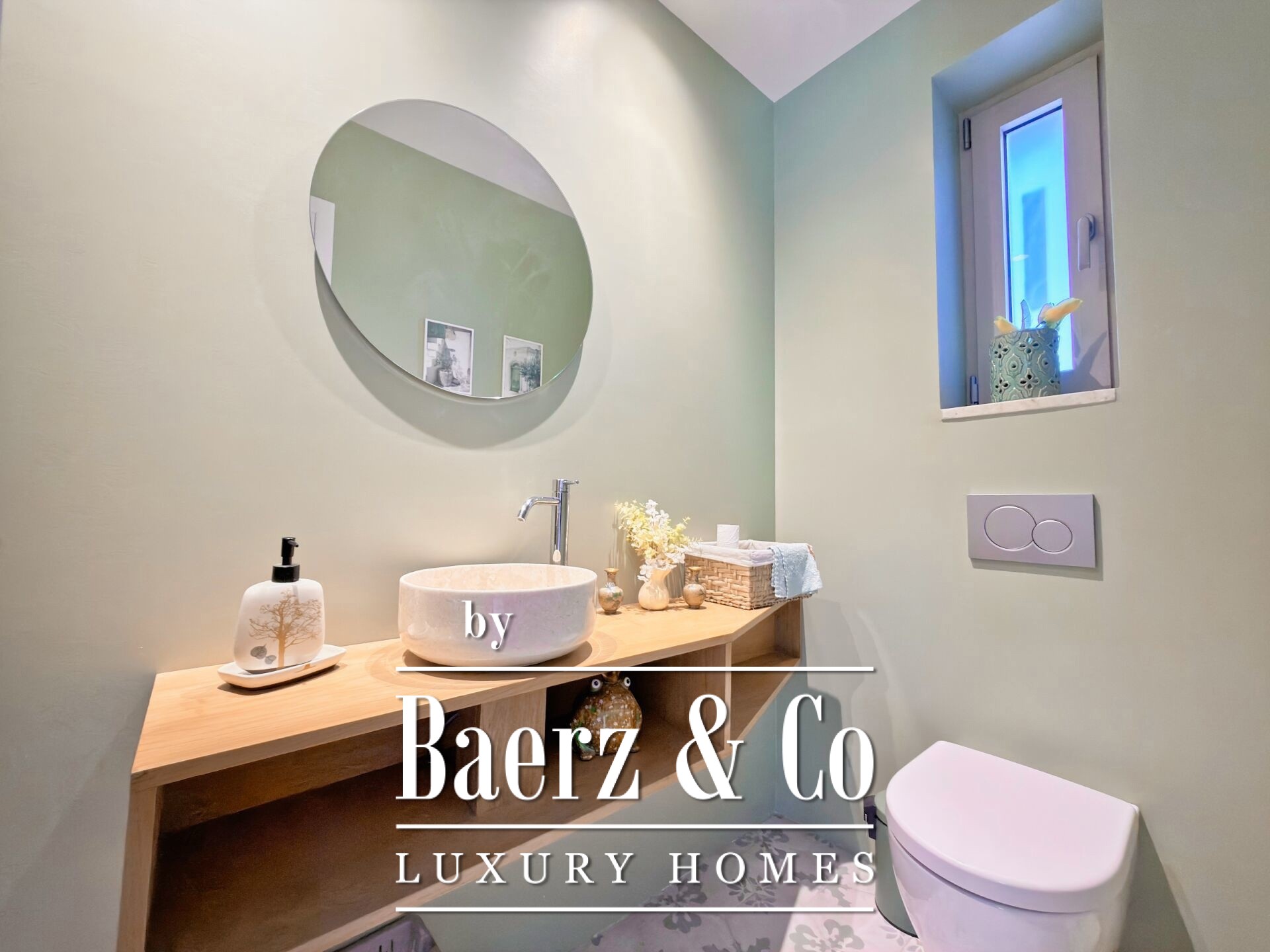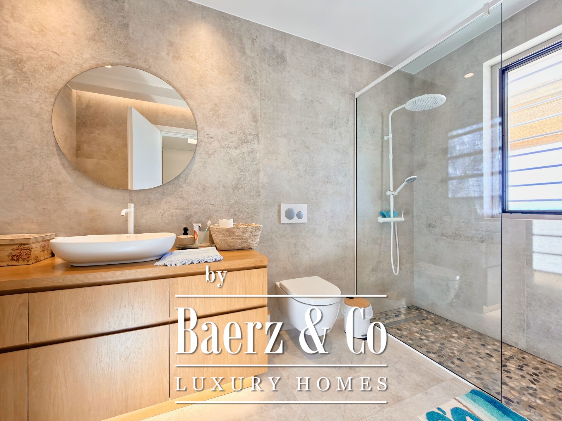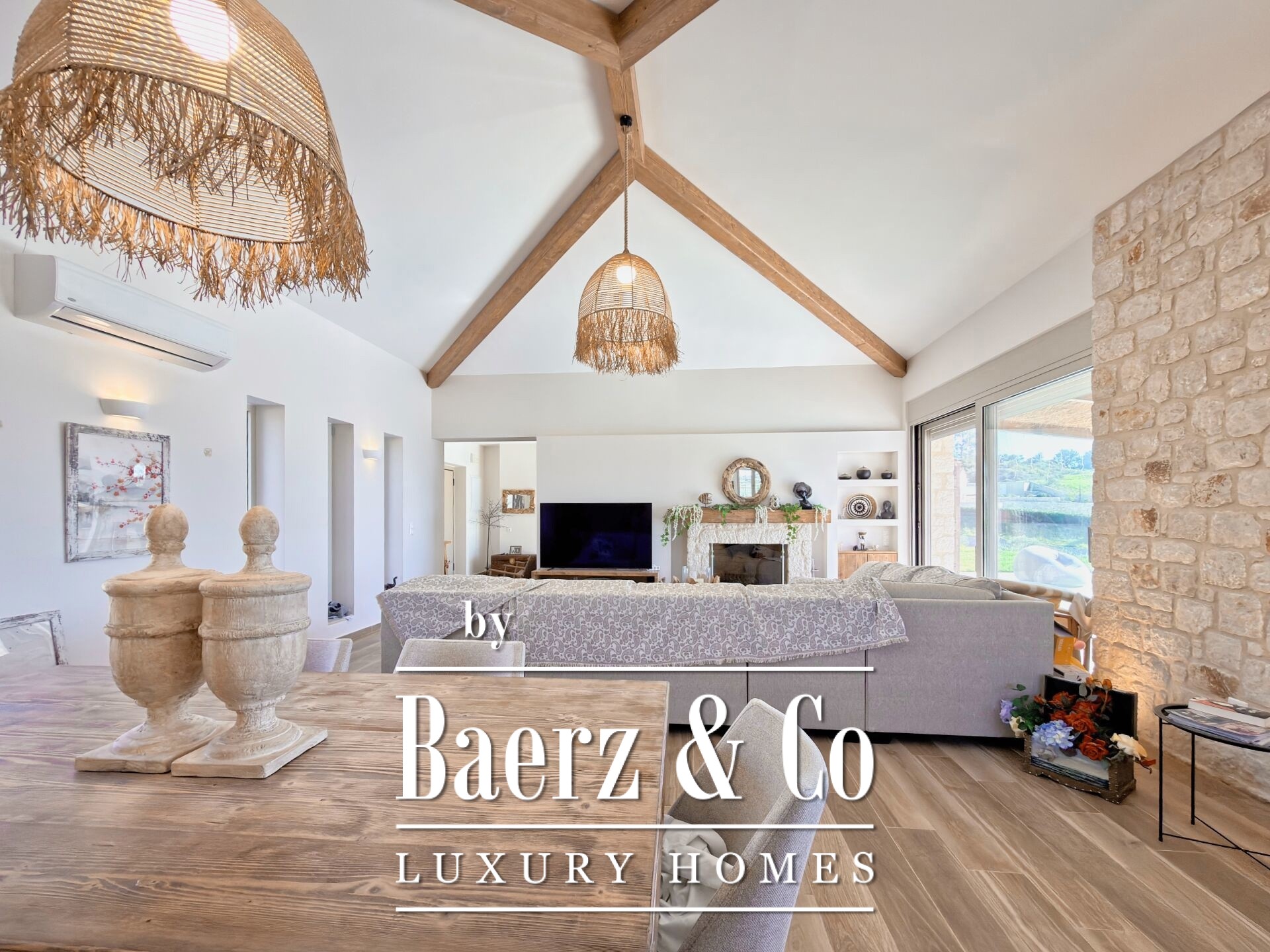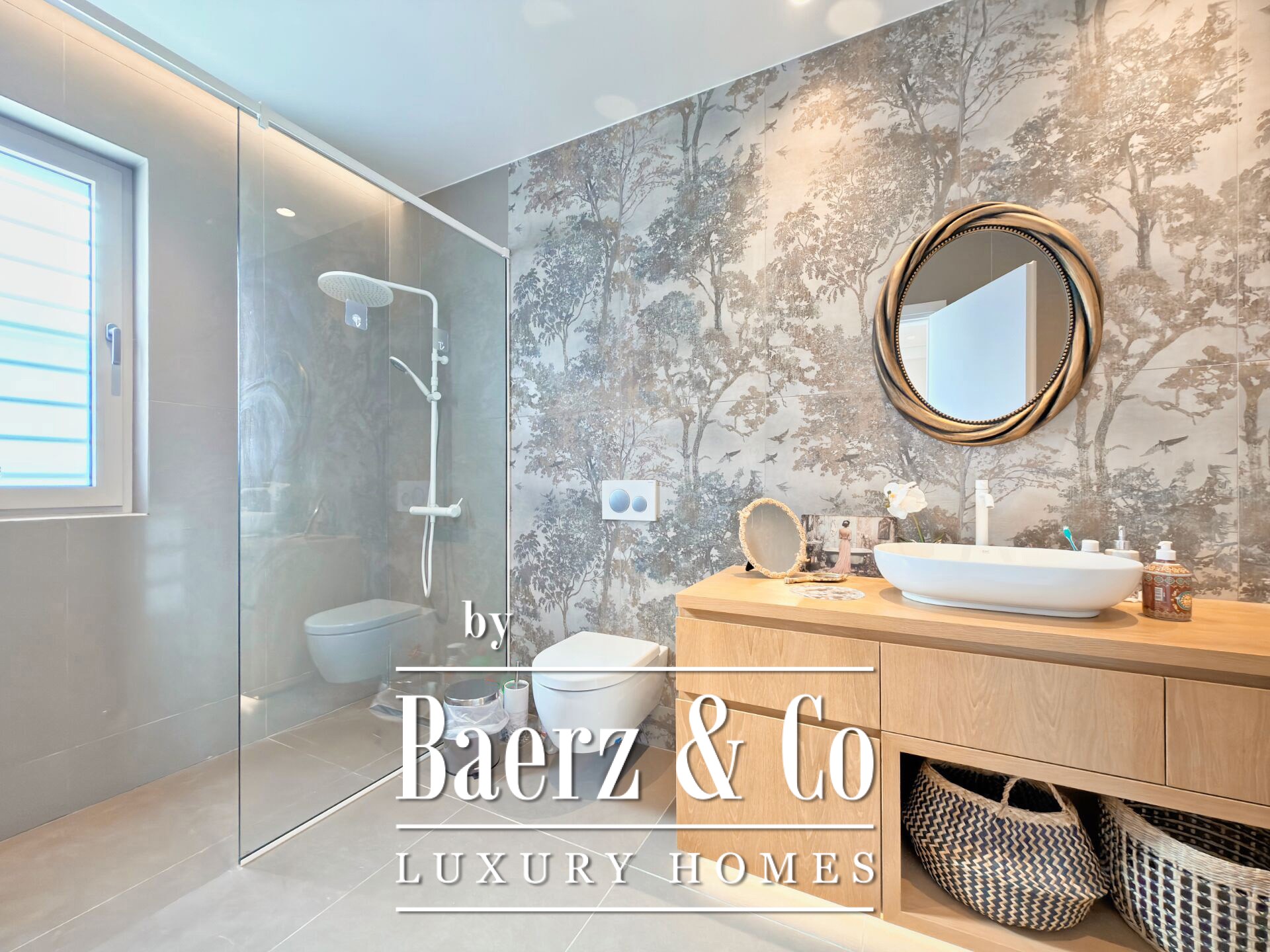 Im Außenbereich besticht der geschmackvoll zurückhaltende Innenhof durch einen 50 m² großen Pool und einen großzügigen BBQ-Bereich unter Eichenpergolen. Der unverbaute Blick auf Berge, Meer und die Natur löst die Grenzen zwischen Innen- und Außenbereich auf harmonische Weise auf. Im 47 m² großen Keller finden sich Parkmöglichkeiten und Stauraum, während eine Photovoltaikanlage die Eigenständigkeit zusätzlich unterstützt. Diese Villa bietet die Ruhe eines Landgutes und die Behaglichkeit eines durchdacht konzipierten Zuhauses – ideal für alle Jahreszeiten.