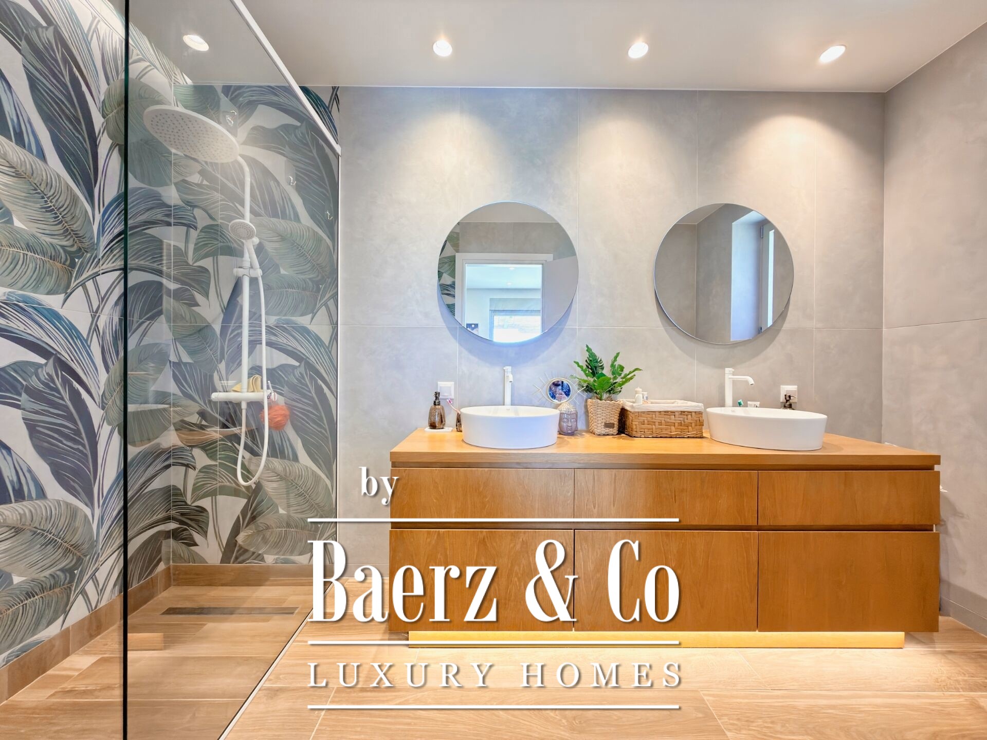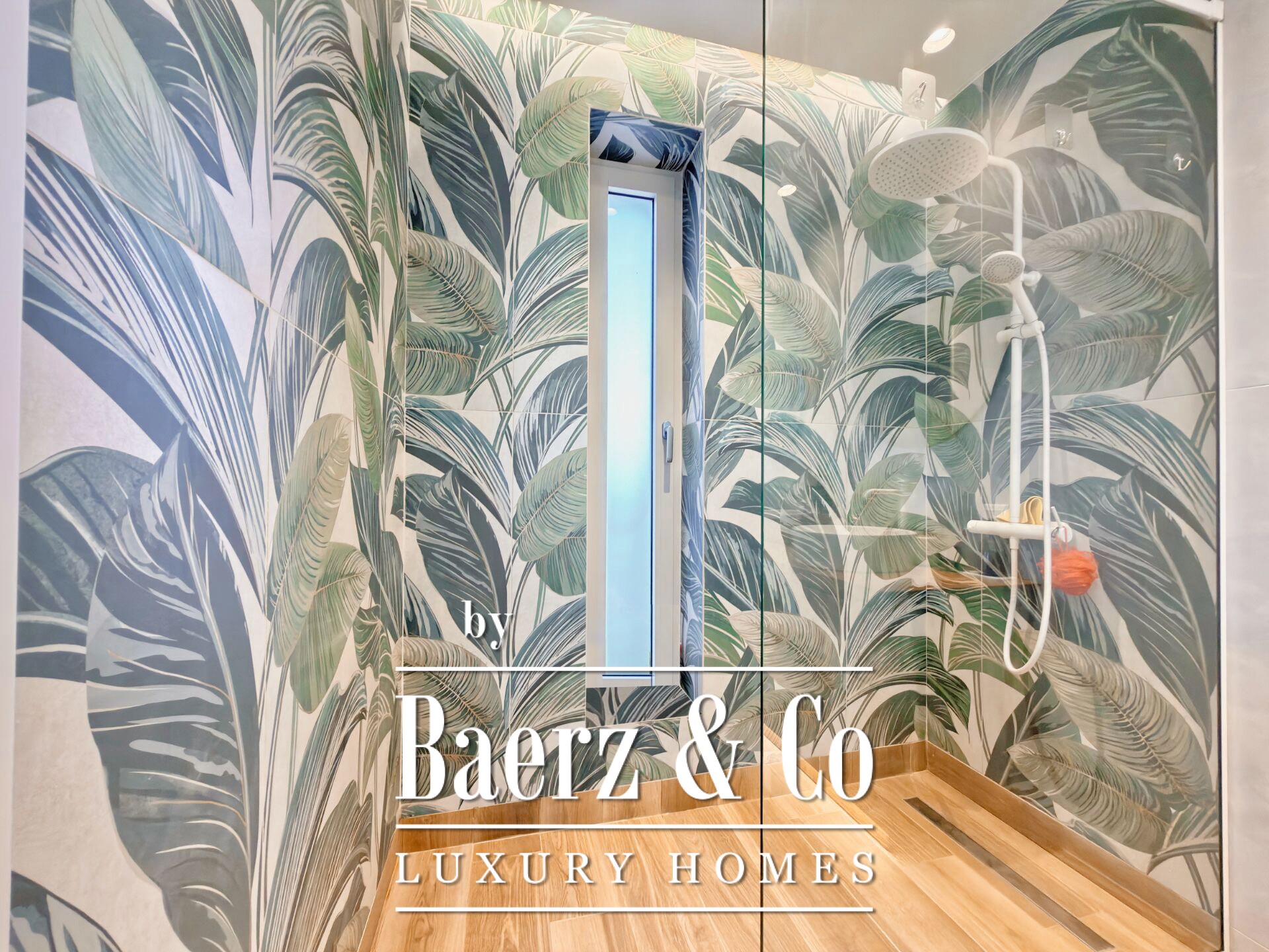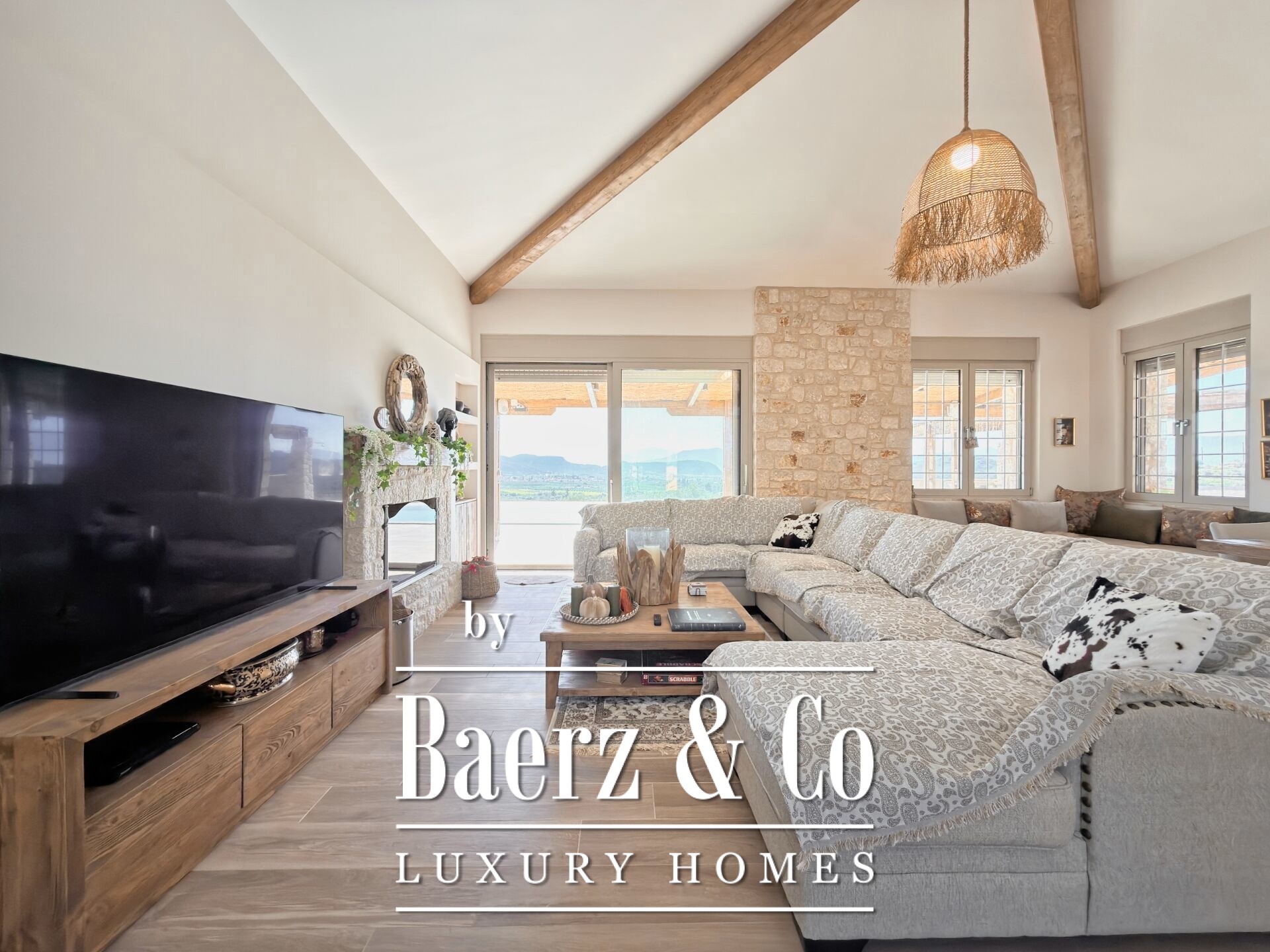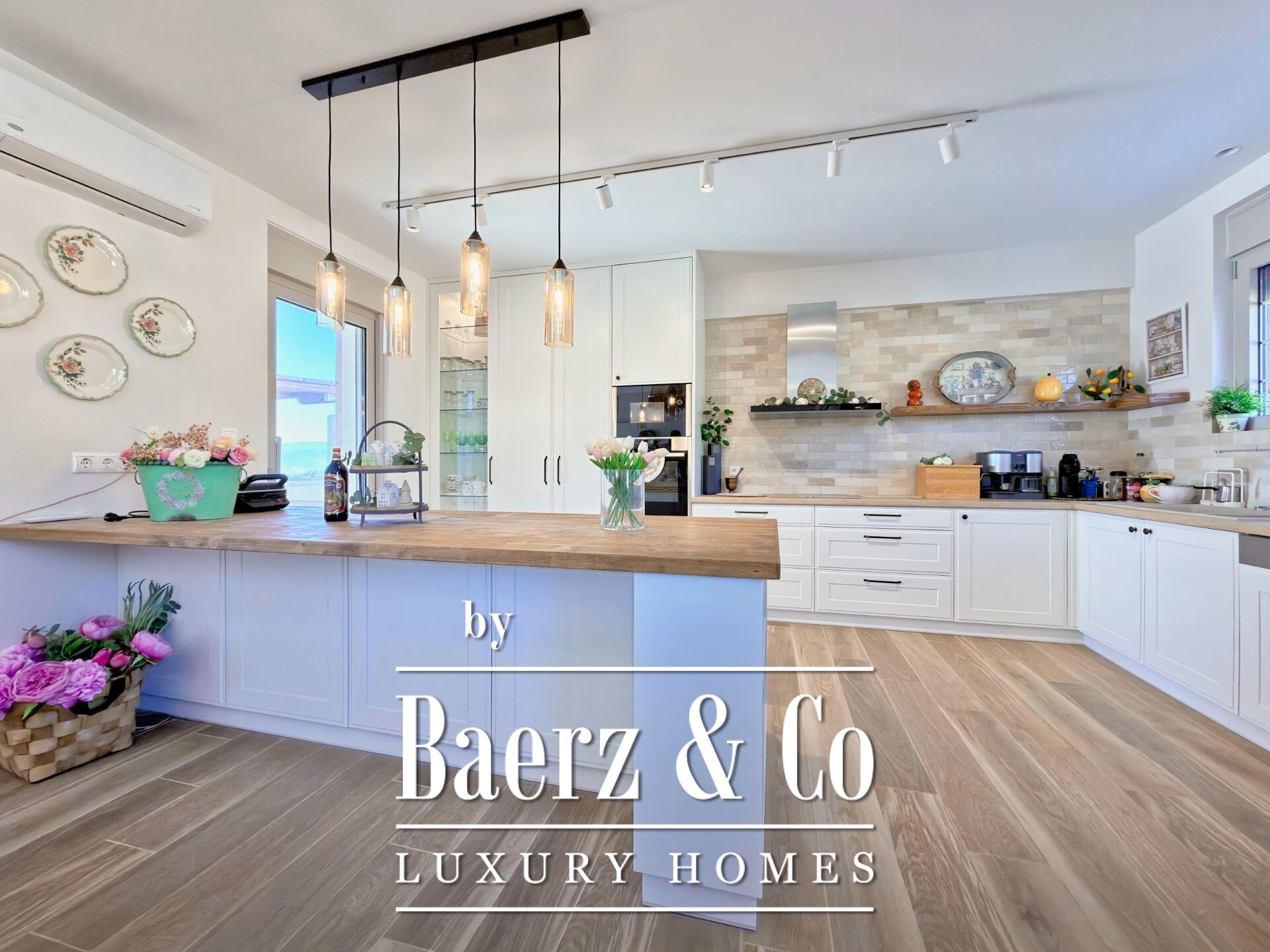 Beim Betreten des Hauses empfängt Sie ein großzügiger Wohnbereich, der sich um einen Kamin aus Naturstein gruppiert, dessen authentische Steinverarbeitung sich von innen nach außen fortsetzt. Die offene Küche ist nahtlos in den Wohnbereich integriert und vereint Komfort mit funktionaler Klarheit. Drei großzügige Master-Schlafzimmer und drei elegante Bäder, ergänzt durch ein zusätzliches Gäste-WC, bieten sowohl im Alltag als auch beim Empfang von Gästen Privatsphäre und Komfort. Hochwertige, doppelt verglaste Energiesparfenster, fortschrittliche Dämmung und Sicherheitsfunktionen sorgen für Ruhe und ein beruhigendes Gefühl.