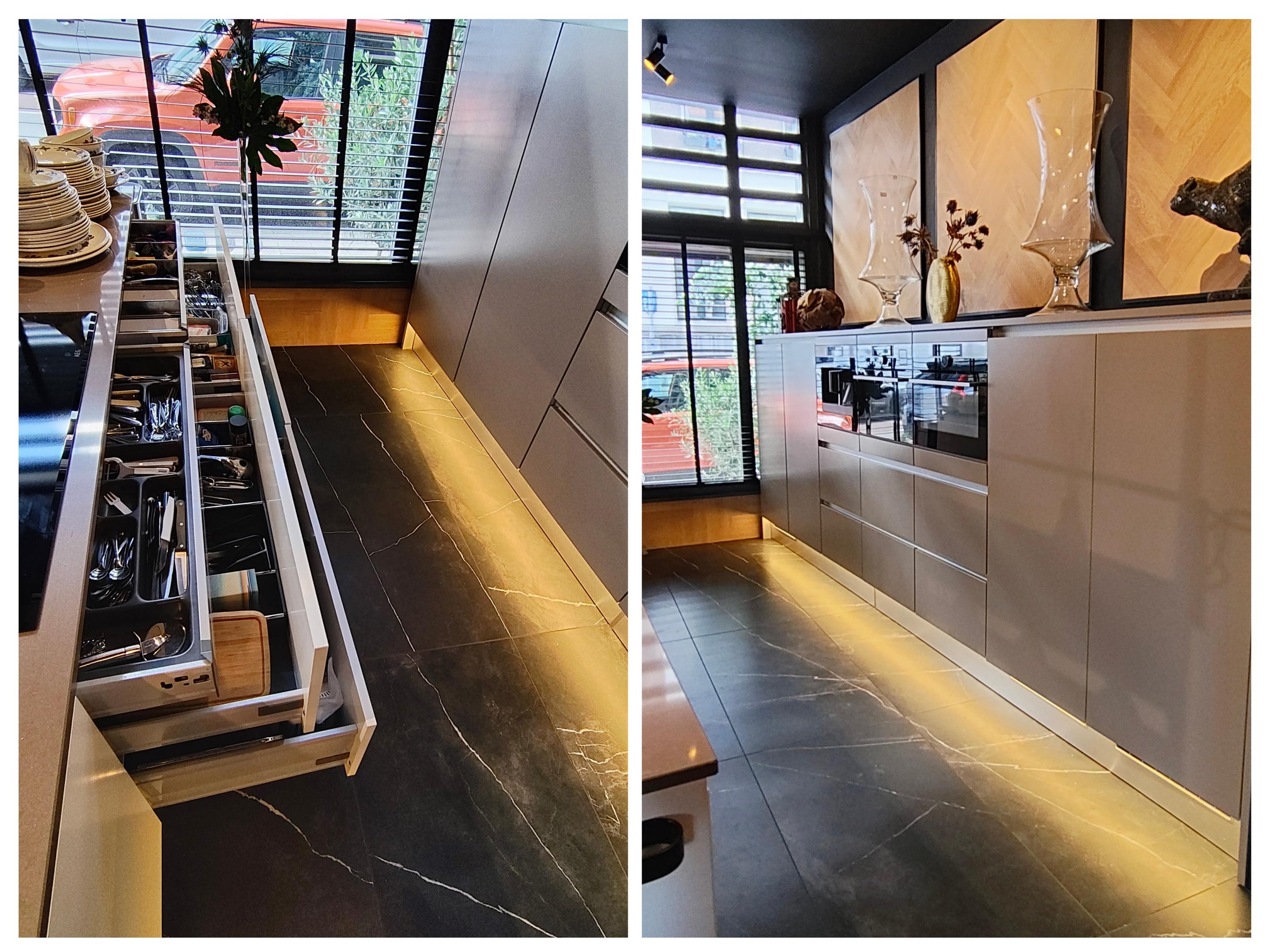 The spacious entrance hall leads into an impressive open-plan kitchen with an island of over four meters long and a wall of appliances that will delight even the most demanding culinary enthusiast. Double ovens, refrigerators, dishwashers, a built-in coffee machine, and Quooker make this kitchen the vibrant heart of the home.