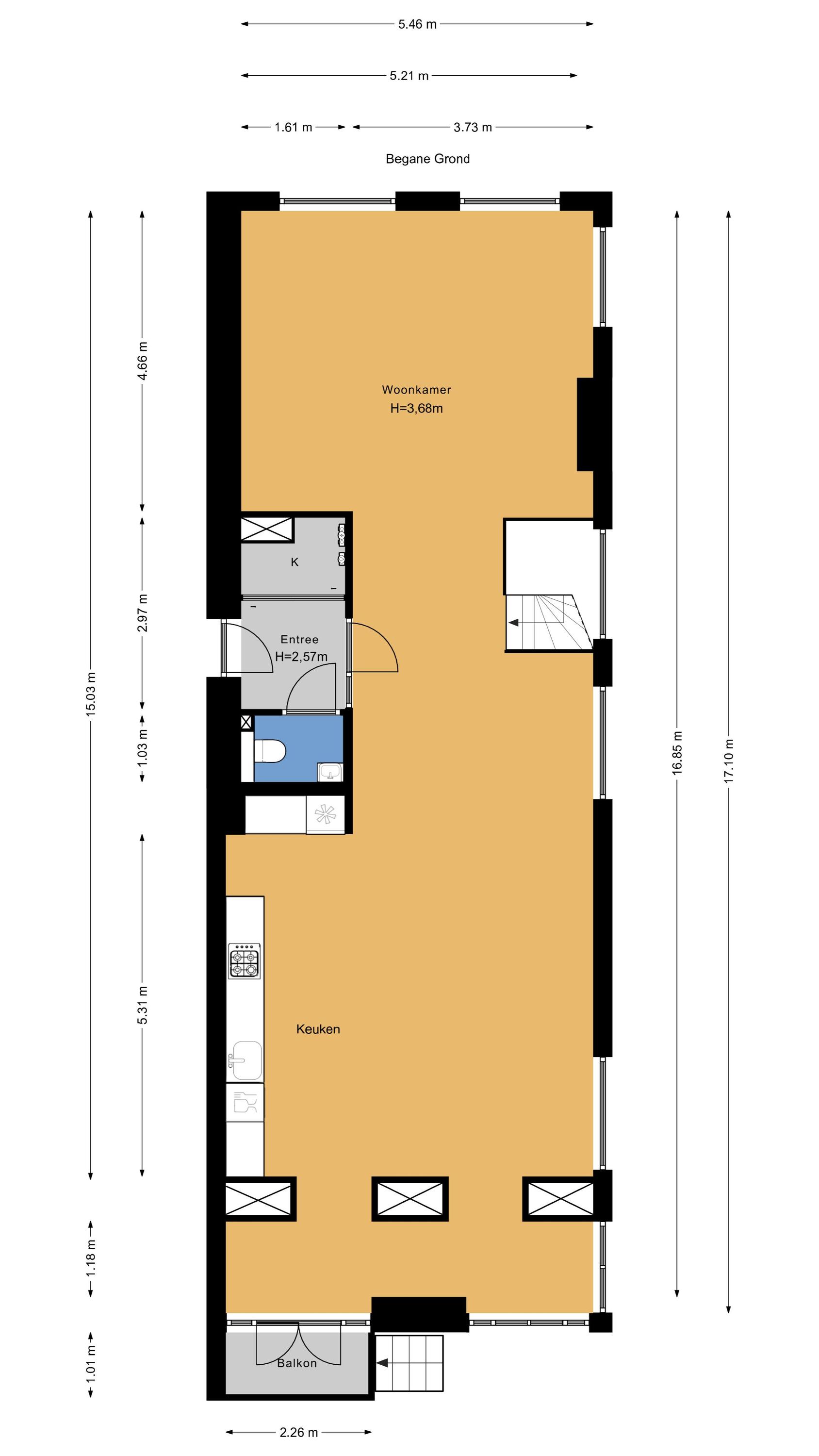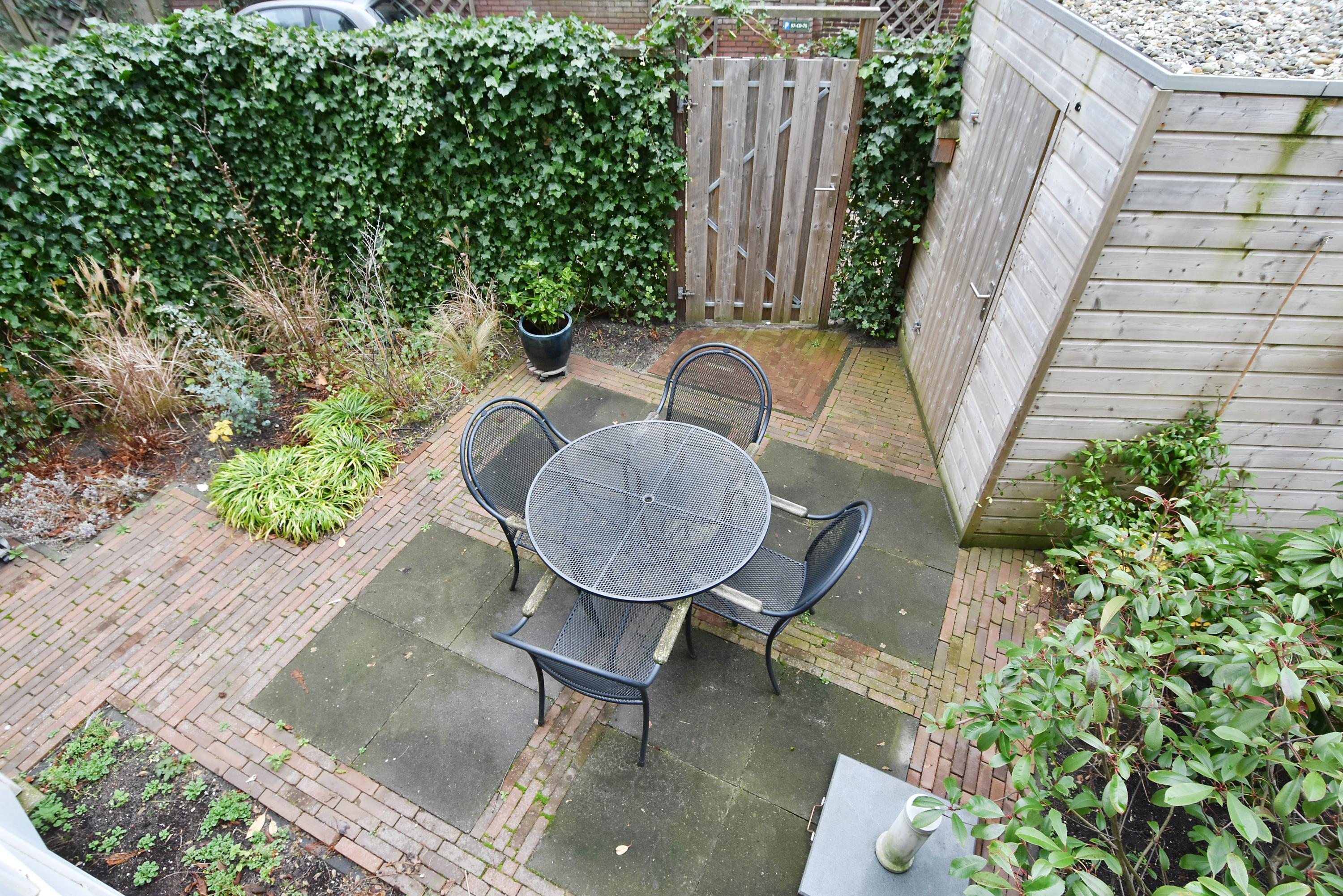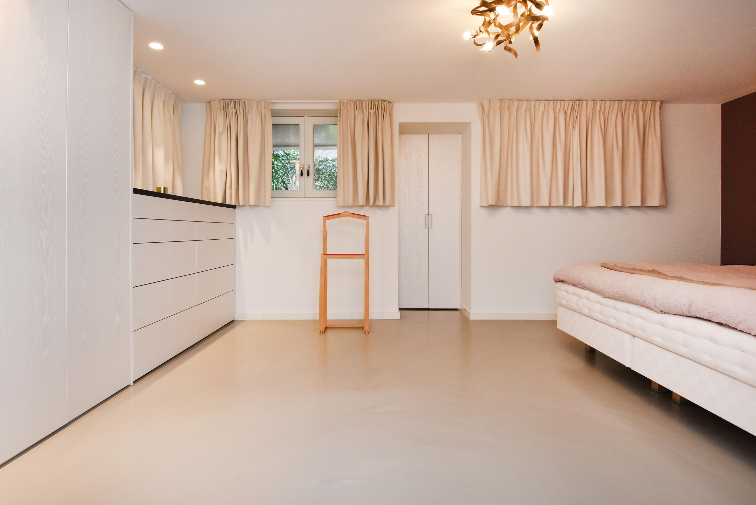 The elevated ground floor hosts the inviting living and dining space, marked by an oak herringbone parquet with underfloor heating and ceilings close to four metres. An open-plan kitchen is equipped with integrated appliances, including an induction cooktop, Quooker, and design lighting. The flow leads out to a balcony and sunlit south-facing garden with storeroom and private exterior entrance.