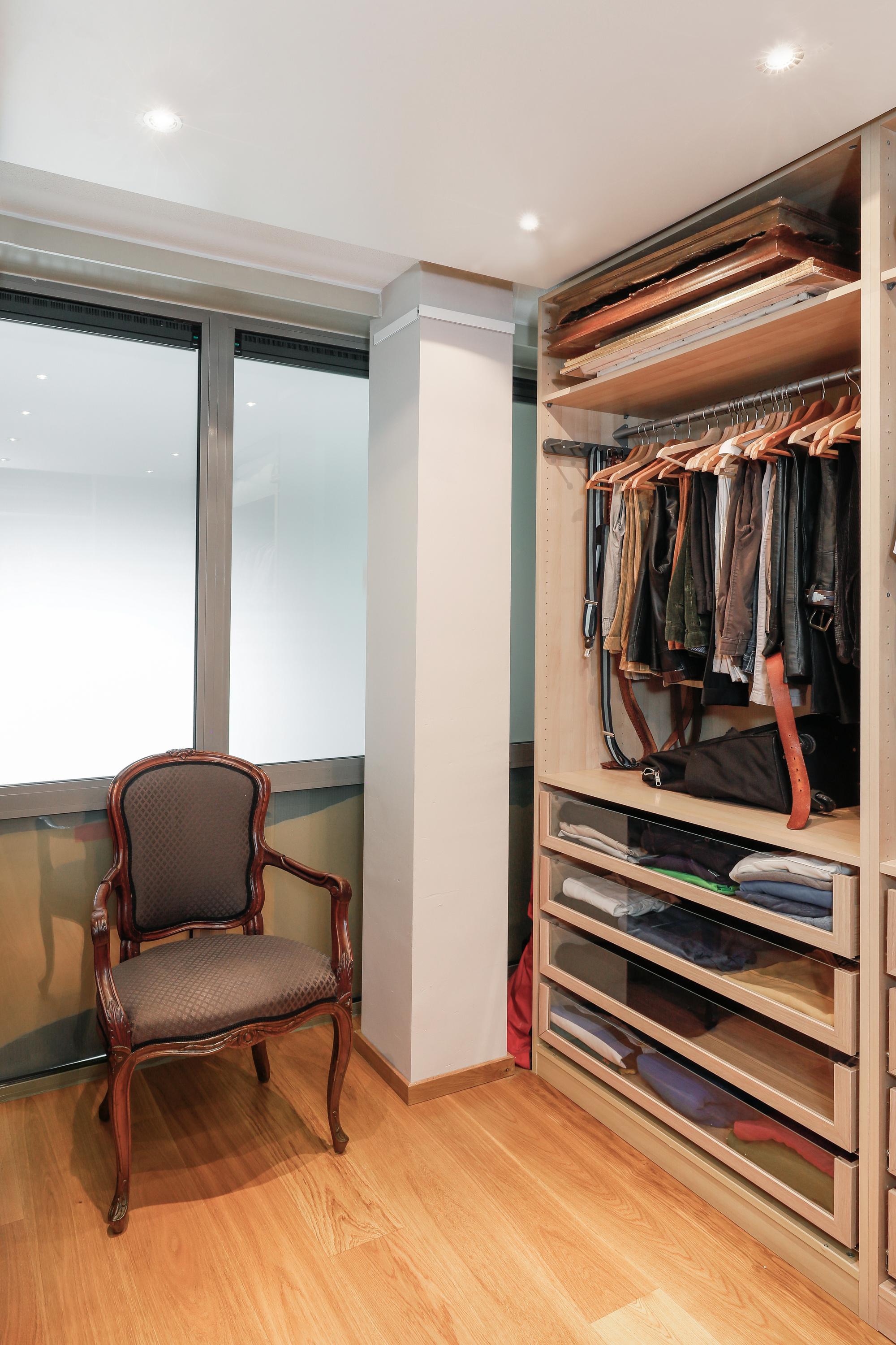 The bedroom is designed so that you'll have everything you need right at your fingertips. Naturally, there's plenty of space for the bed and bedside tables. Through the sliding door into the living room and further through the tall windows in the living room, you have a beautiful view of the courtyard. The bathroom and walk-in dressing room are en suite to this bedroom. There's also plenty of room for a sofa and TV. The walk-in dressing room was created from an originally planned mezzanine. A truly wonderful and very rewarding space. The dressing room is fully equipped for organized and practical storage of all your clothes.