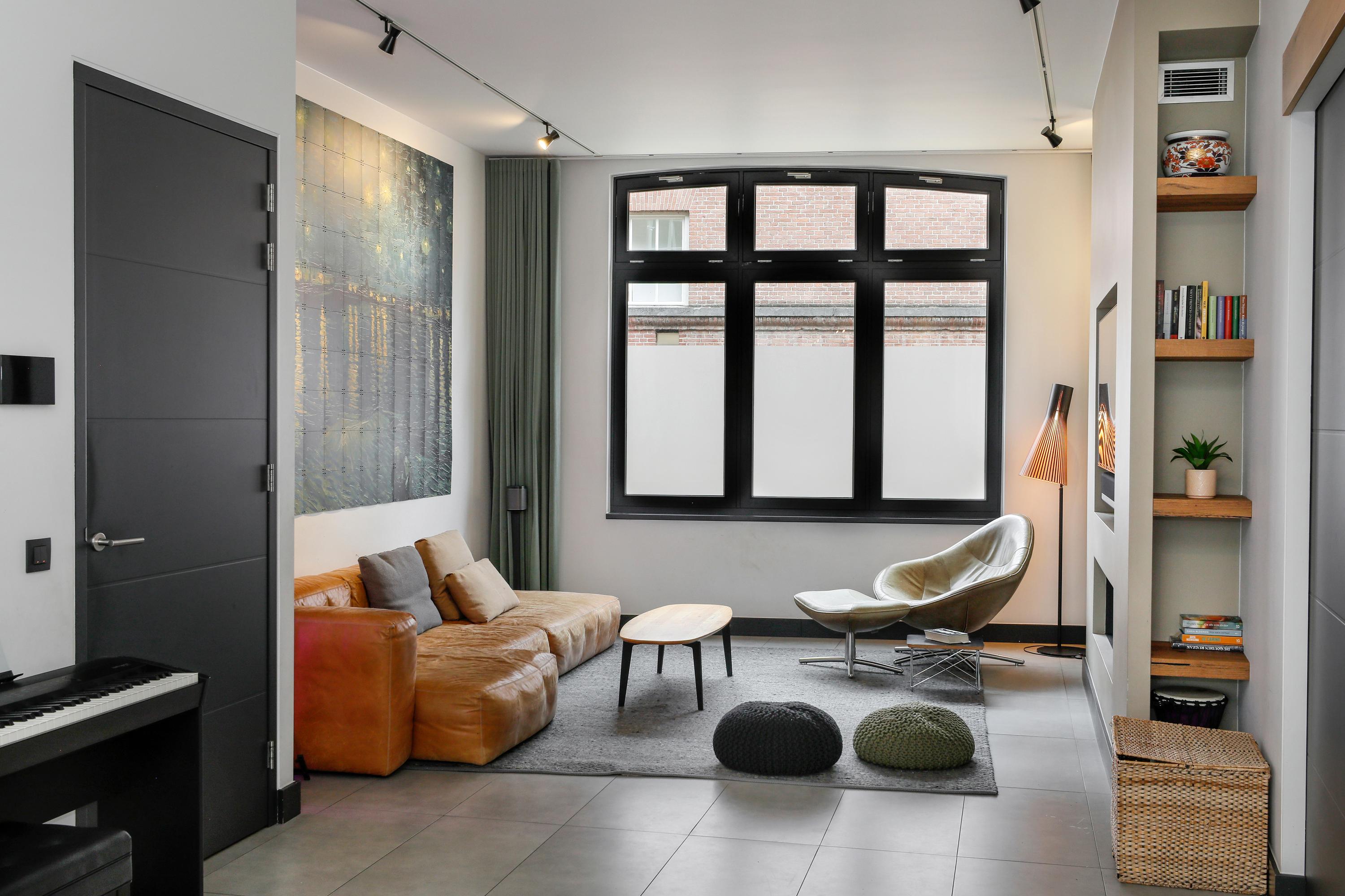 It's especially nice when the sitting area is at the end of the room. Here, you can find peace and quiet in the evenings, without the hustle and bustle. The fireplace is incorporated into a wall, as is the TV. Behind this wall, there's plenty of storage, with shelves providing ample space for displaying beautiful items. Just like the rest of the ground floor, the tiled floor resembles a wooden one. This floor not only creates a warm atmosphere, but thanks to the underfloor heating, it's also very comfortable for bare feet. A large arched window provides ample natural light.