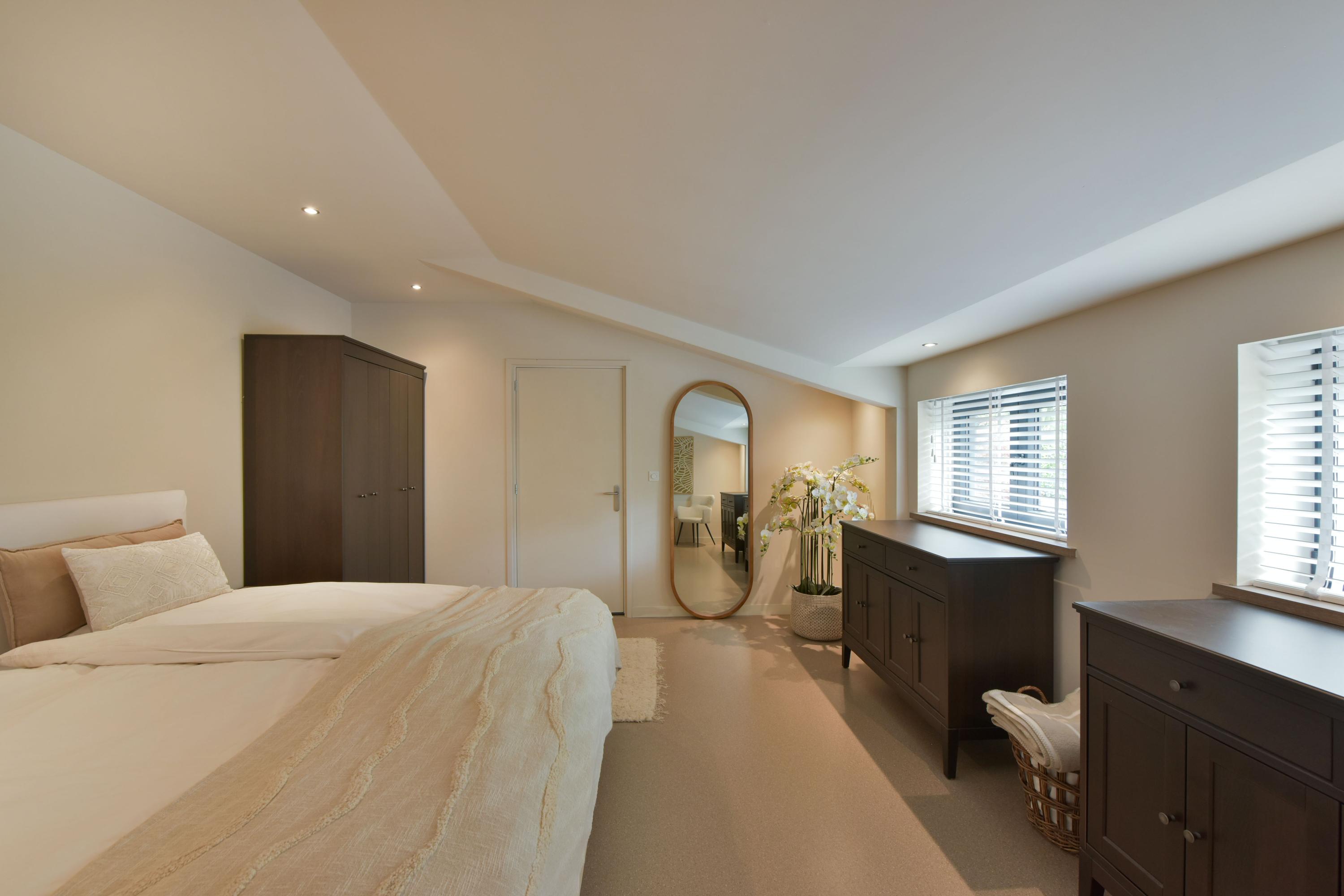 The guest accommodations—mirror image units in the former hay barn—each provide independent living with their own kitchen, bathroom, upstairs bedroom and outdoor area, suited for multi-generational living or visiting guests. A further studio building, filled with natural light, offers a mezzanine, kitchenette, heating, and direct workshop access, creating adaptable space for creative pursuits or professional use.