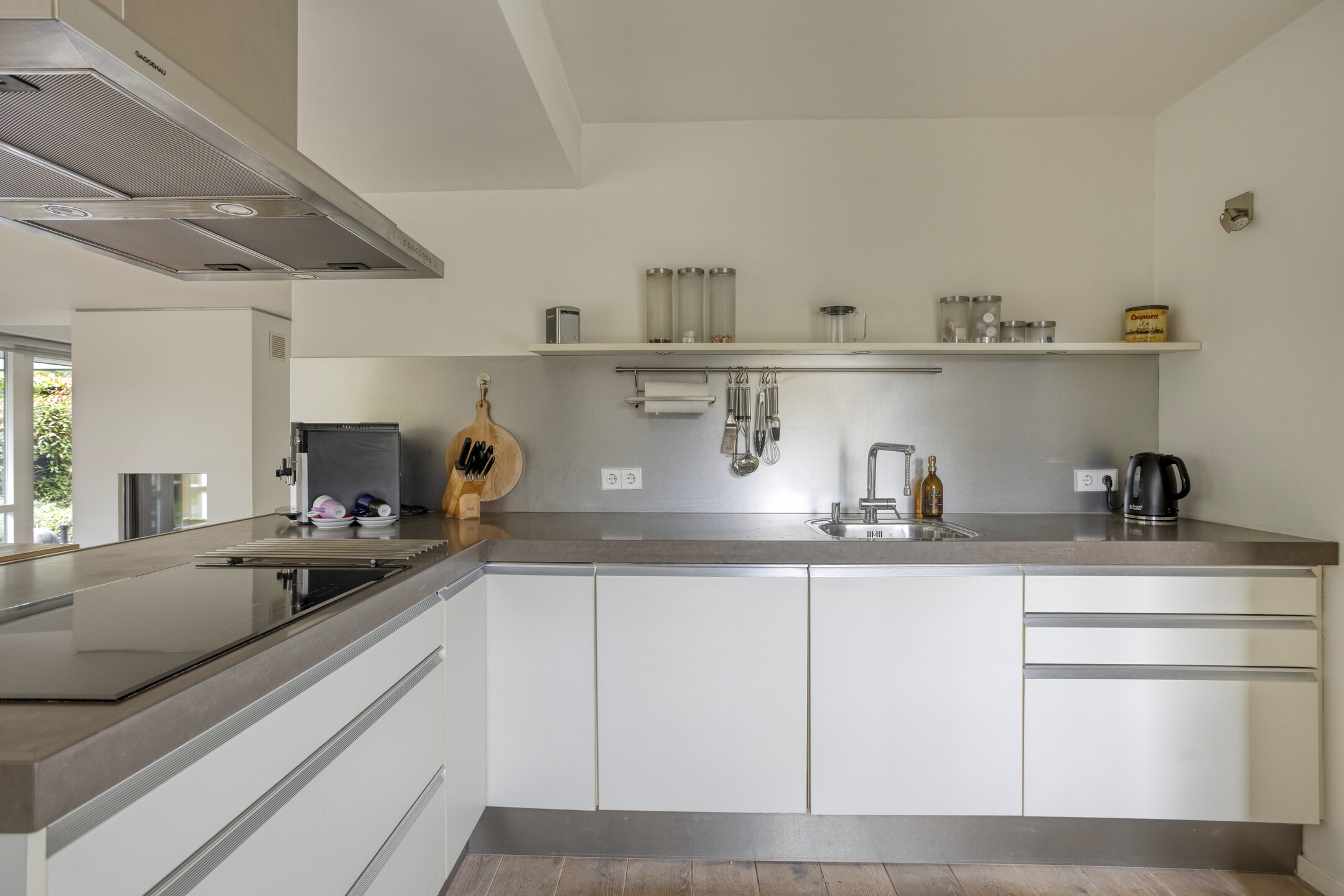 The garden-facing living room is located at the rear and is wonderfully bright thanks to the large glass façade. Here, you can relax in a comfortable sitting area while enjoying panoramic views of the beautifully landscaped waterfront garden and the Egmonderhout nature reserve.