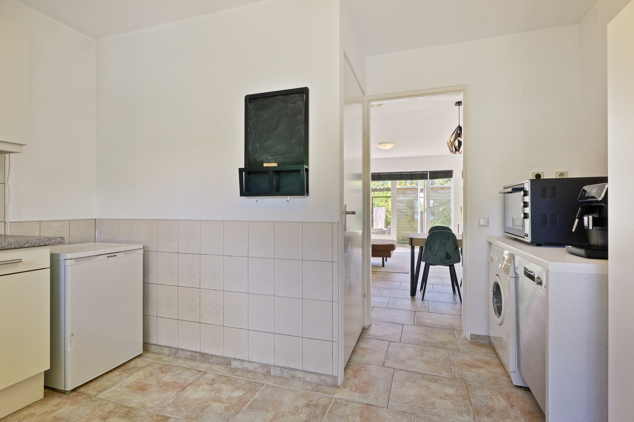 Through its private entrance, you enter the hallway with access to a modern guest toilet. At the front is the kitchen, practically designed and equipped with high-quality built-in appliances, including a Boretti gas stove with griddle and double oven, Bosch microwave, dishwasher, fridge-freezer, and a wine climate cabinet. At the rear is the spacious living and dining room, spanning the full depth of the house and directly connected to the deep garden. Large windows and a sliding glass door provide abundant light and a wonderful view of the greenery.