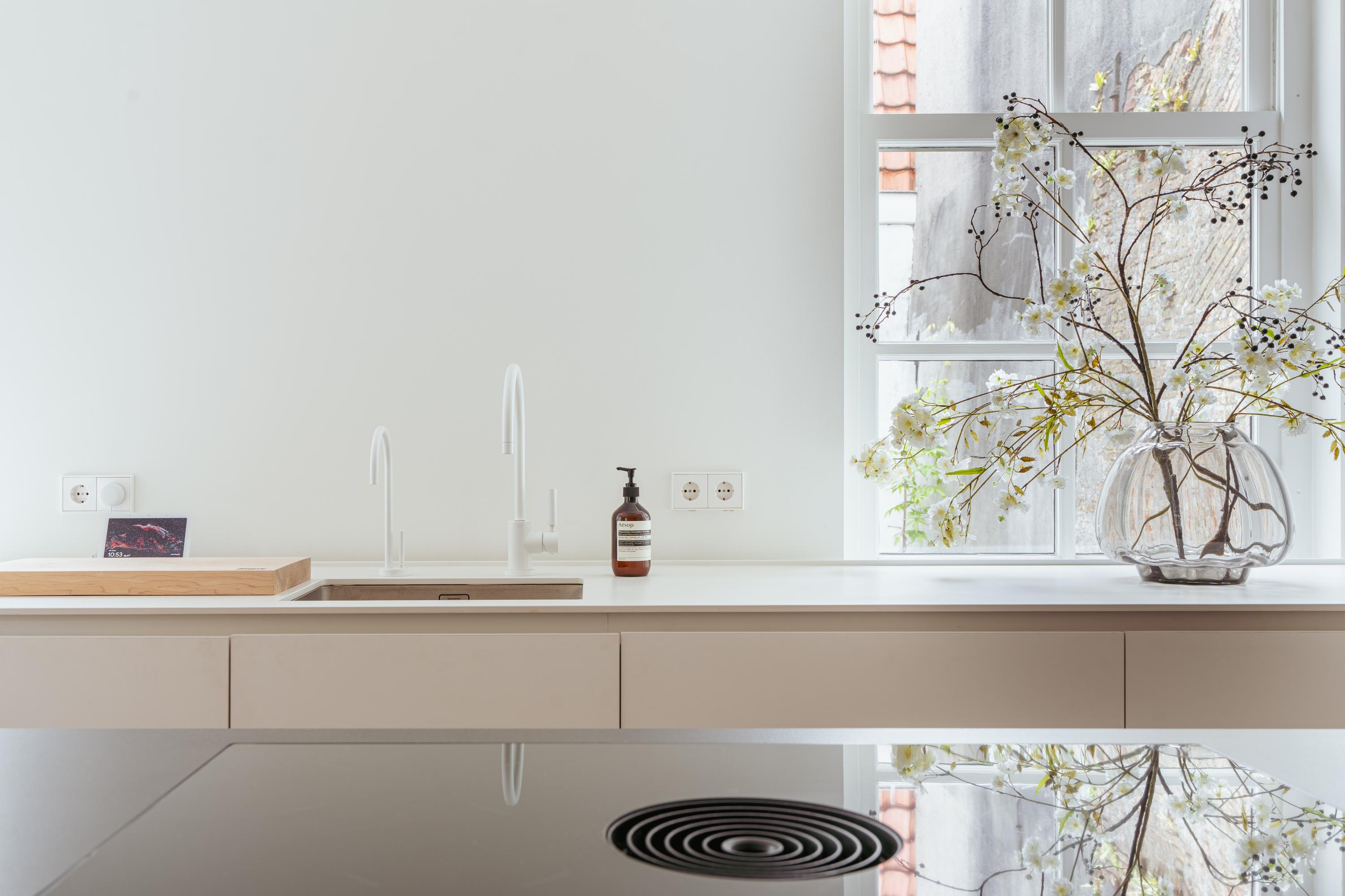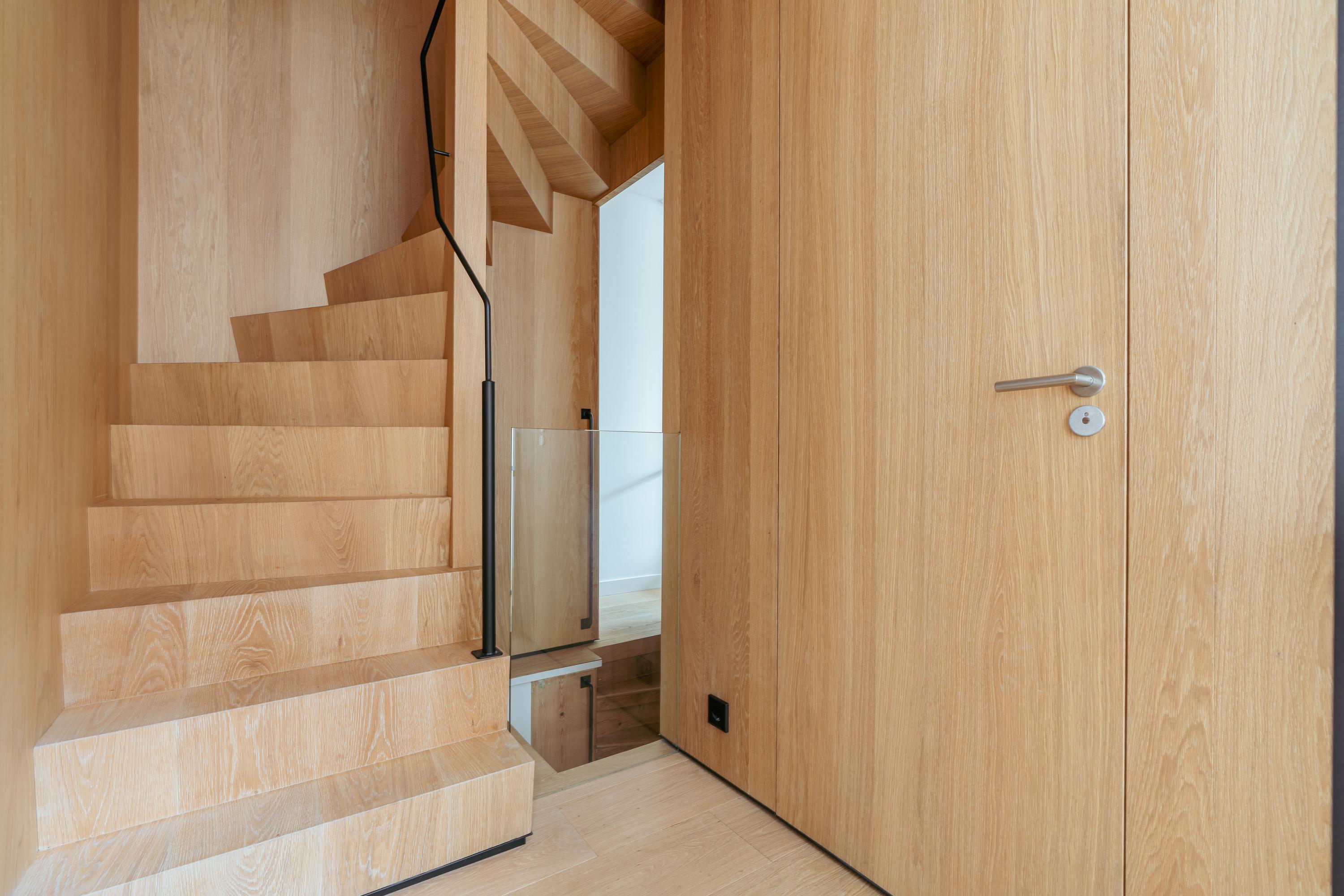 The second level is devoted to living and entertaining, anchored by a modern kitchen with premium appliances, a central island bar and generous space for relaxation, framed by canal views through the tall windows. Private moments extend to a balcony on the top floor, an intimate retreat under sloped ceilings. Throughout, solid oak floors, high-efficiency underfloor heating and a fully upgraded climate system echo the home’s commitment to comfort and sustainability, underlined by an A+++ energy label.
