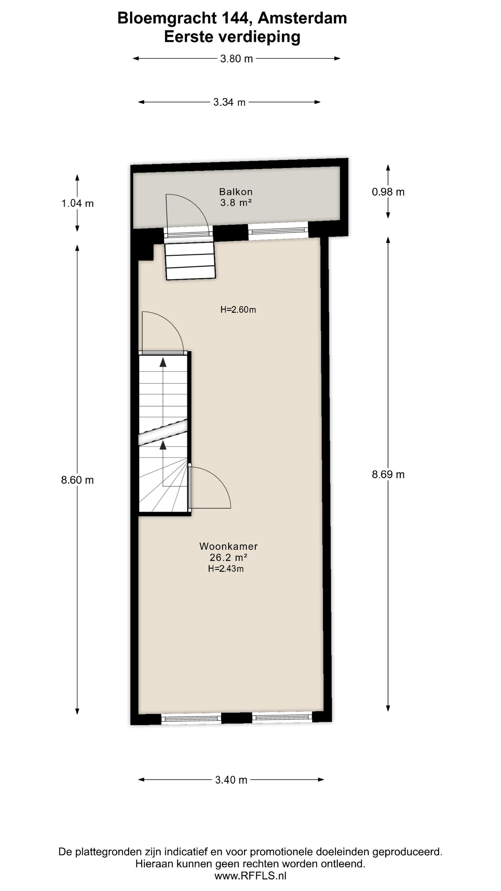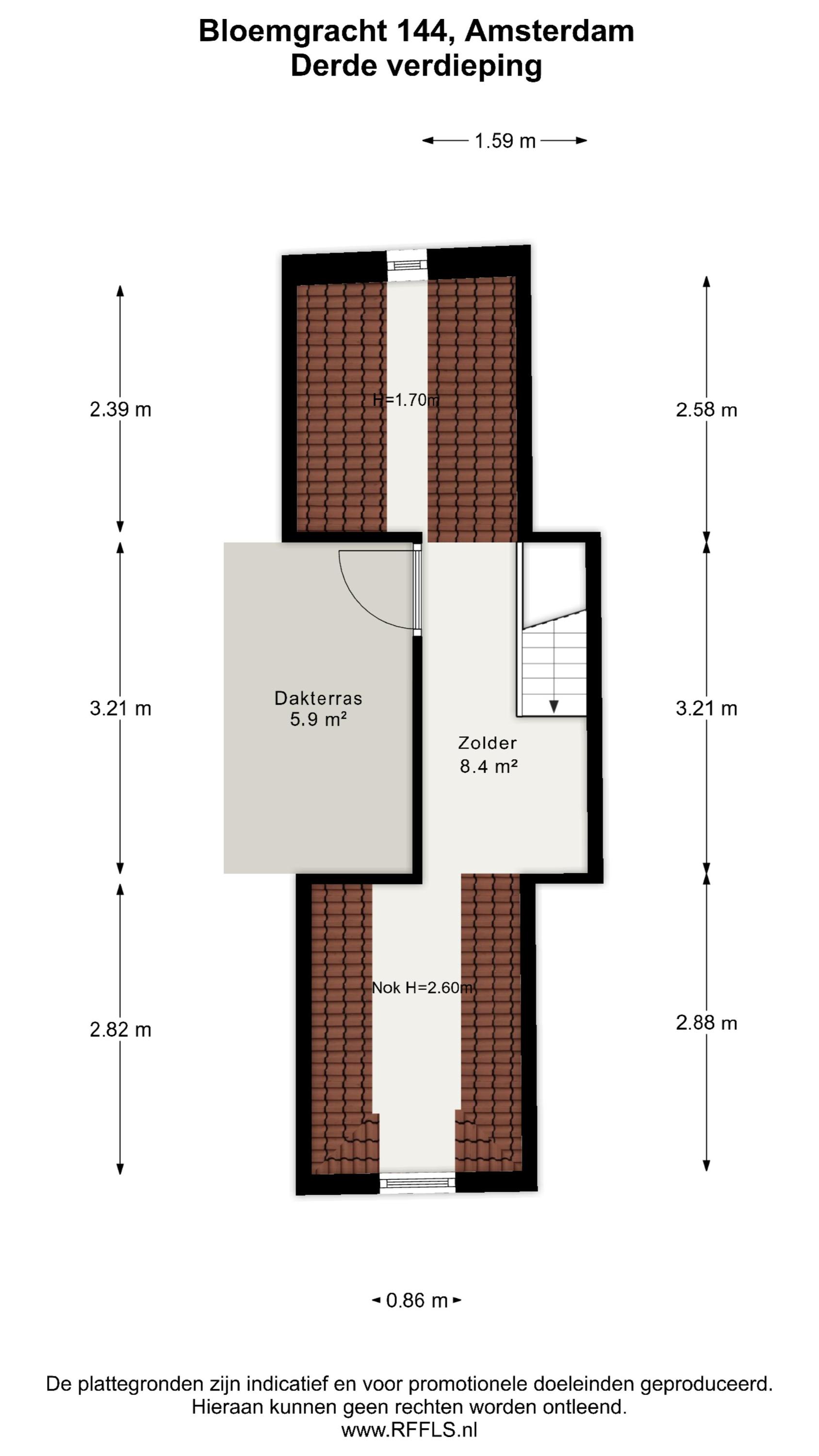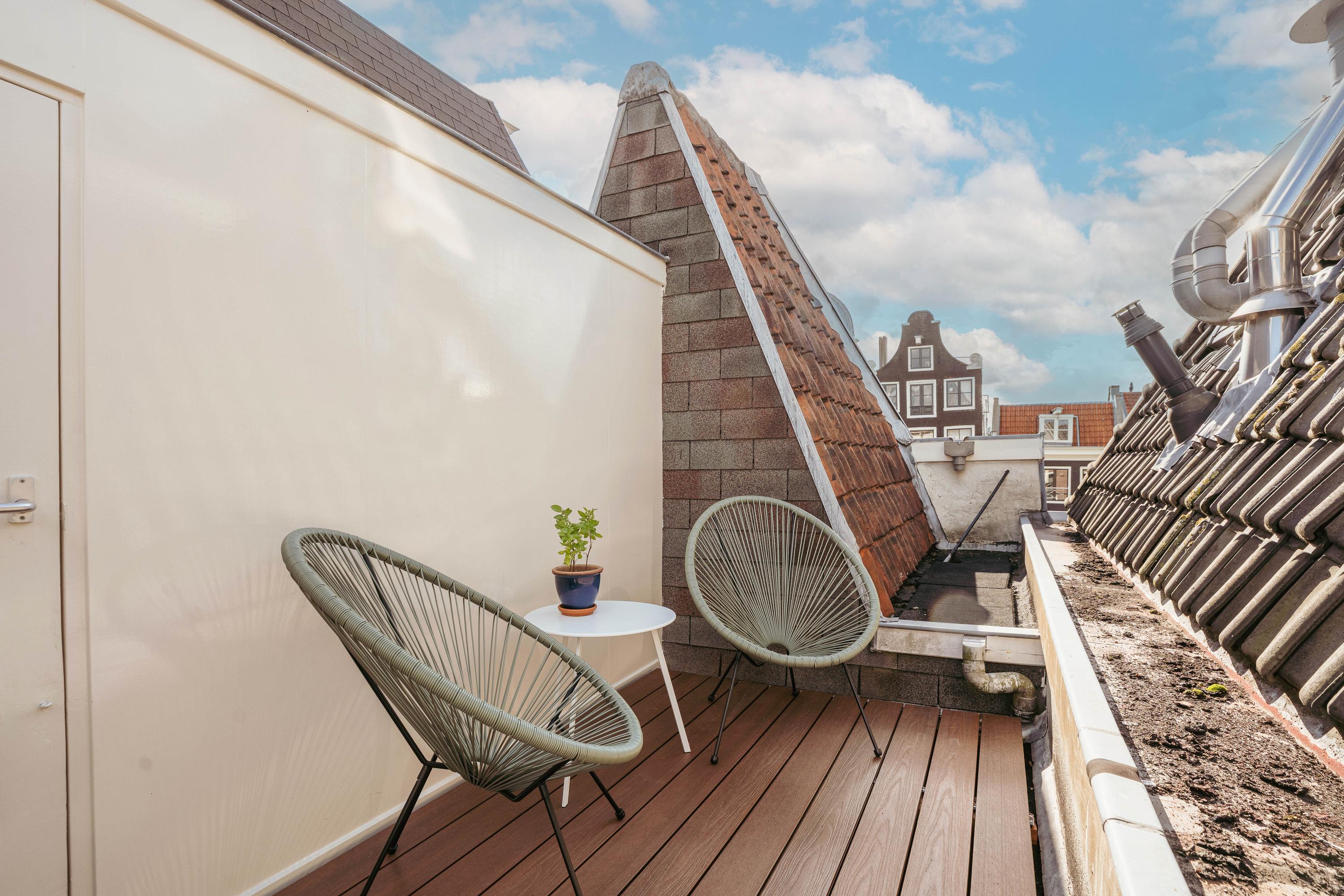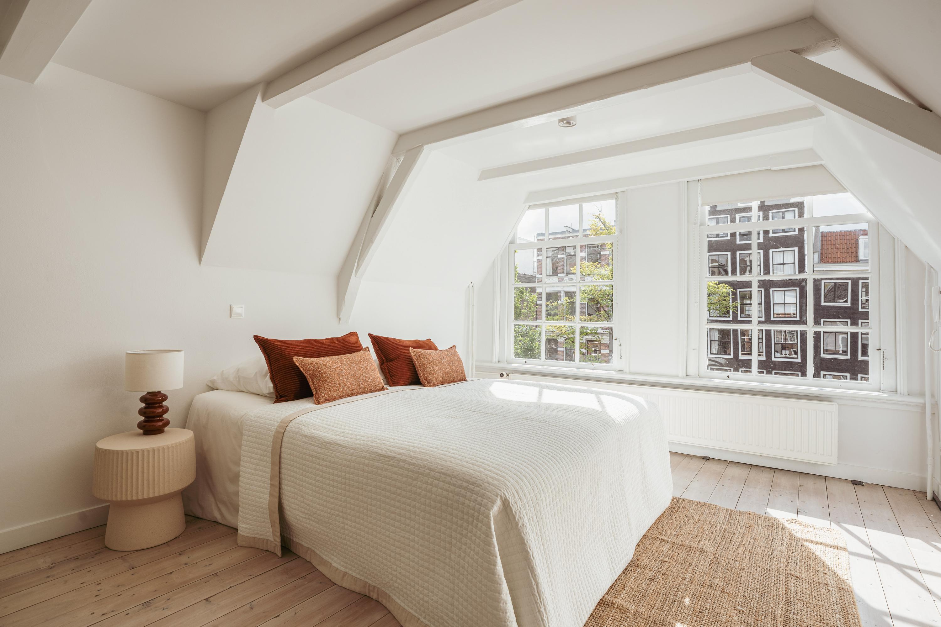A gracefully conceived split-level living room occupies the first floor, its windows framing views over the Bloemgracht and inviting a slower contemplation of the cityscape. The second floor provides a bedroom that looks out onto the canal and a bathroom with shower, while the third floor features a spacious second bedroom with en suite bathroom, built-in wardrobes and generous proportions. Storage and technical space are quietly resolved under the roof, with access to a secluded terrace affording moments of privacy above the city.