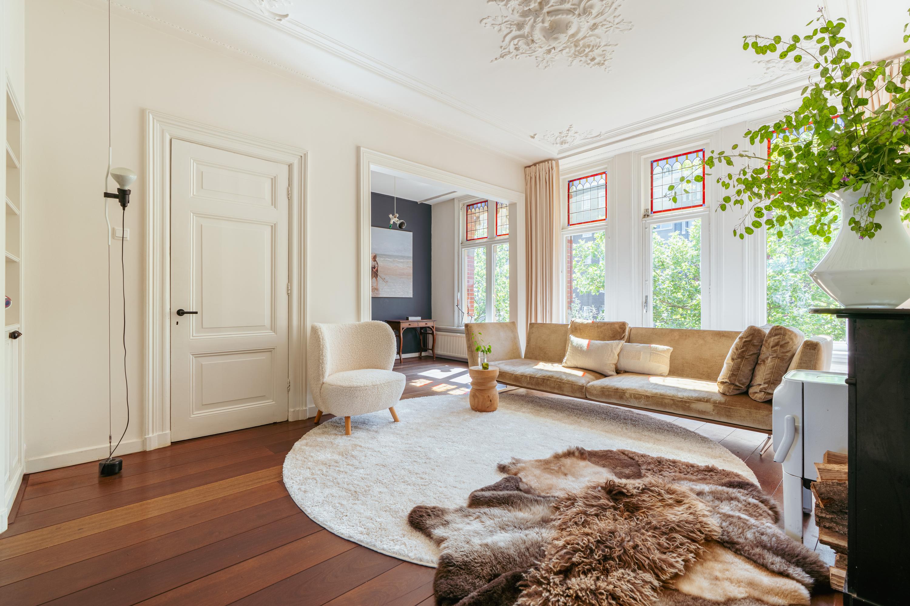 This level features a spacious landing with original exposed wooden beams—perfect as a music room, workspace, or gaming area. The fourth bedroom and a convenient storage room are located at the front. There’s also an additional washbasin on this floor. A staircase leads to the roof, where you can enjoy views of Carré Theatre and even the Rijksmuseum. This characteristic building, designed by architect A.C. Boerma, is constructed of brick accented with limestone blocks and bands. The facade boasts three elegant wooden bay windows adorned with authentic ornaments and fantasy figures. Throughout the home, you’ll find beautiful hardwood flooring, high ornamental ceilings, and original stained-glass transom windows. We invite you, like the current residents, to fall in love with this truly exceptional and spacious home.