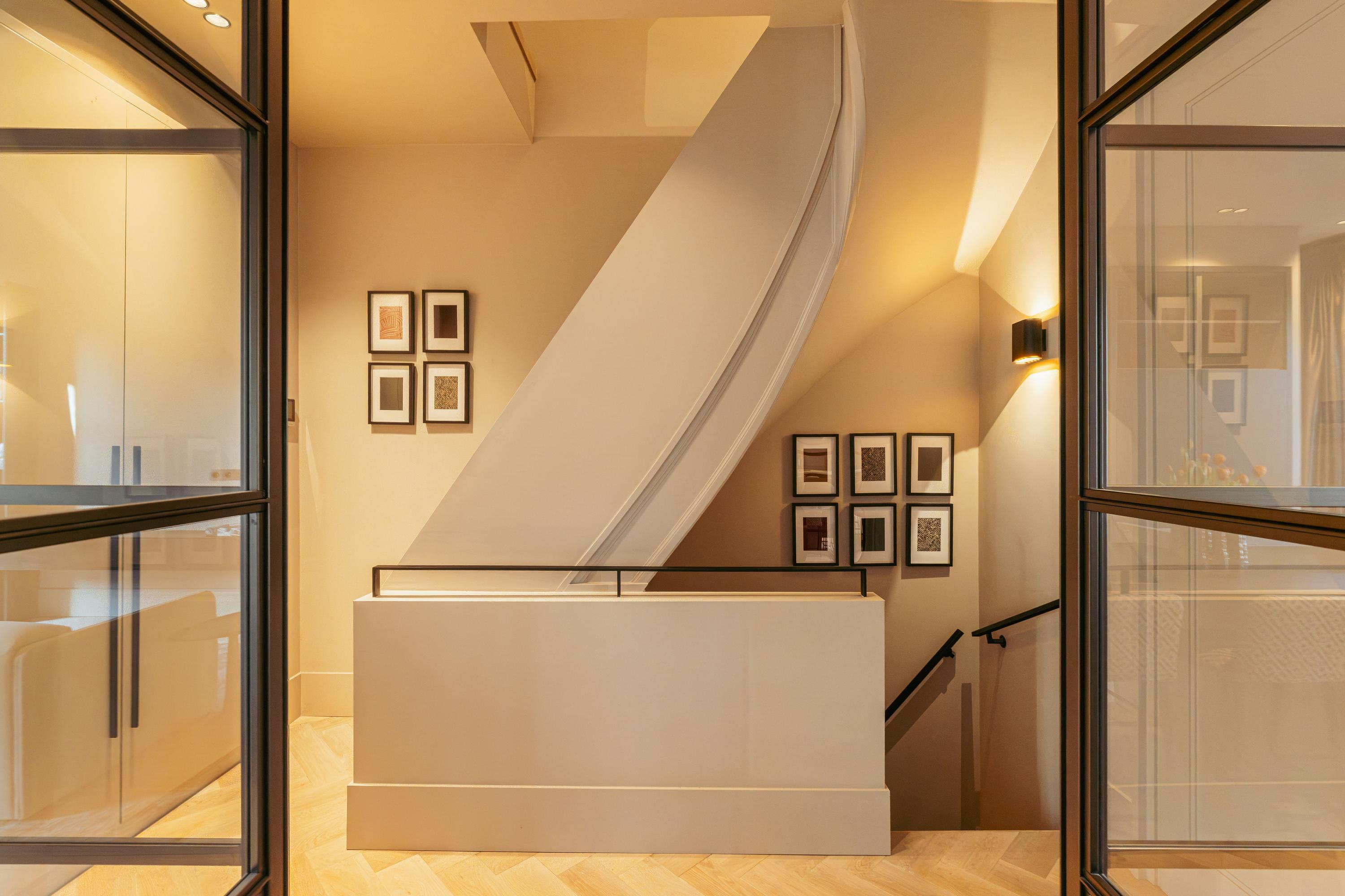 The kitchen-diner is the absolute centerpiece and connecting element of this floor. This generous space has been designed for both everyday comfort and refined dining experiences. The large kitchen island features a double induction hob with integrated extraction and is elegantly combined with a built-in dining and bar area. The handleless custom cabinetry houses high-end built-in appliances, including a refrigerator, freezer, dishwasher, double Miele oven and a wine climate cabinet. At the rear you will find a more intimate sitting or dining area, perfect for dinners or as a cozy coffee and bar corner. Two sets of French doors provide access to the deep and beautifully landscaped balcony at the quiet rear, overlooking the inner gardens.