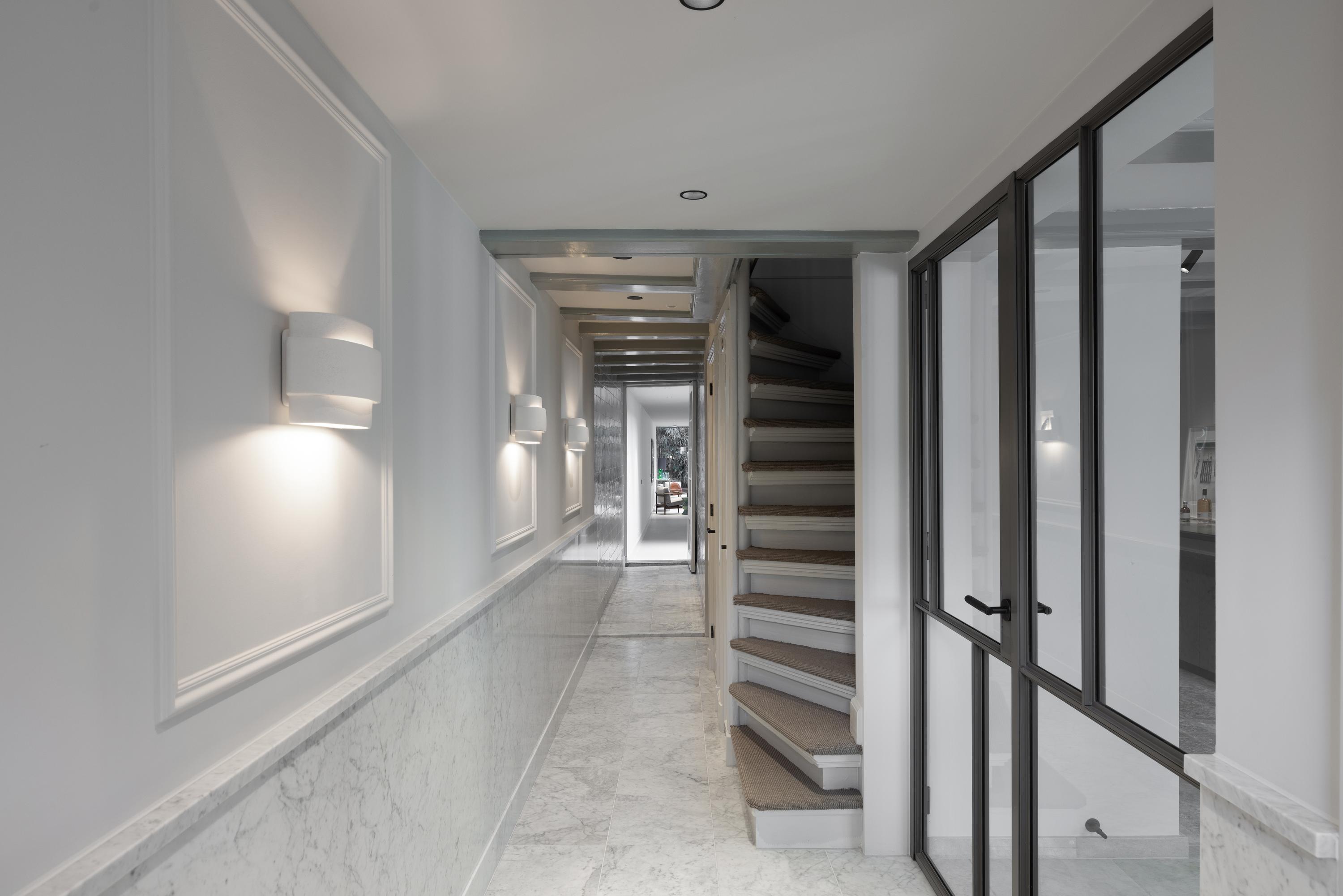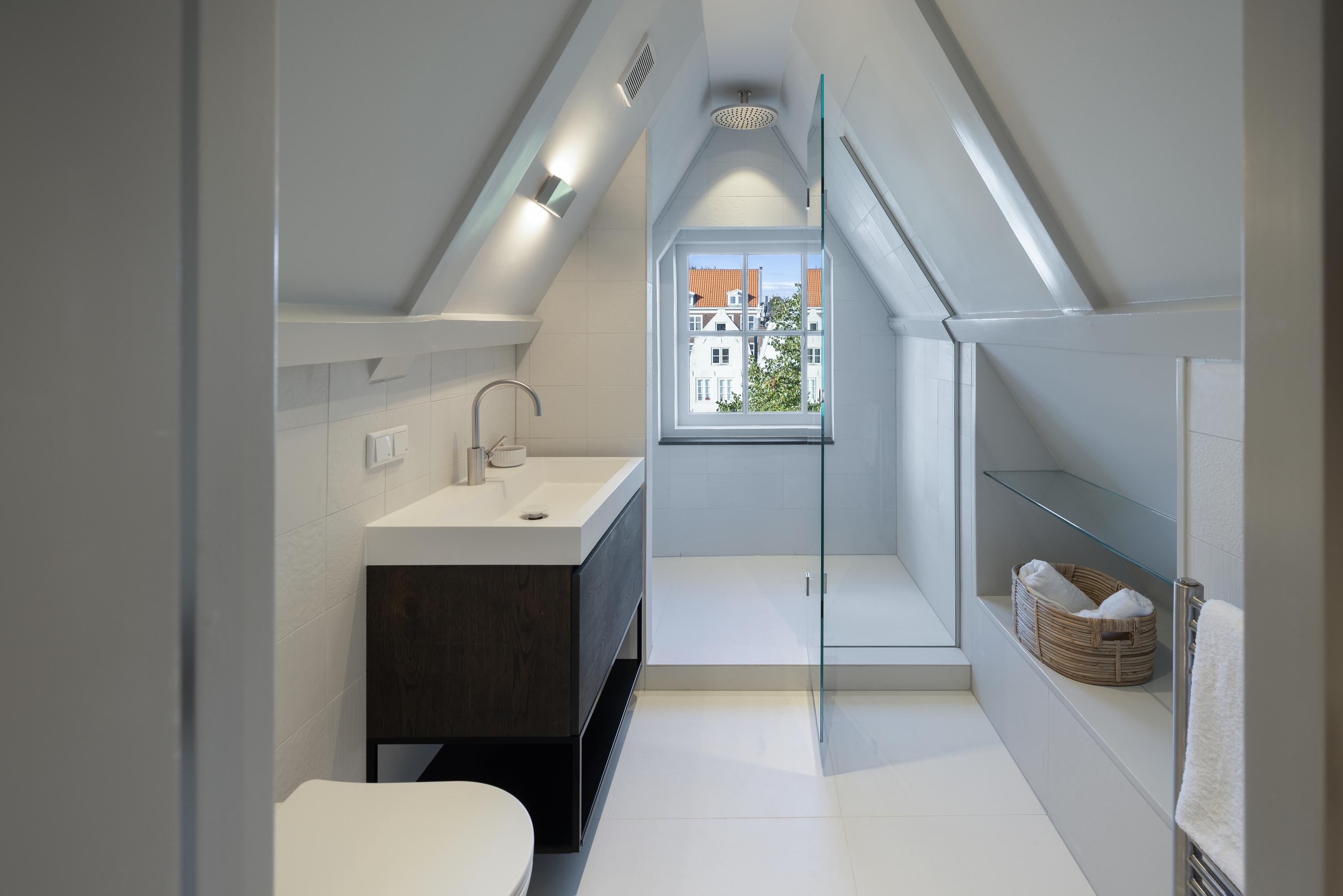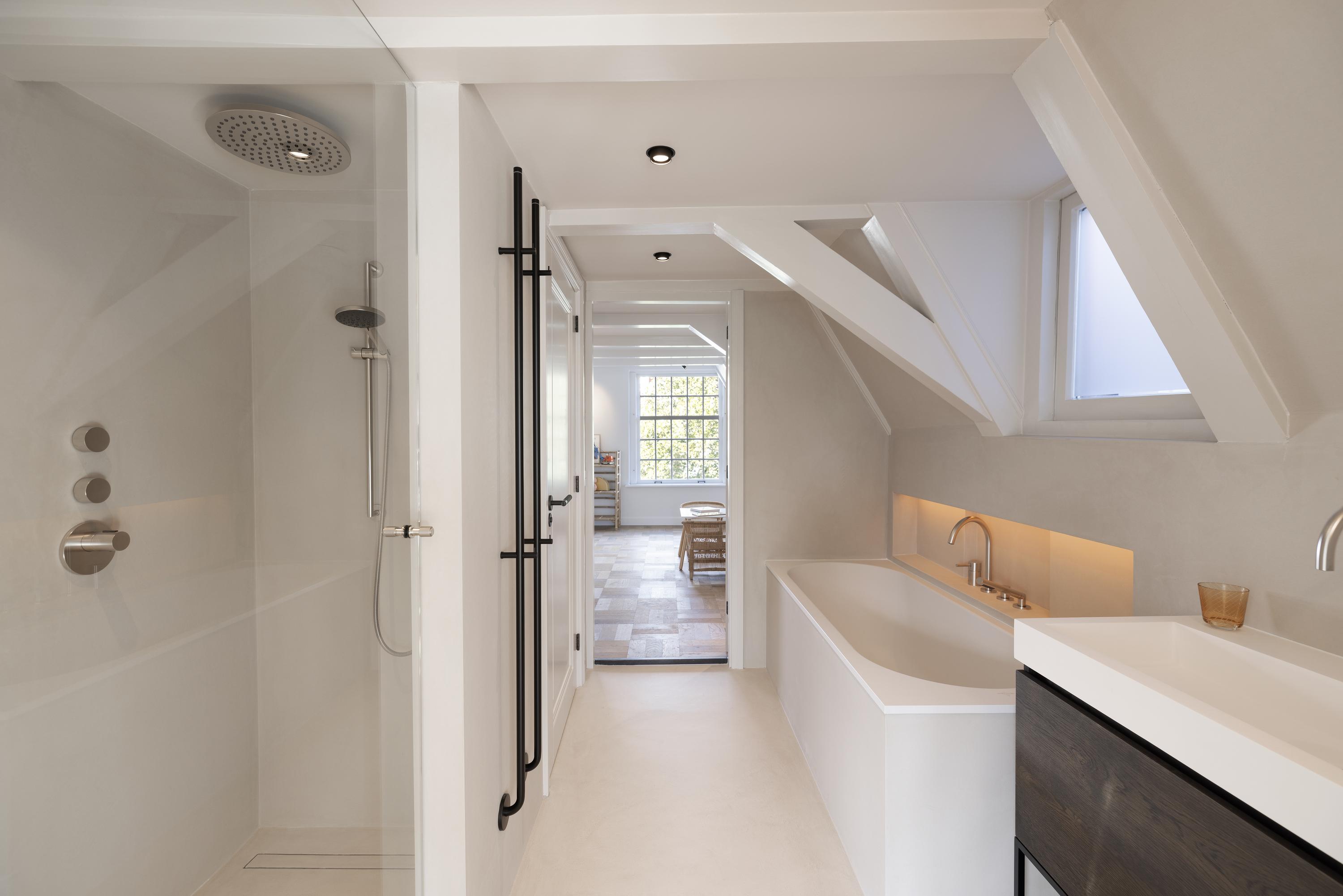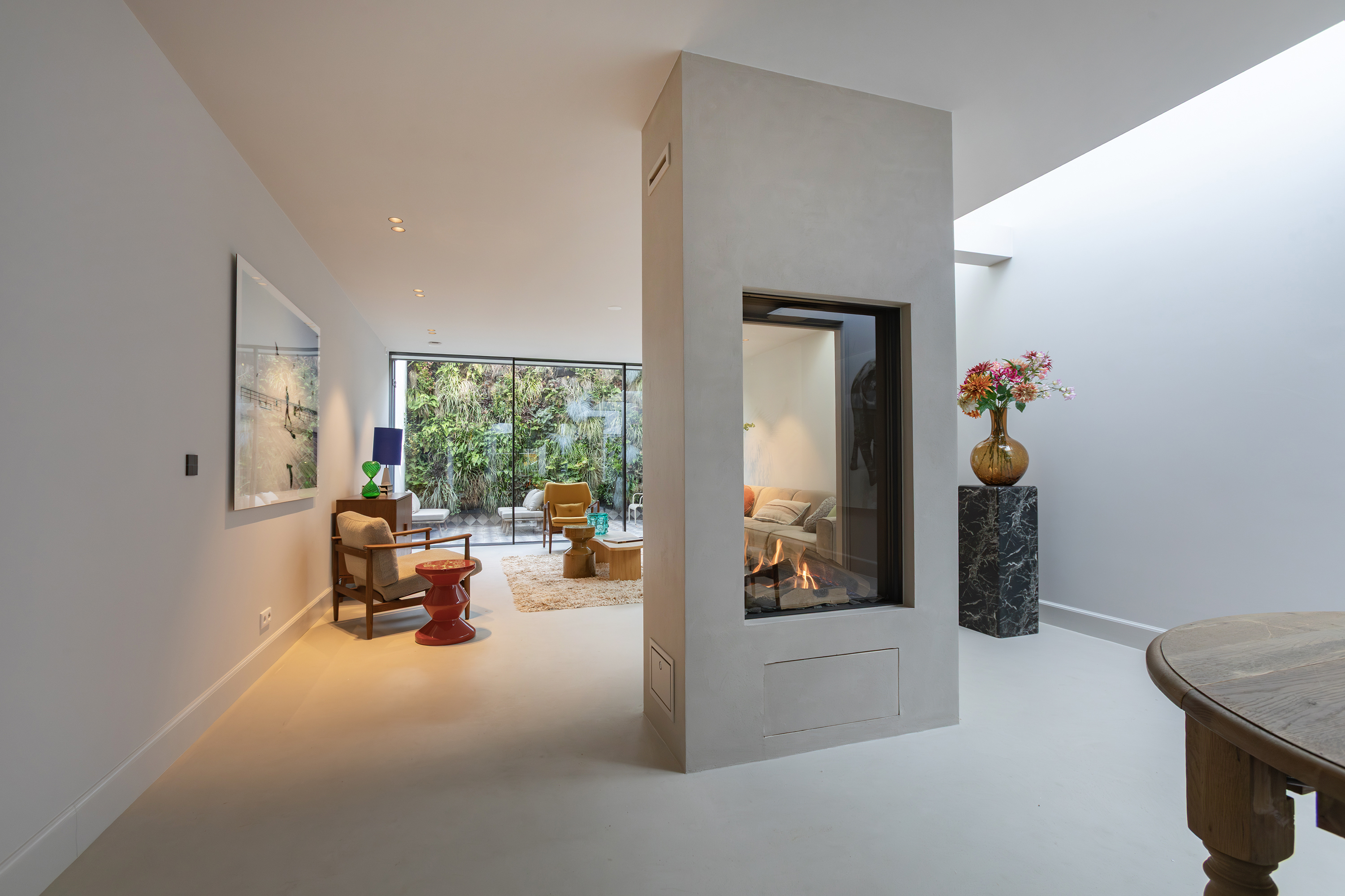 The living room is accessed via a passageway in which antique white tiles have been carefully preserved. The living room has a microcement floor and fireplace and a big tunnel gas fire. A wonderful sliding door gives access to a second patio with original tiling. Both the patios and skylights flood the living room with light. The ground floor is more than 30 metres long in total, which is unique for a canal property in Amsterdam.