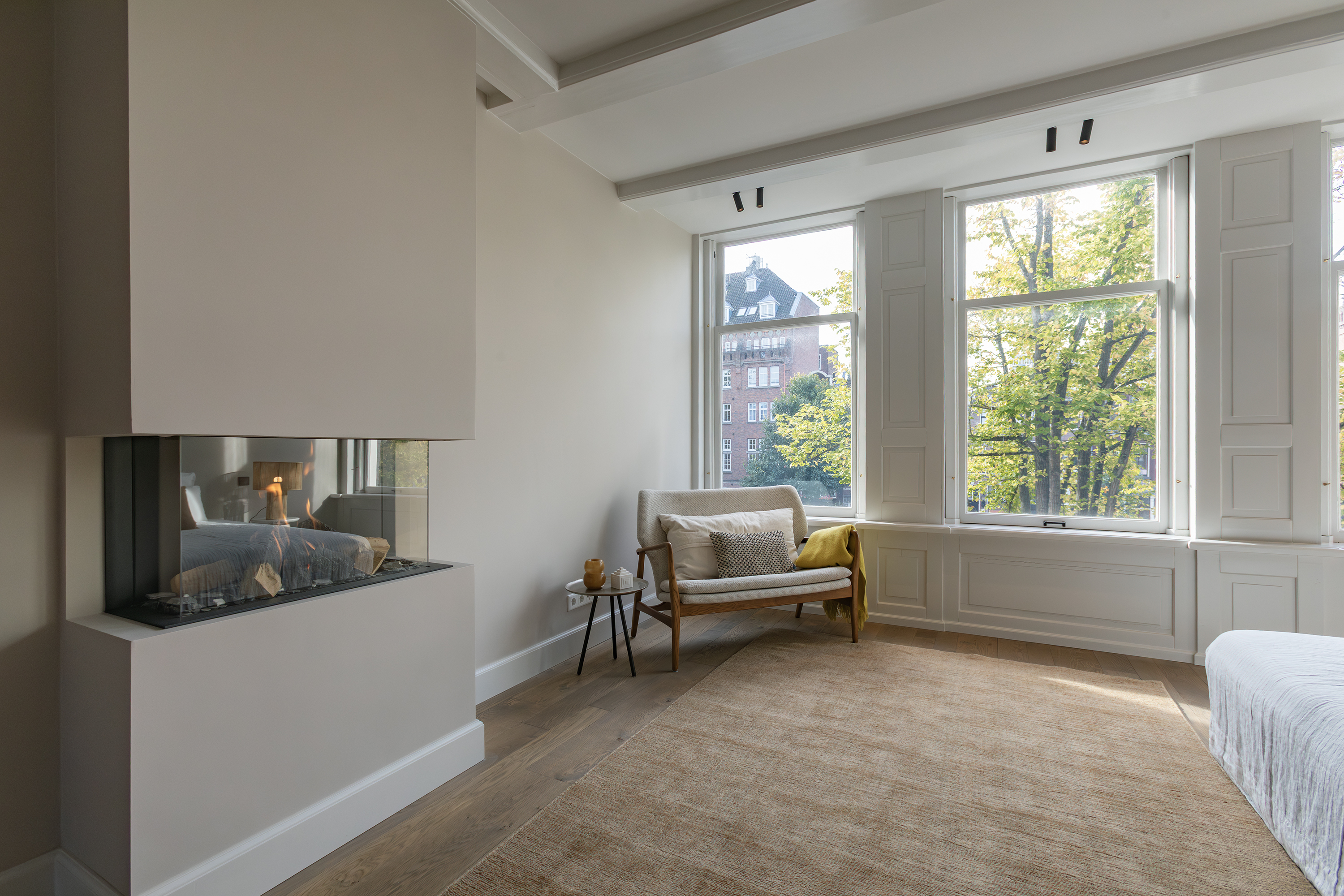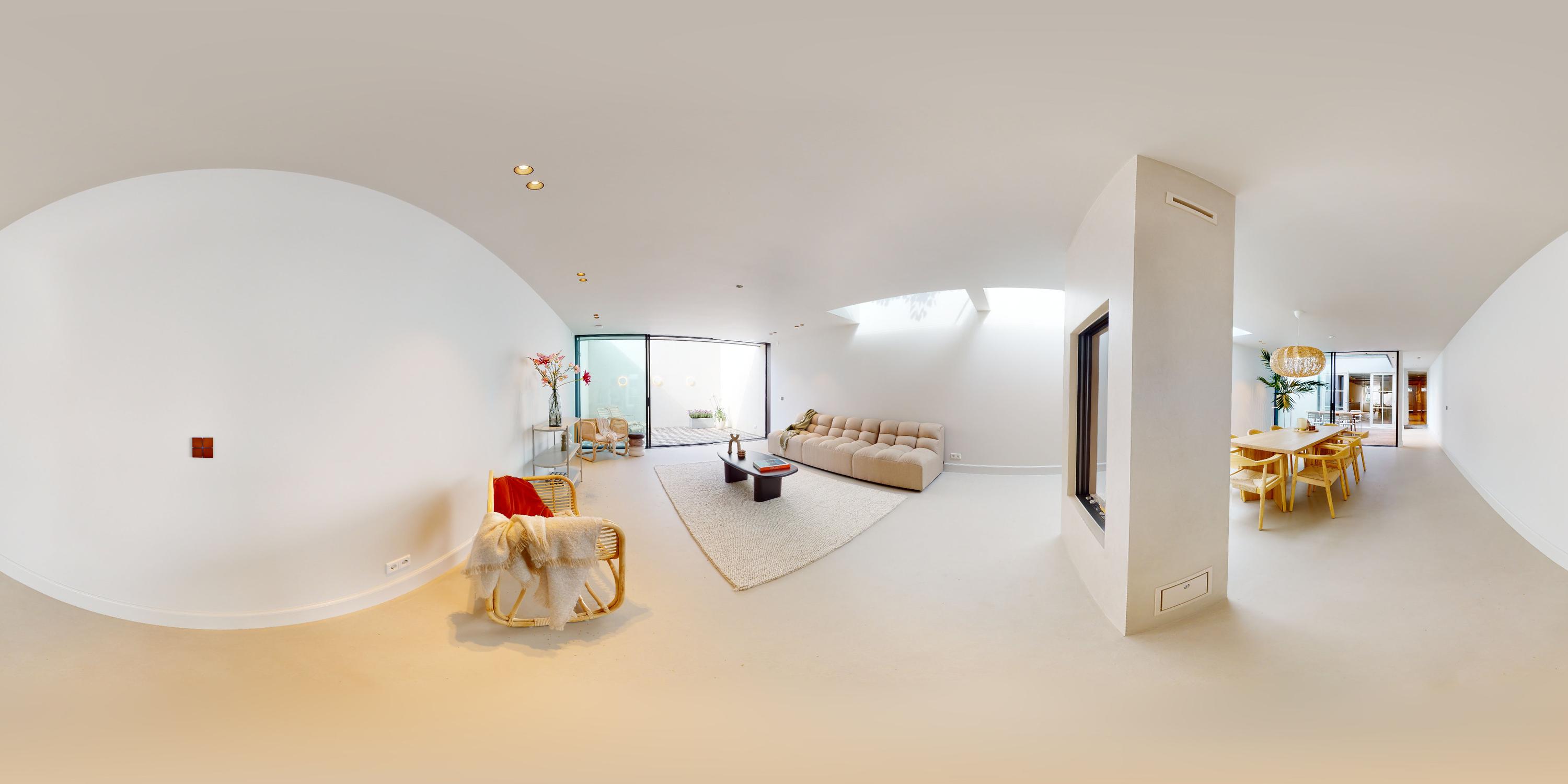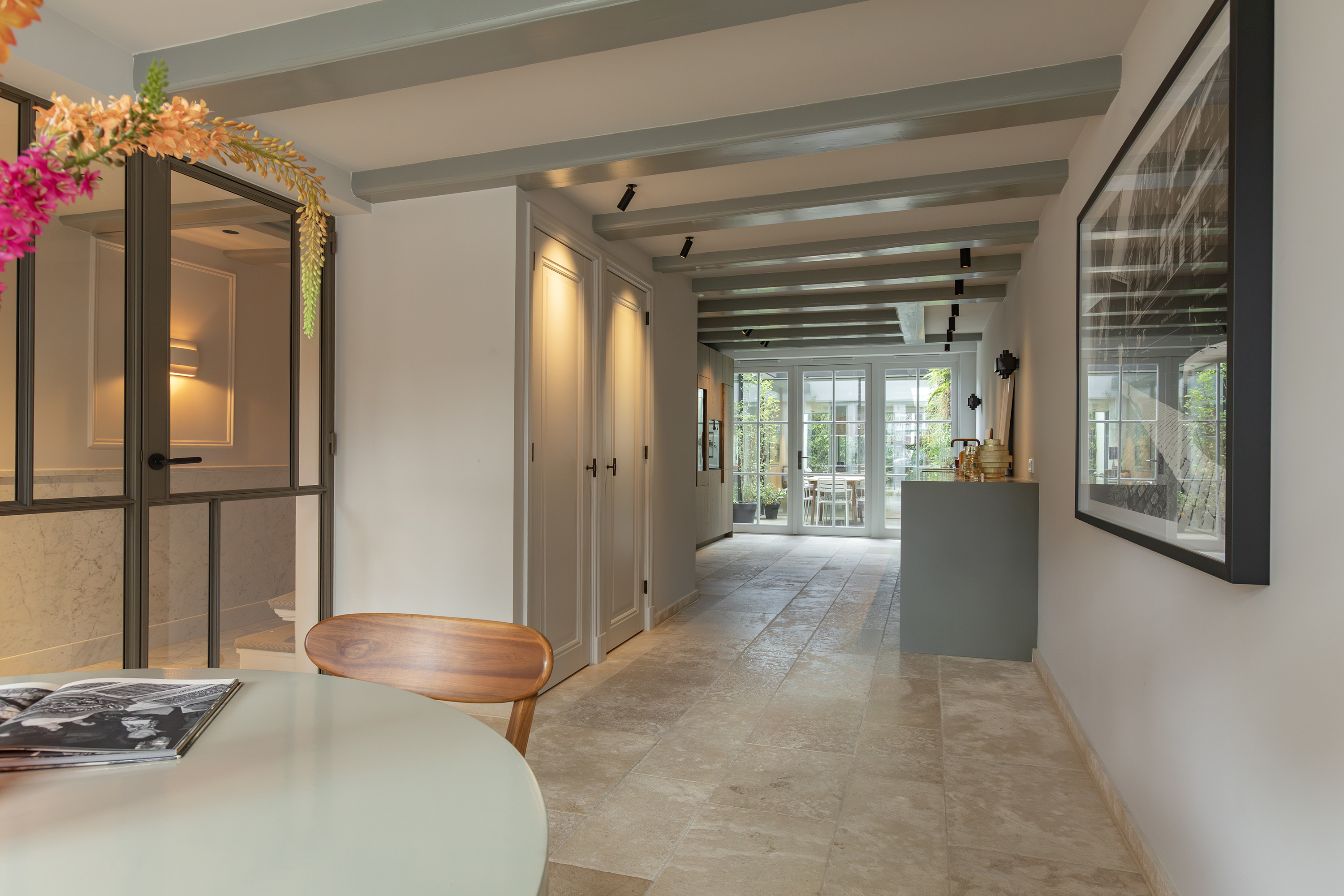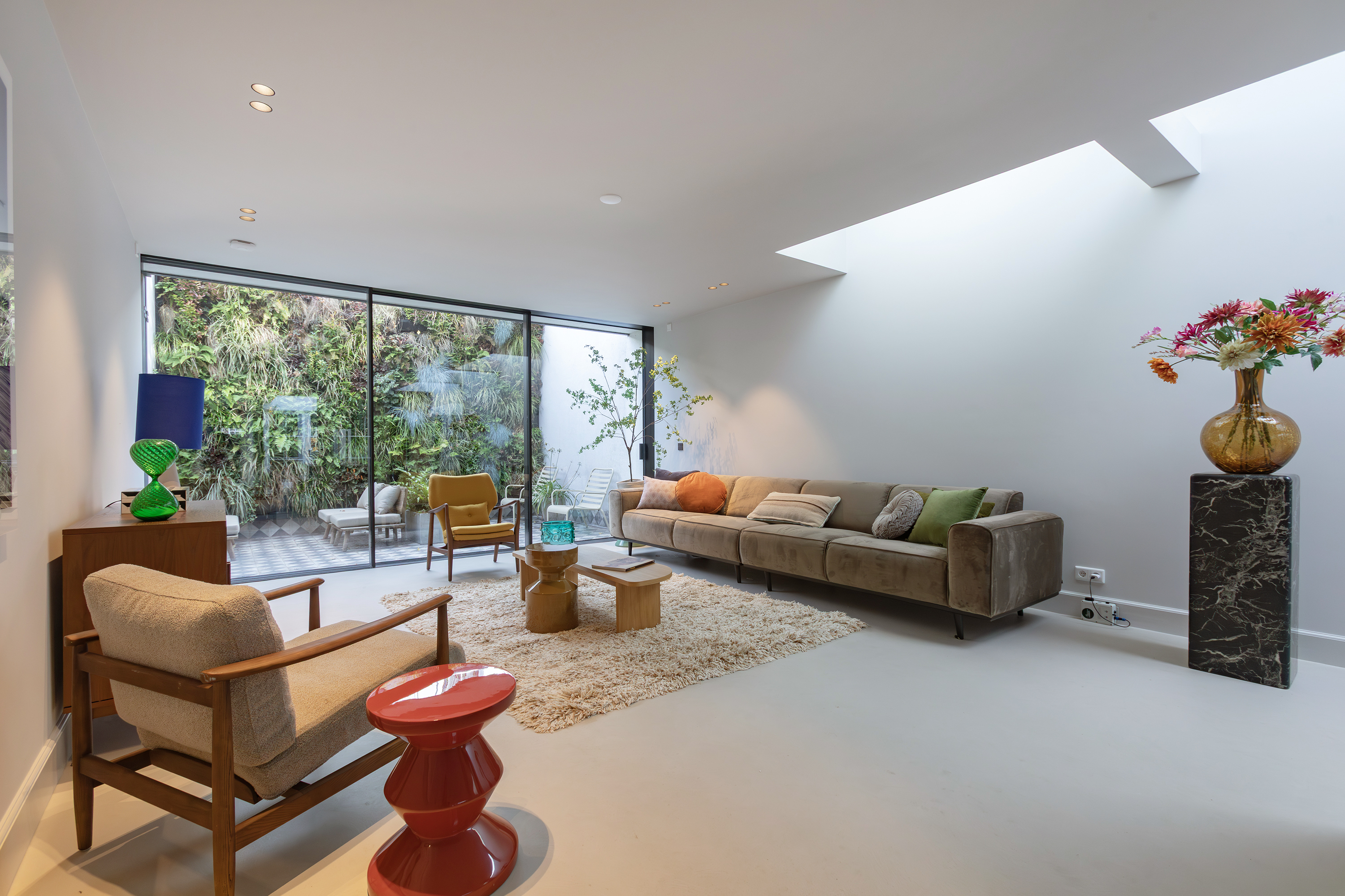 The living room is accessed via a passageway in which antique white tiles have been carefully preserved. The living room has a microcement floor and fireplace and a big tunnel gas fire. A wonderful sliding door gives access to a second patio with original tiling. Both the patios and skylights flood the living room with light. The ground floor is more than 30 metres long in total, which is unique for a canal property in Amsterdam.
