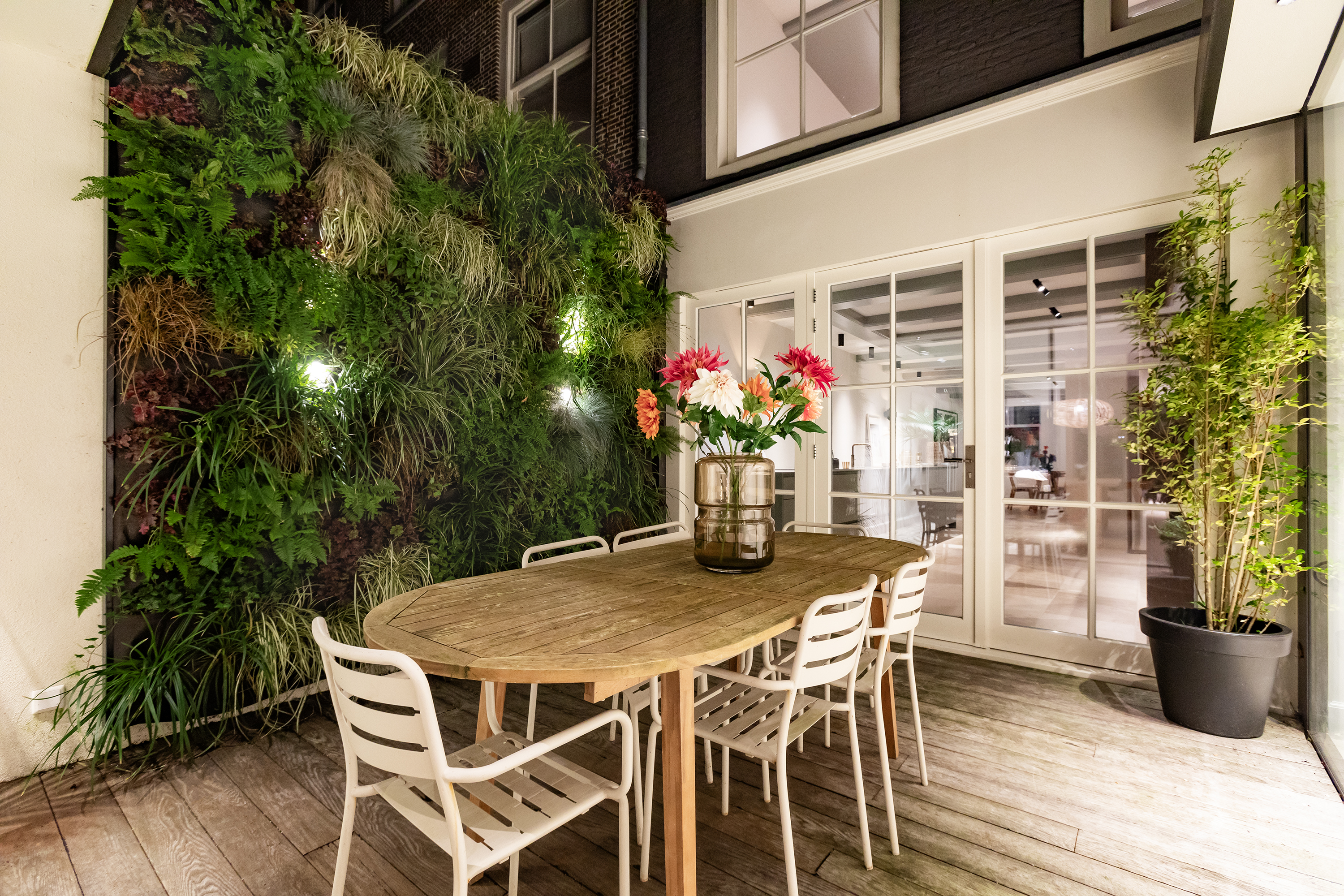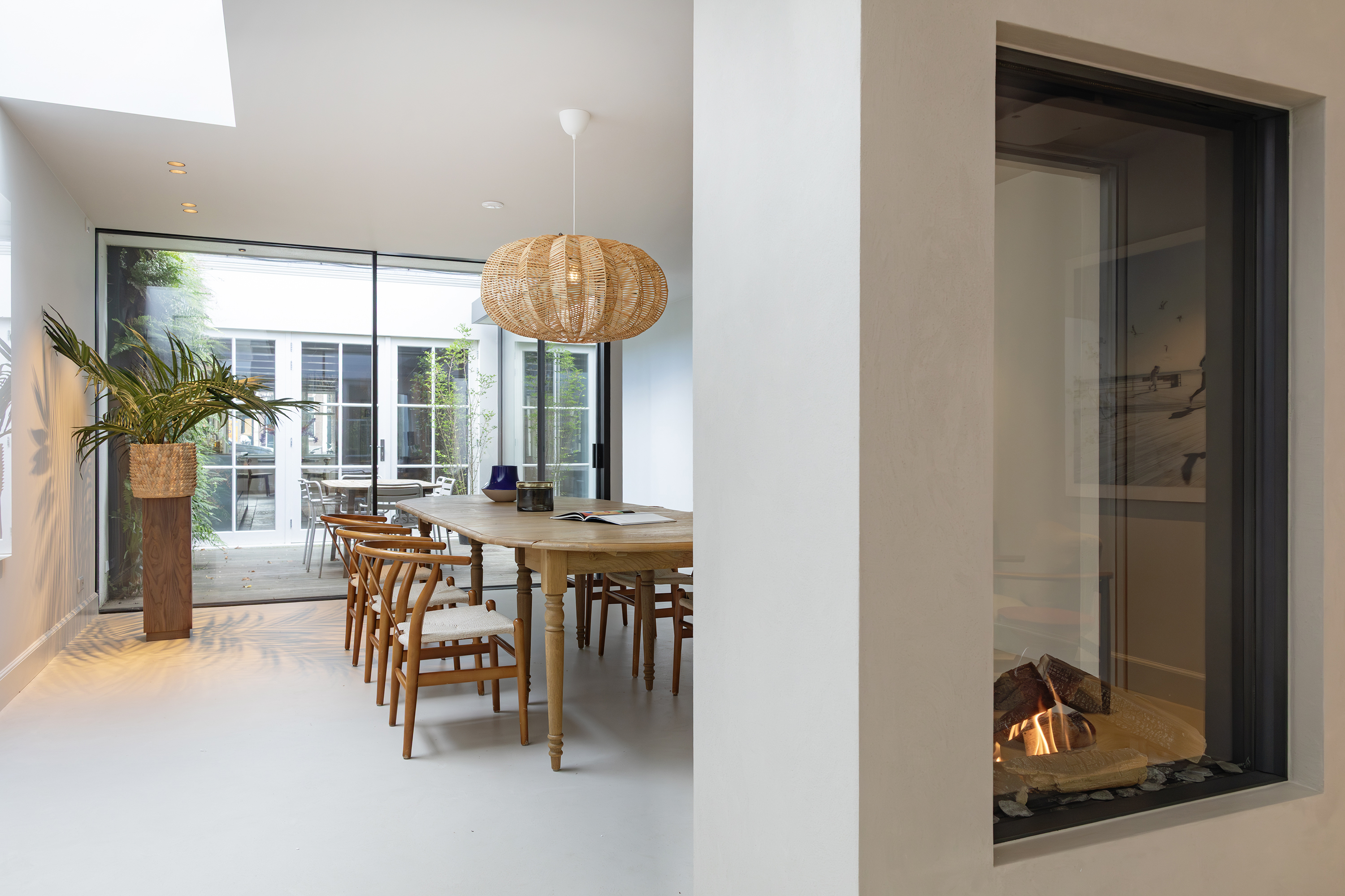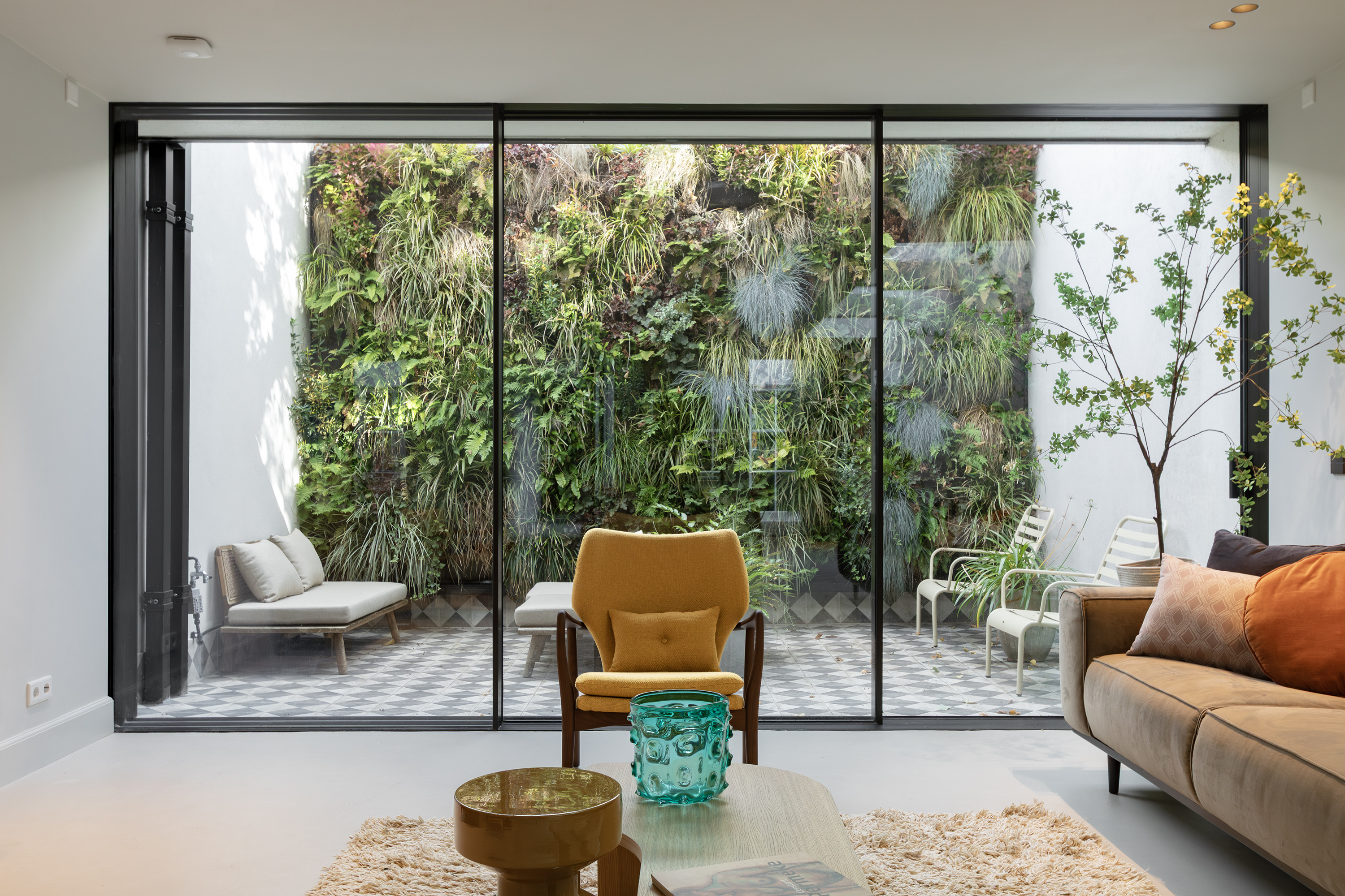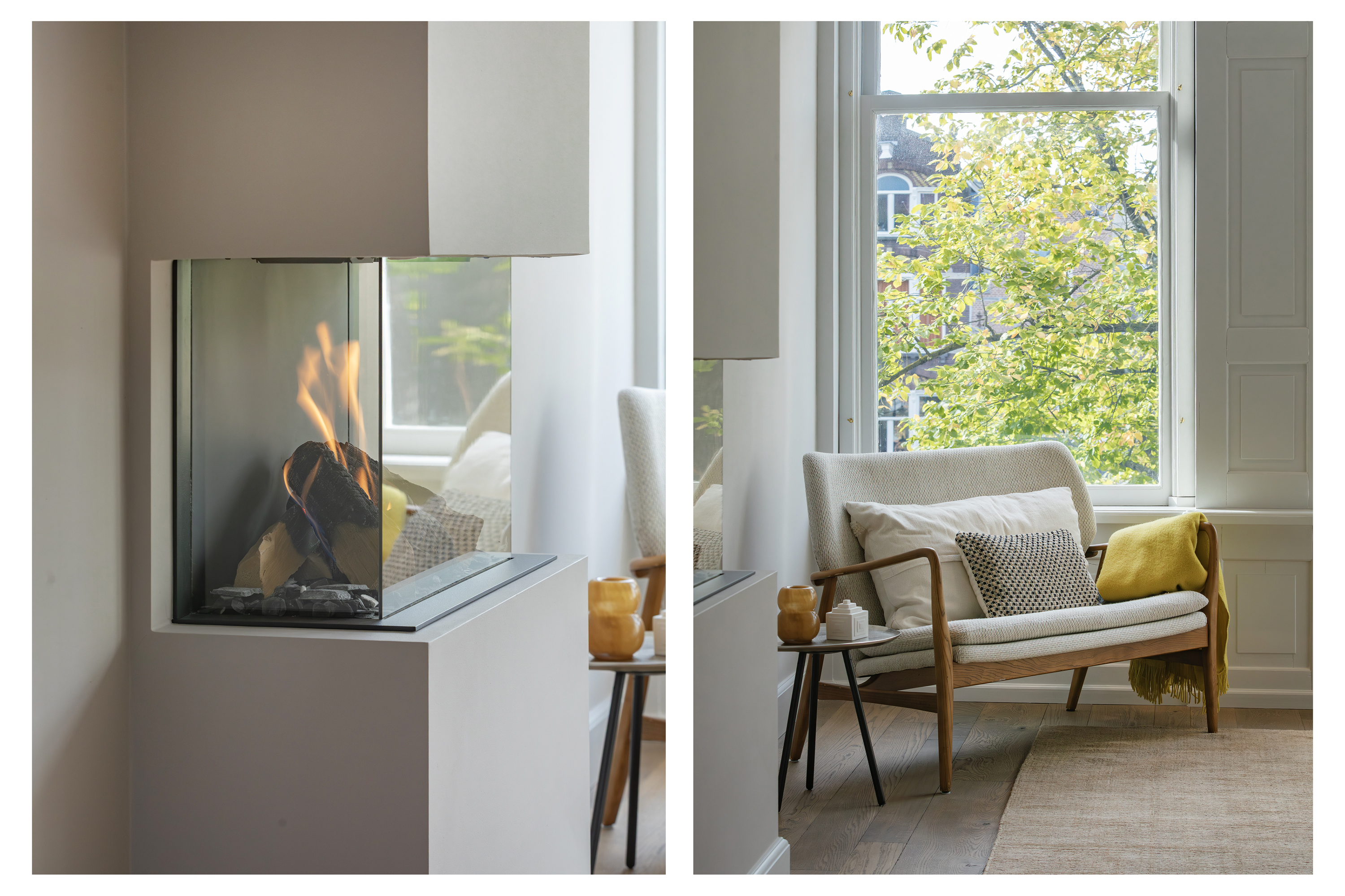 The living room is accessed via a passageway in which antique white tiles have been carefully preserved. The living room has a microcement floor and fireplace and a big tunnel gas fire. A wonderful sliding door gives access to a second patio with original tiling. Both the patios and skylights flood the living room with light. The ground floor is more than 30 metres long in total, which is unique for a canal property in Amsterdam.