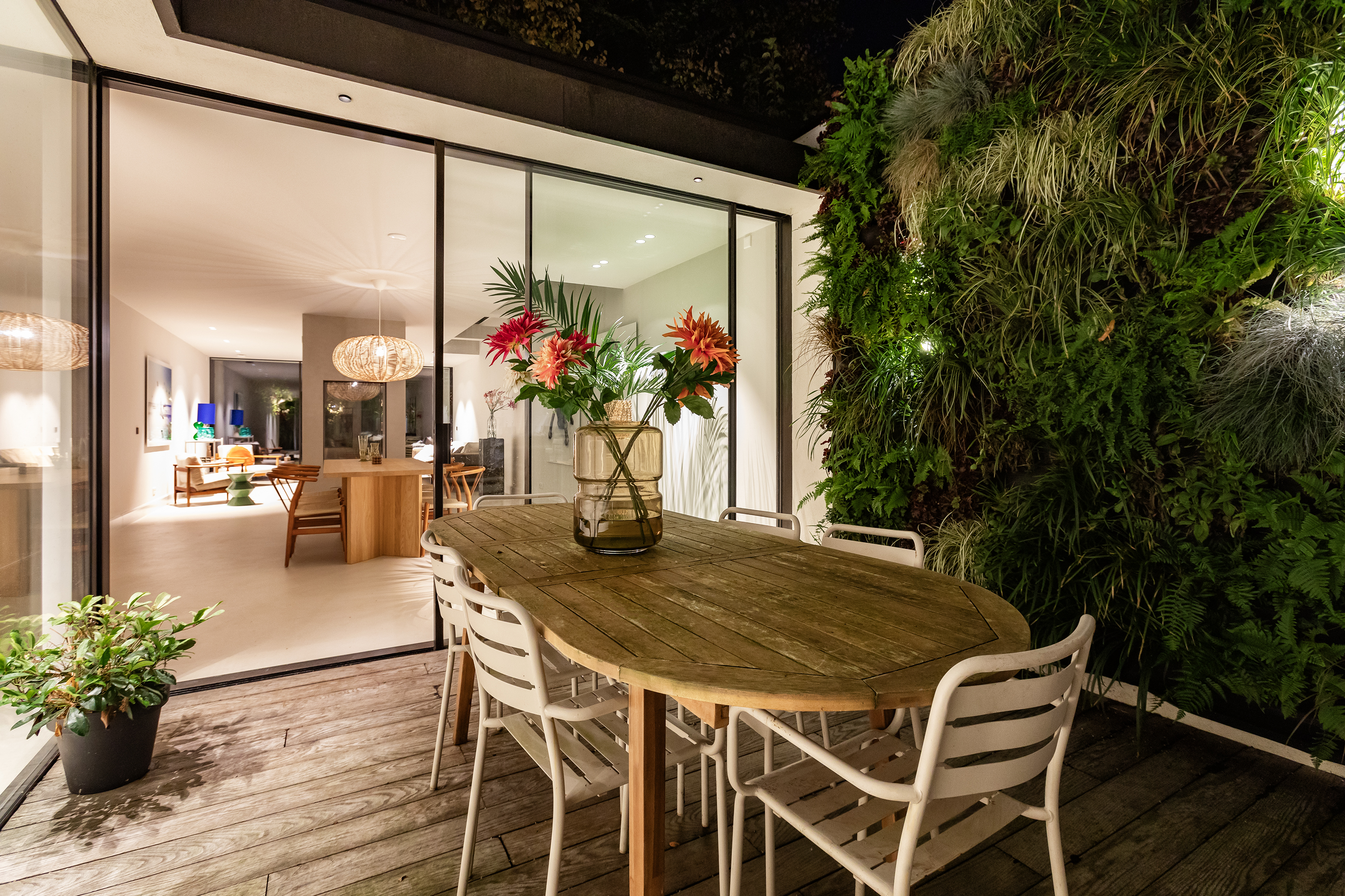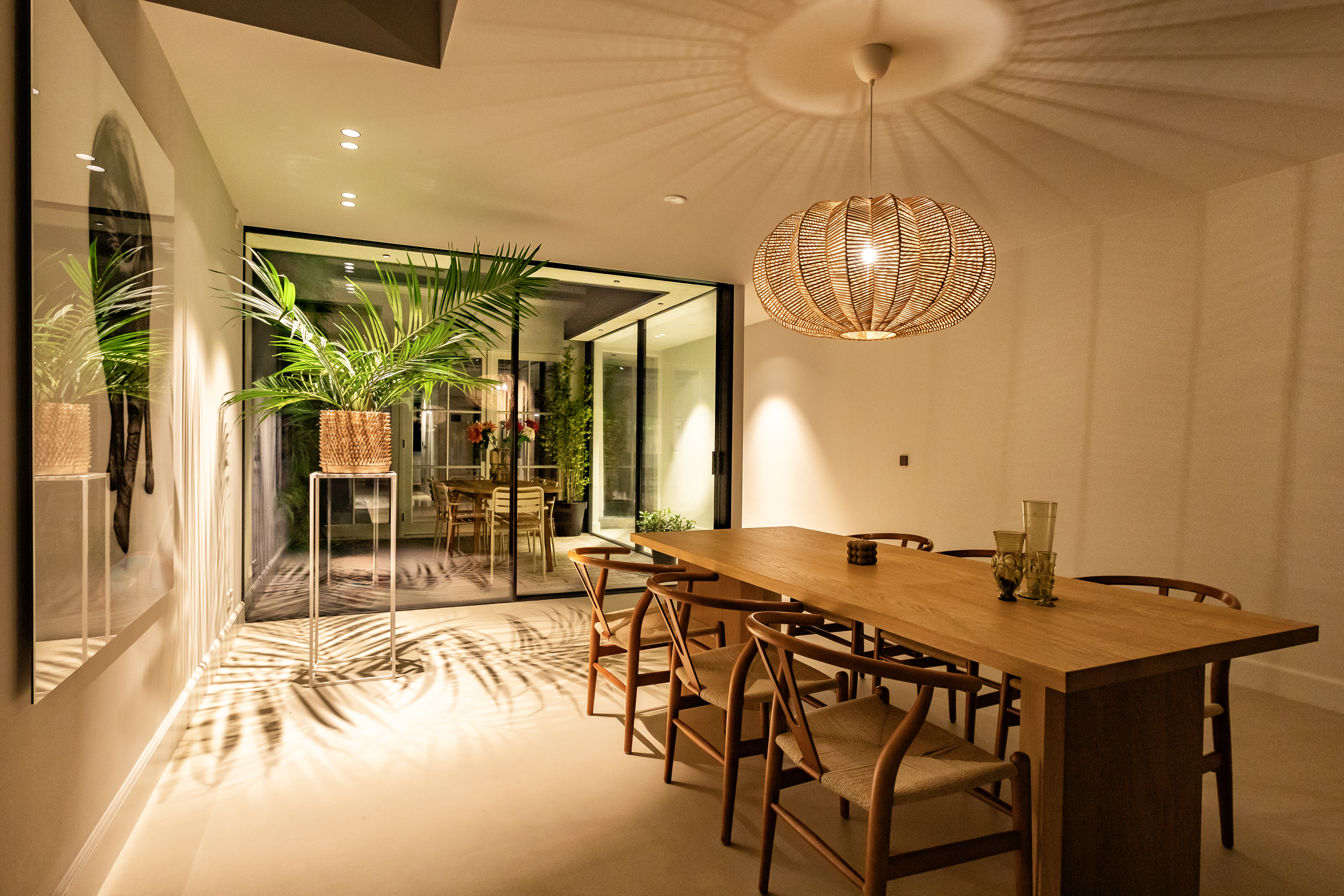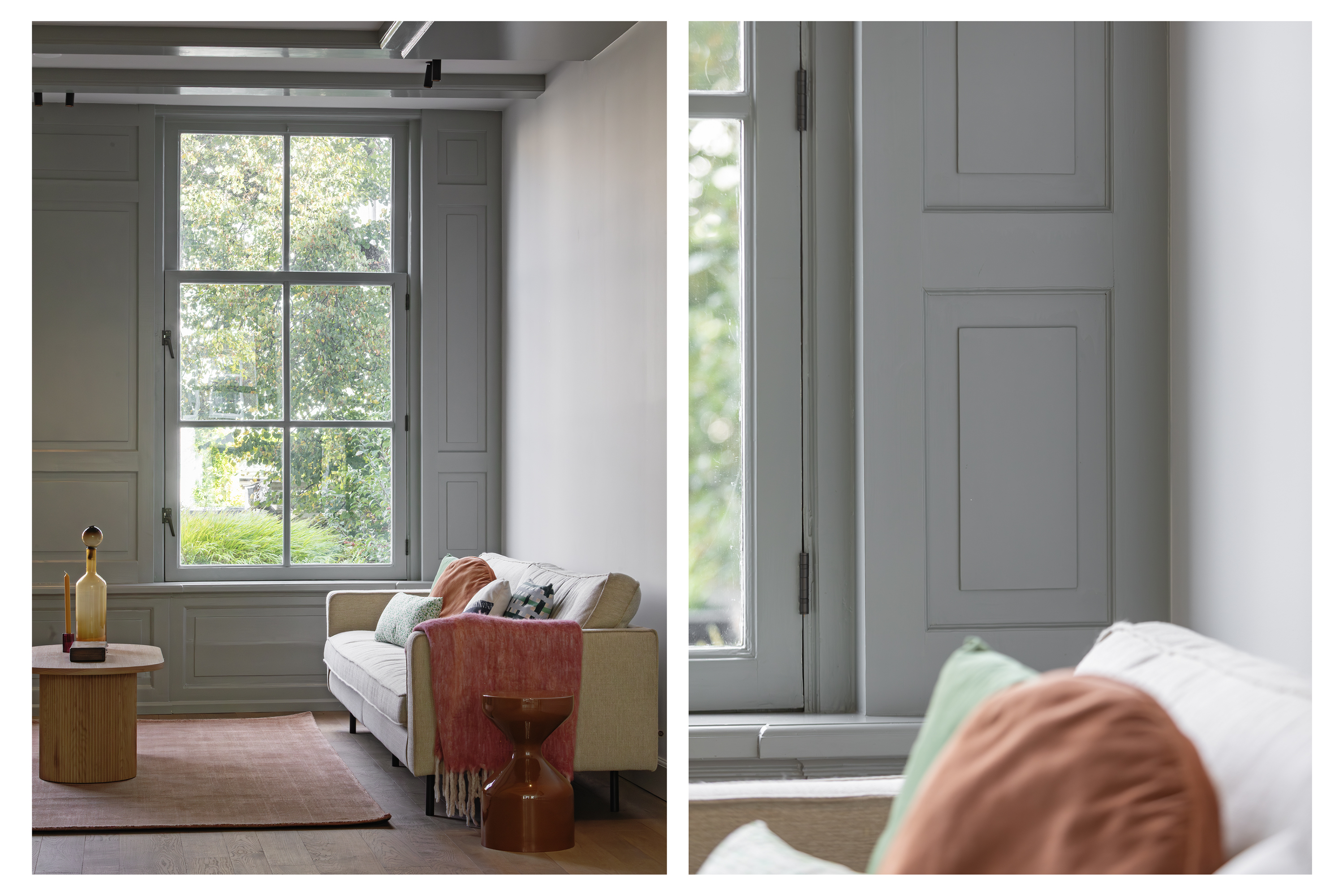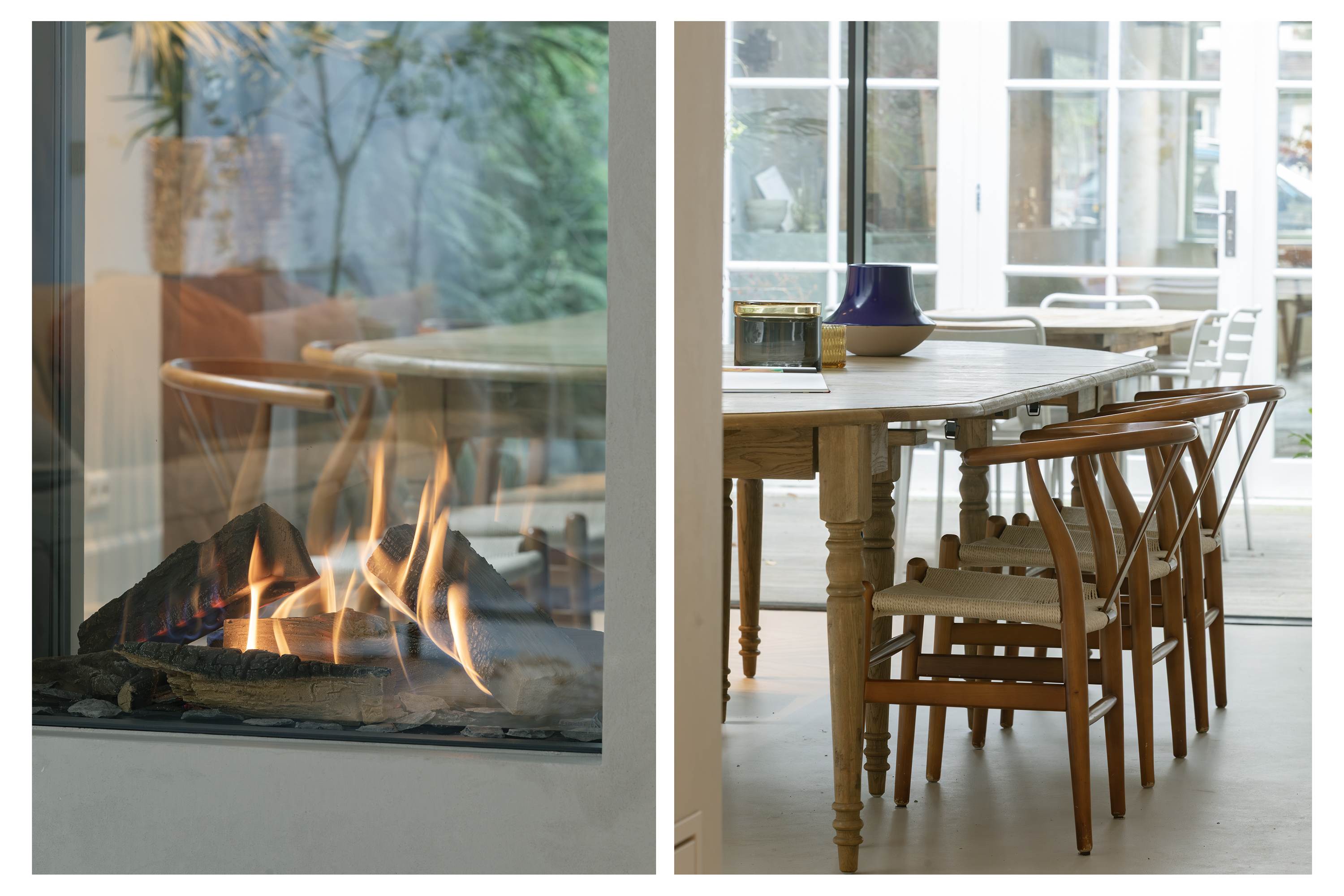 The living room is accessed via a passageway in which antique white tiles have been carefully preserved. The living room has a microcement floor and fireplace and a big tunnel gas fire. A wonderful sliding door gives access to a second patio with original tiling. Both the patios and skylights flood the living room with light. The ground floor is more than 30 metres long in total, which is unique for a canal property in Amsterdam.