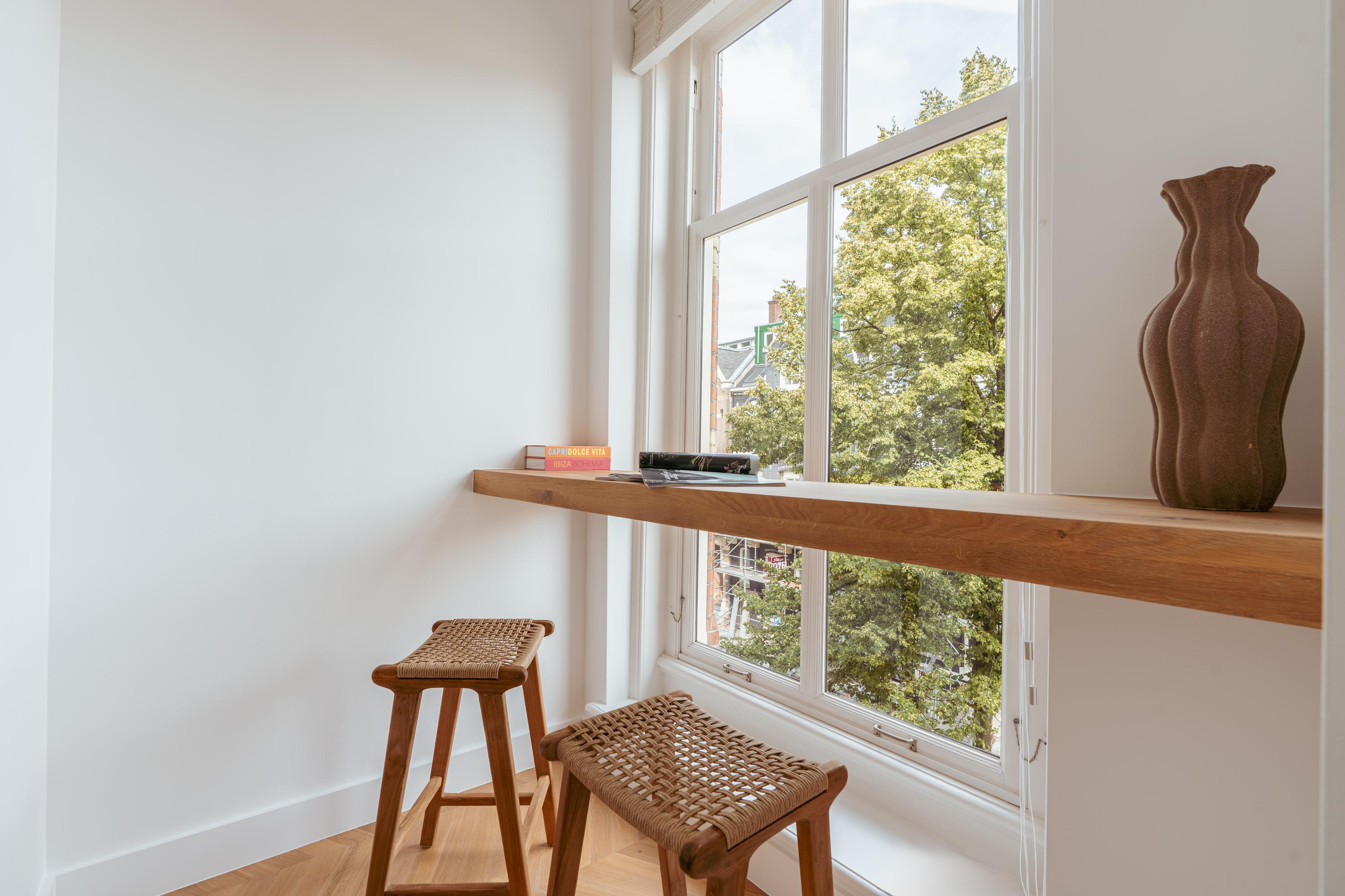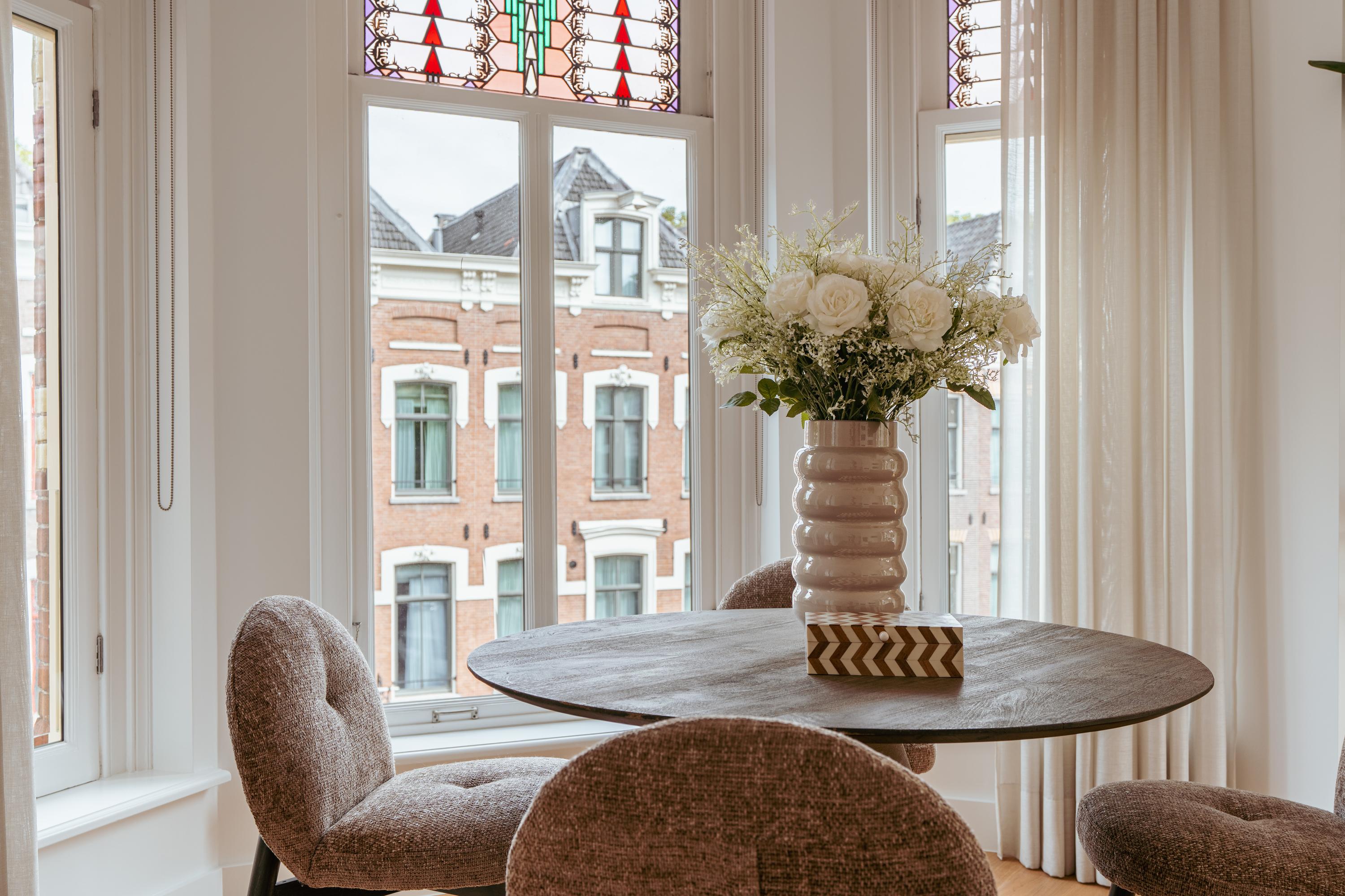 Apartment Amsterdam Vondelpark neighbourhood, measuring approximately 85 m², is set within a monumental building, offering a sense of quiet distinction in one of the city’s most beloved neighbourhoods. This second-floor residence has been fully renovated, with details such as over three-metre-high ceilings, elegant bay windows, and a wood-burning fireplace that anchor the main living space in calm, natural light. The layout is intuitive—a spacious hall connects all rooms. Two generously sized bedrooms each have private en-suite bathrooms with walk-in showers and thoughtful built-in wardrobes. The semi-open kitchen, equipped with luxury integrated appliances and a bar counter, invites both casual mornings and evenings shared with friends. Mechanical ventilation, underfloor heating, and lift access further elevate day-to-day comfort. Freehold tenure affords peace of mind.