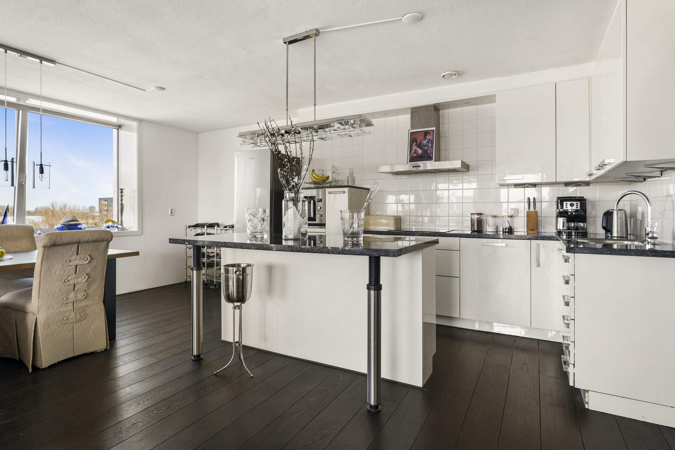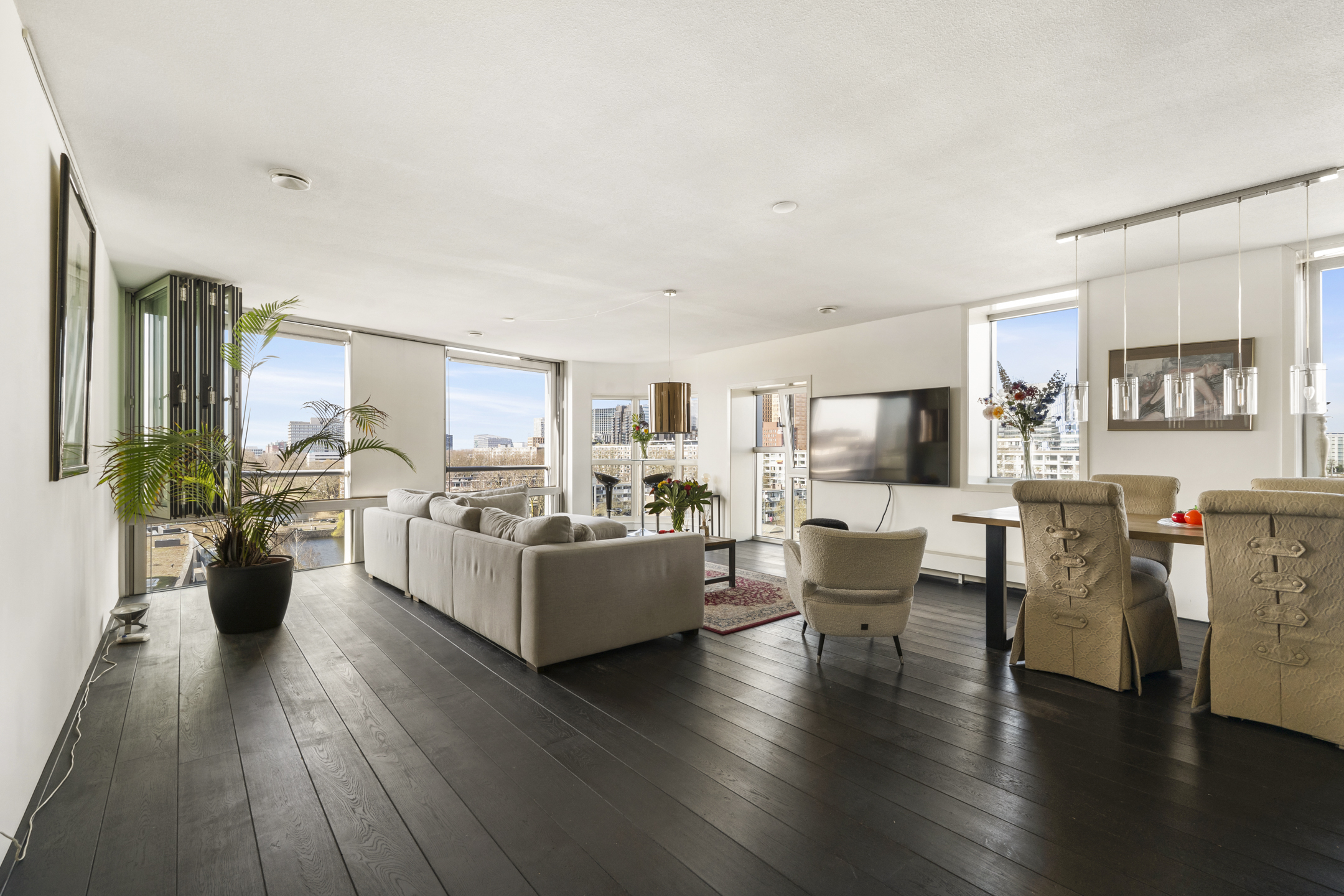 Apartment Amsterdam on the seventh floor of the Gelderhof complex offers 117 m² of refined living space and panoramic views over the water and the Zuidas skyline. This corner residence is designed for abundant natural light, with southwest and north-facing floor-to-ceiling windows that frame the city and waterfront vistas. The property features two spacious bedrooms, currently configured as a main suite with walk-in closet, a luminous living area with glass walls and fold-away façade, and a high-spec kitchen with island, solid oak parquet, and built-in appliances, all executed with clarity and purpose.