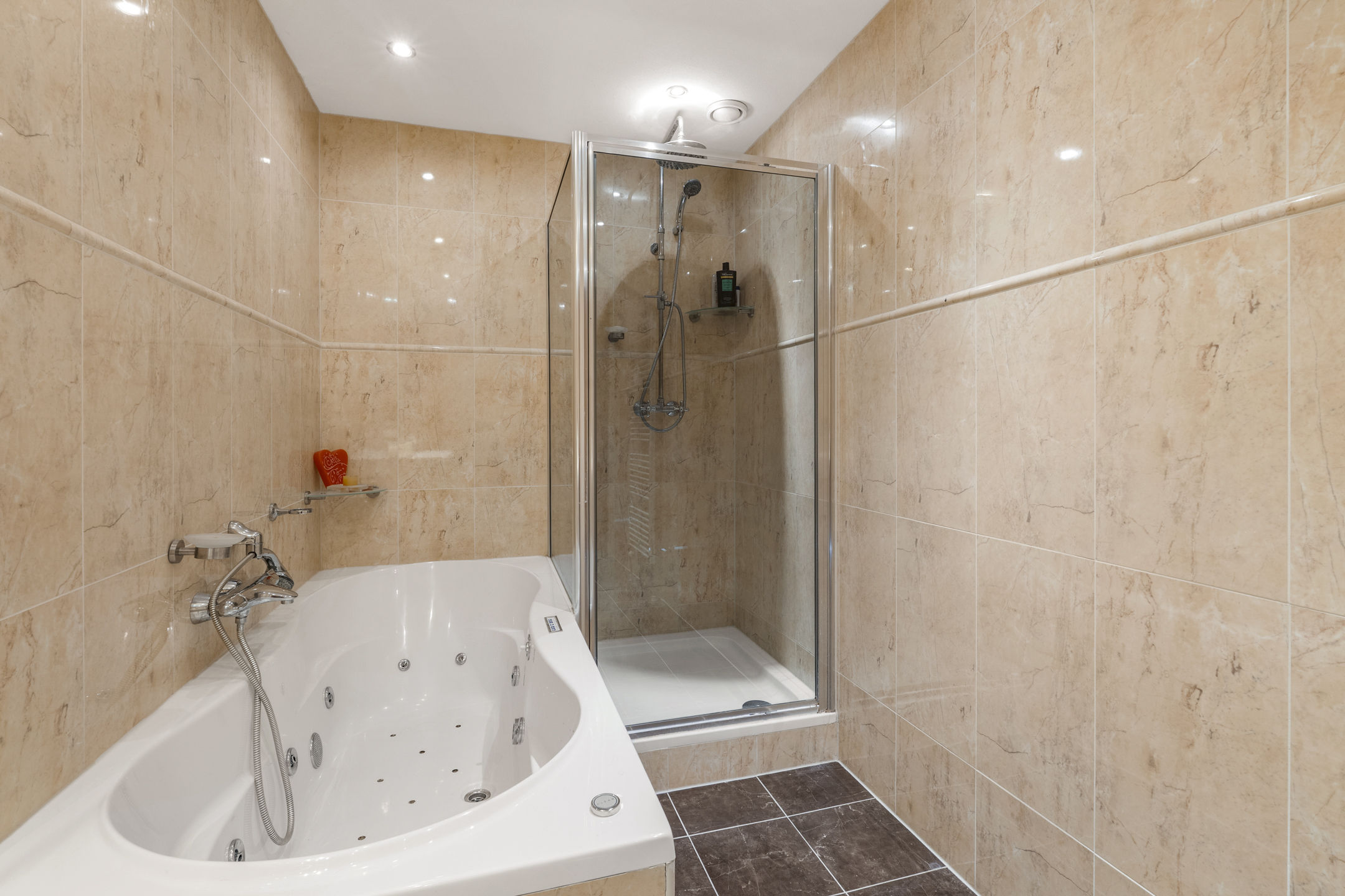 The bathroom is finished in light materials and includes a double vanity, rain shower, and whirlpool bath. Electric sun screens on the main windows provide comfort on sunny days. Residents benefit from a private storage unit, shared bicycle facility, and access to an optional parking space in the secure underground garage, available for €59,000. The building, completed in 2004, is professionally managed and includes lift access and a ground floor gym.