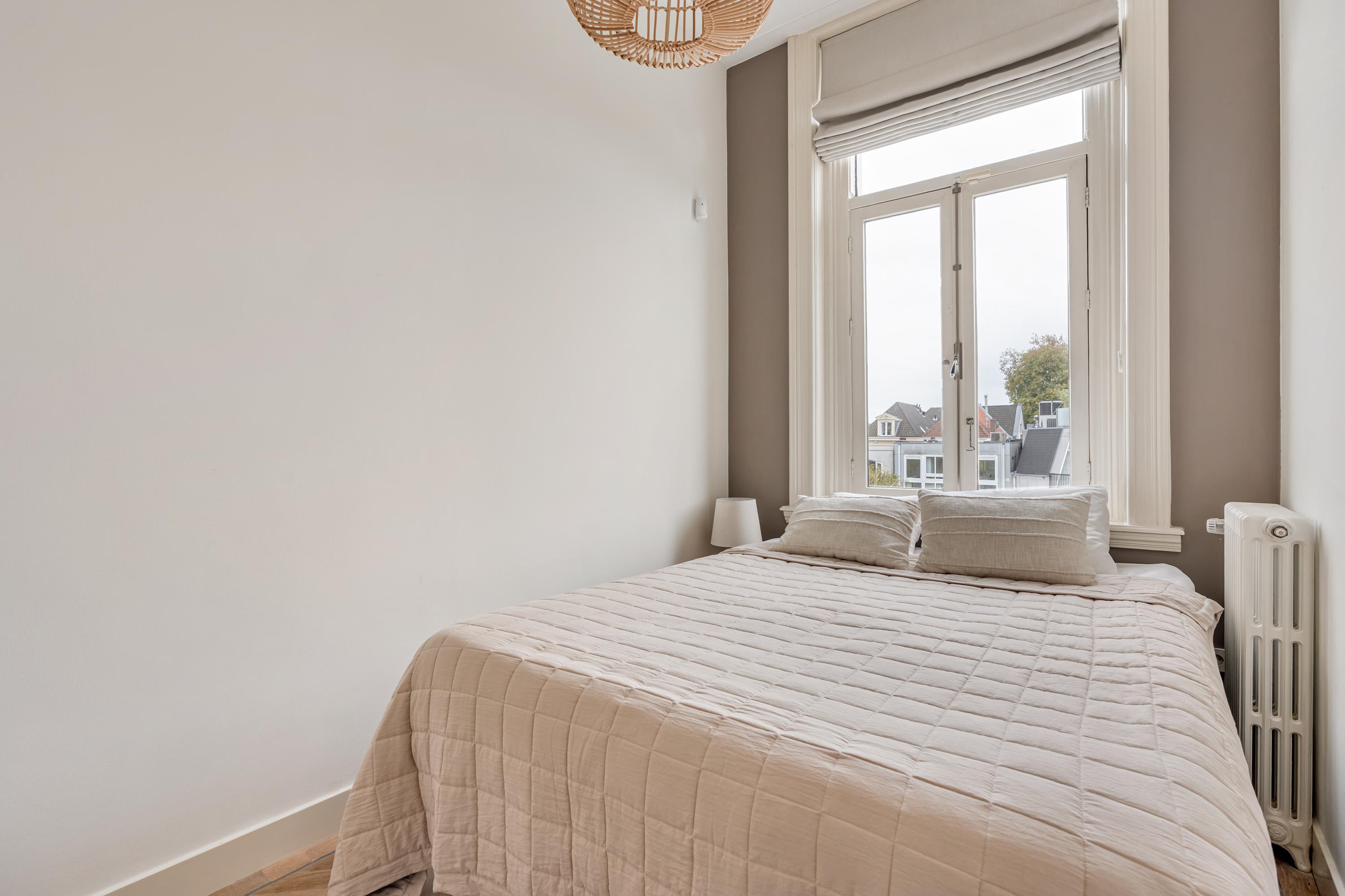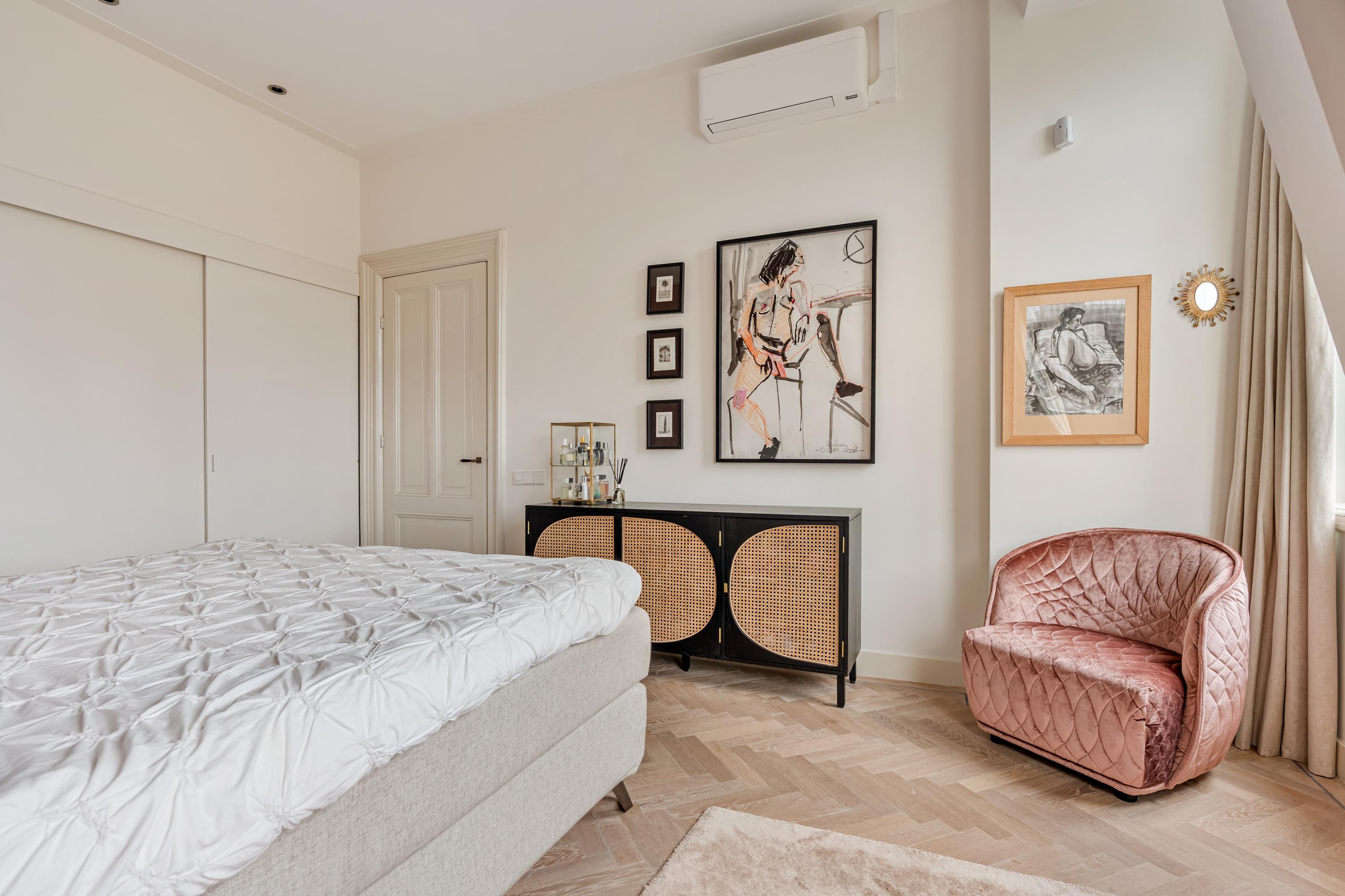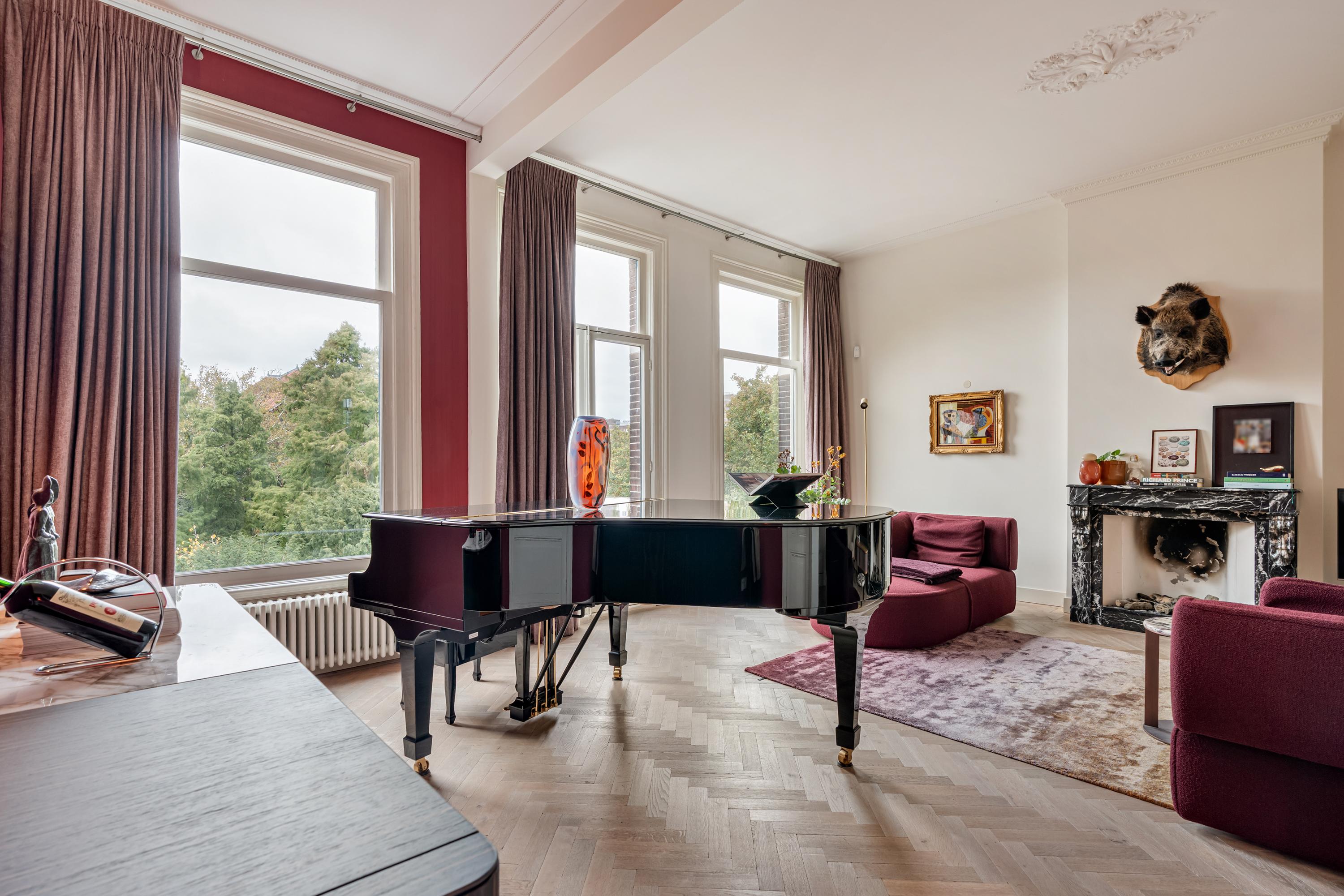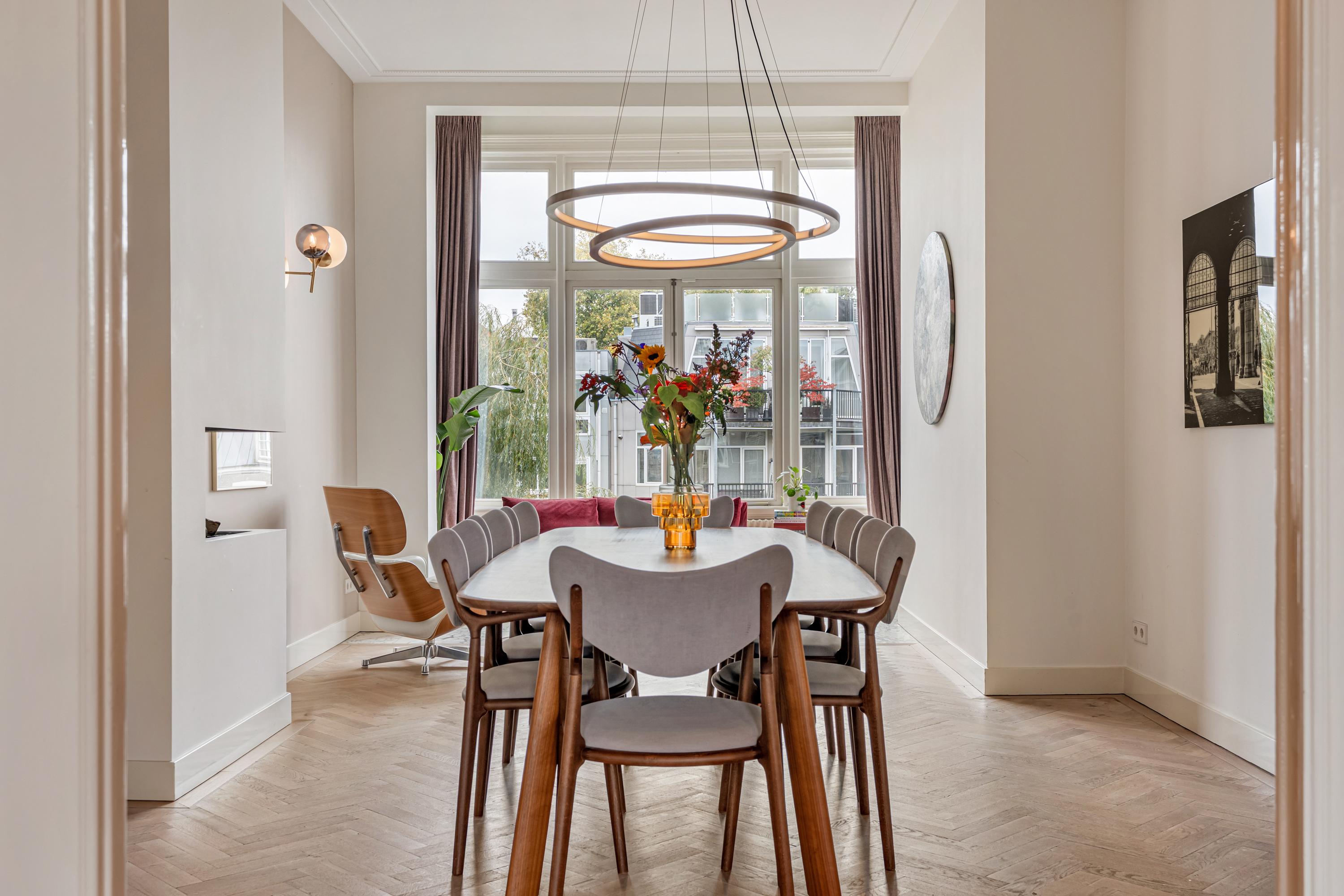 On the distinguished Vossiusstraat, directly bordering the Vondelpark, lies this remarkable upper residence of approximately 183 m², spread over two floors and featuring several outdoor spaces, including a spacious roof terrace of no less than 59 m². The home combines the character of a classic Amsterdam townhouse with the comfort of a modern residence. High ceilings with original ornaments, a light herringbone floor, wooden en-suite doors and marble details give the interior timeless elegance, while the layout and finish create a sense of calm and warmth.