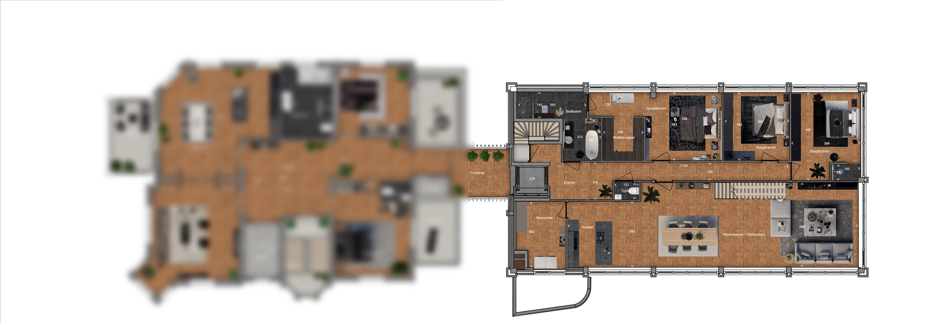 De woonkamer is zeer royaal van opzet en biedt meer dan voldoende ruimte voor een grote woonkeuken met kookeiland en bar. Daarnaast is er ruimte voor een kastenwand met geïntegreerde deur naar de bijkeuken, waar de aansluitingen voor wasmachine en droger kunnen worden geplaatst. Dit zorgt voor een praktische en stijlvolle indeling waarbij wonen en functionaliteit mooi samenkomen.
