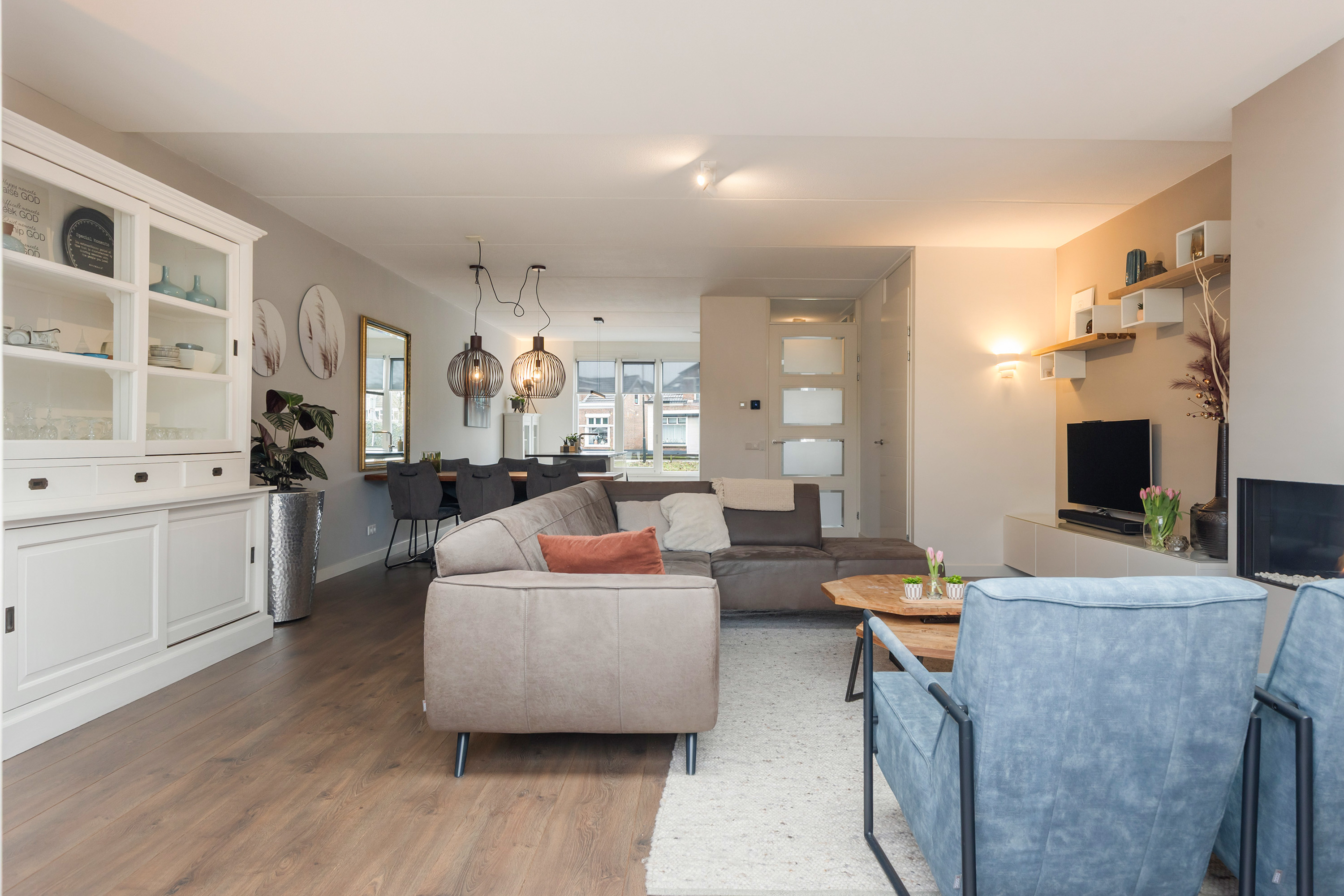Binnen ervaart u direct de royale opzet en de moderne afwerking. De uitgebouwde living en de woonkeuken vormen samen een lichte, open leefruimte waarin het uitzicht en het daglicht een hoofdrol spelen. Grote raampartijen, deur naar de tuin en een luxe lichtstraat zorgen voor een constante verbinding tussen binnen en buiten. De gashaard in de woonkamer voegt warmte en sfeer toe en onderstreept het moderne, maar tegelijkertijd uitnodigende karakter van de woning.