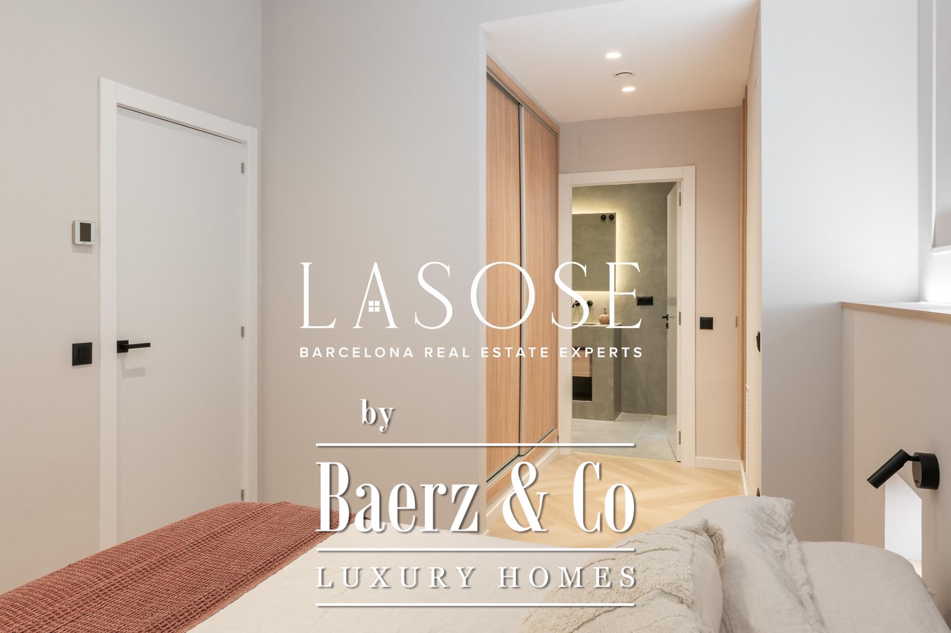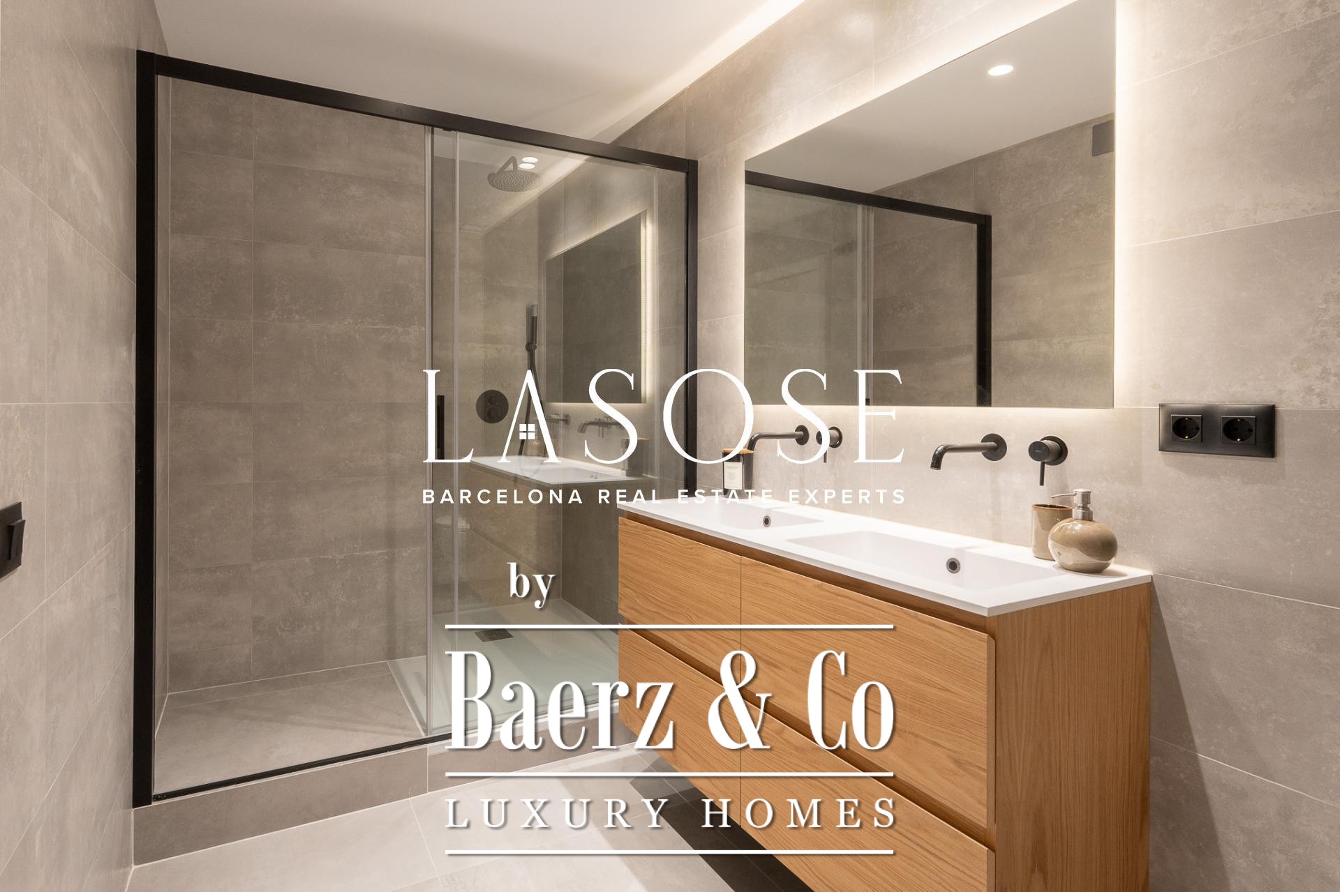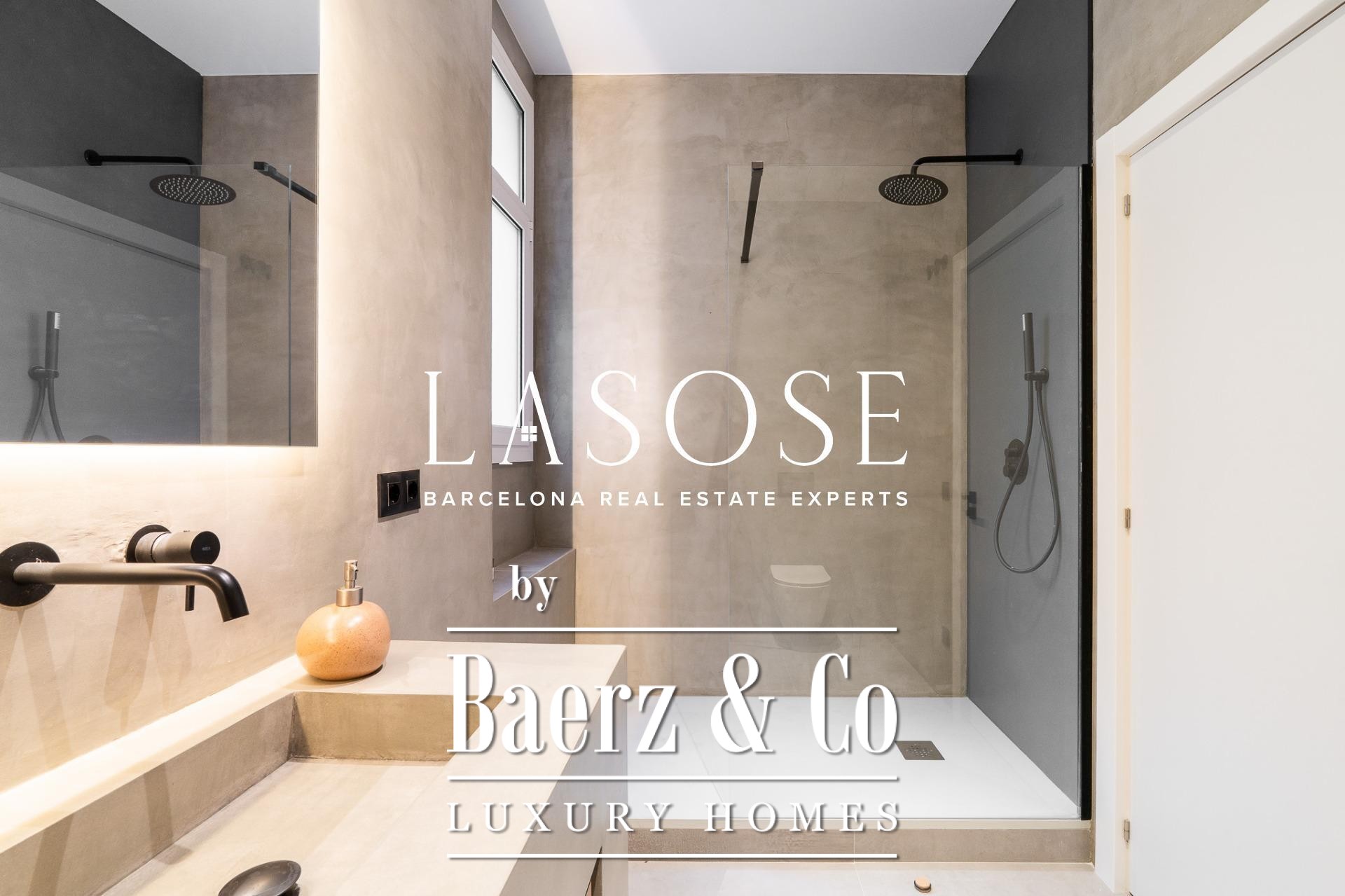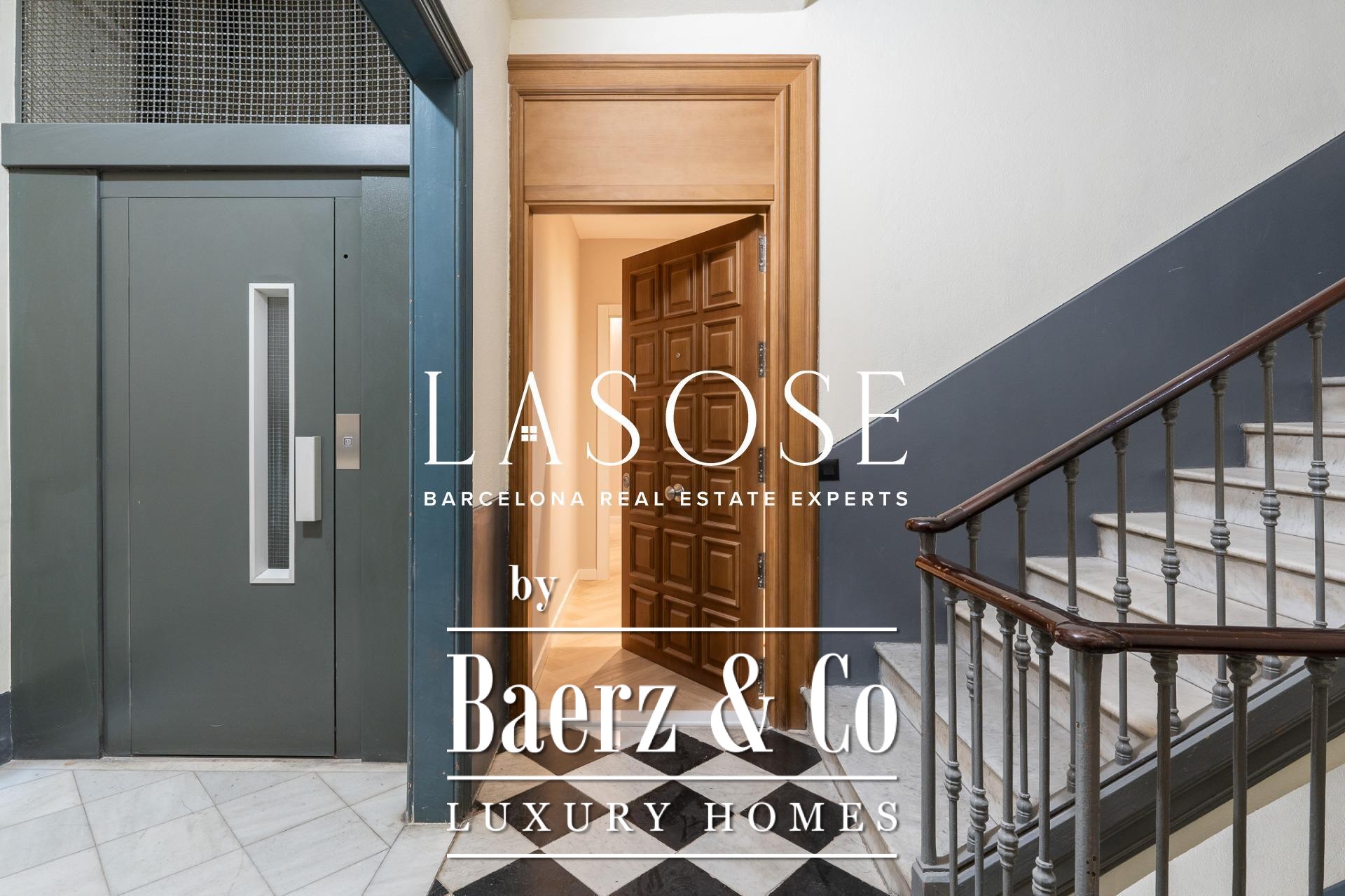 Three bedrooms, including a master suite with private bathroom and separate dressing room, are complemented by fitted wardrobes and custom carpentry. Comfort is assured through aerothermal air conditioning and double-glazed wooden windows. Residents benefit from the convenience of an elevator, concierge service, video intercom, and secure armored door. The long-tail variation luxury apartment for sale in Barcelona is well-suited for those who value discretion and design.
