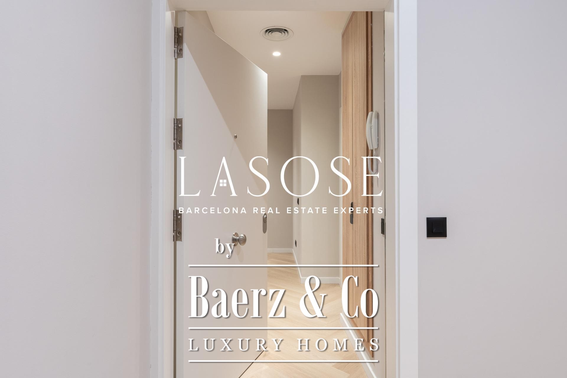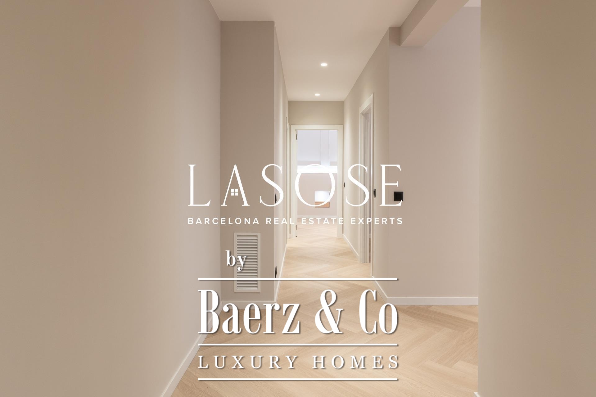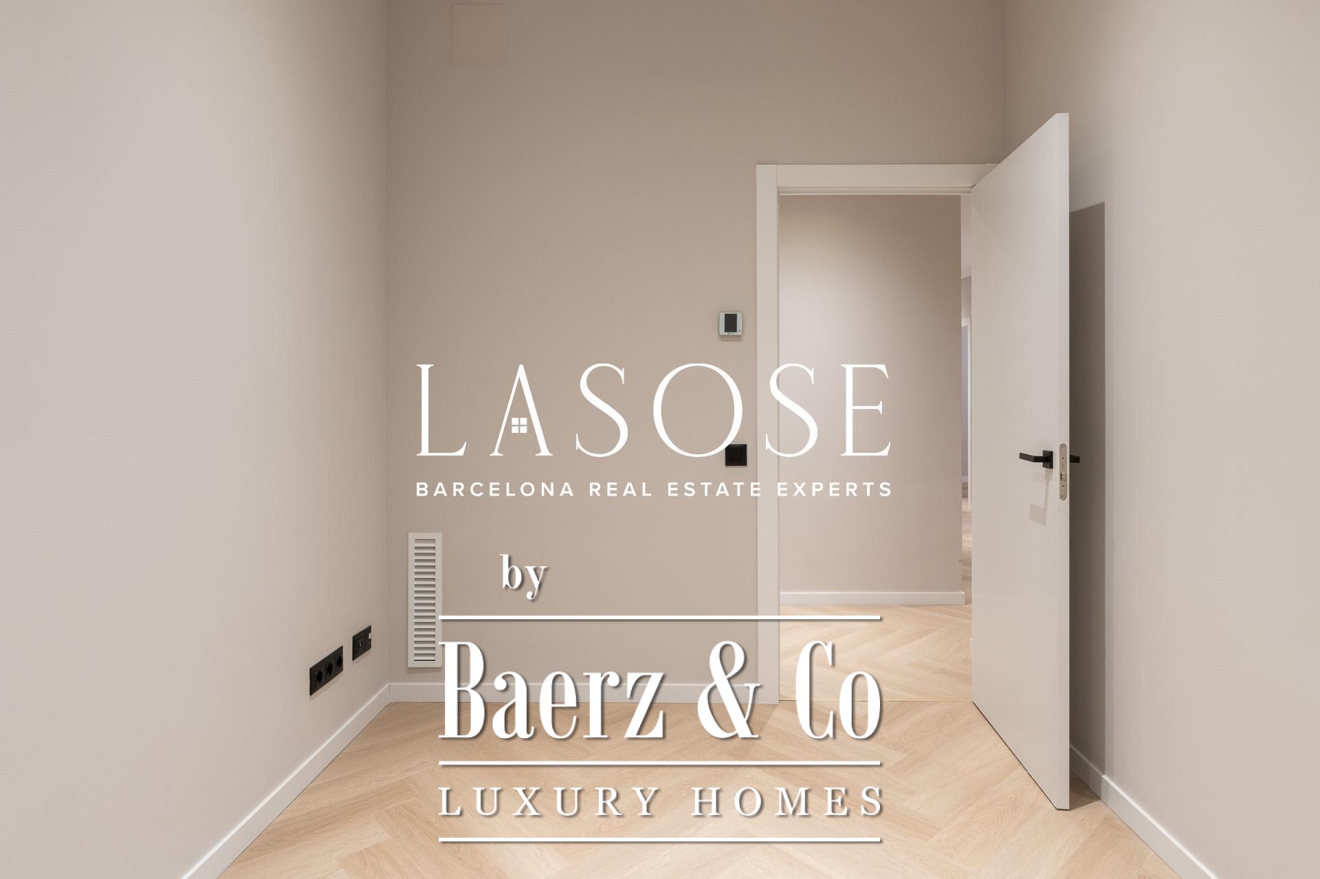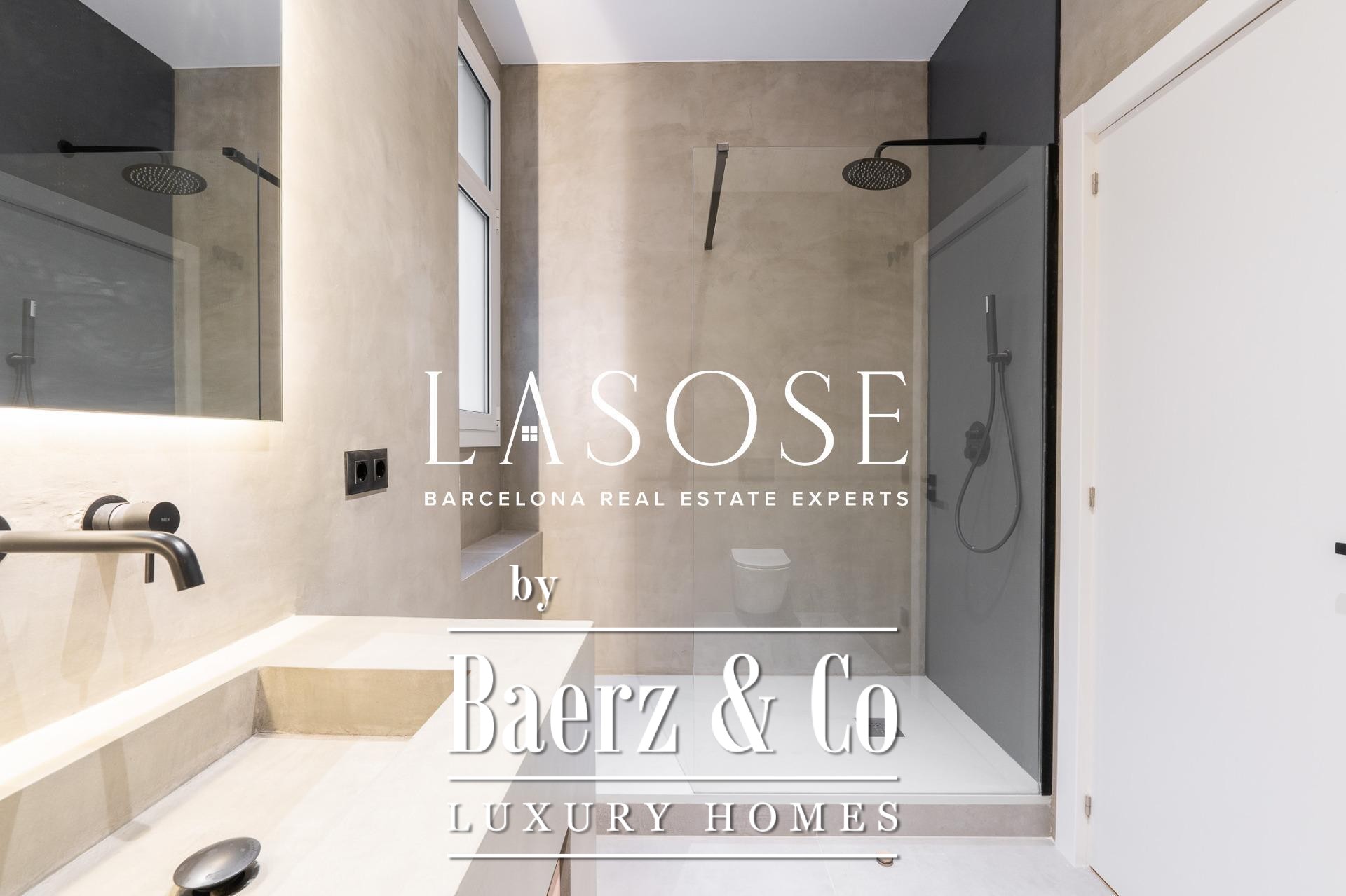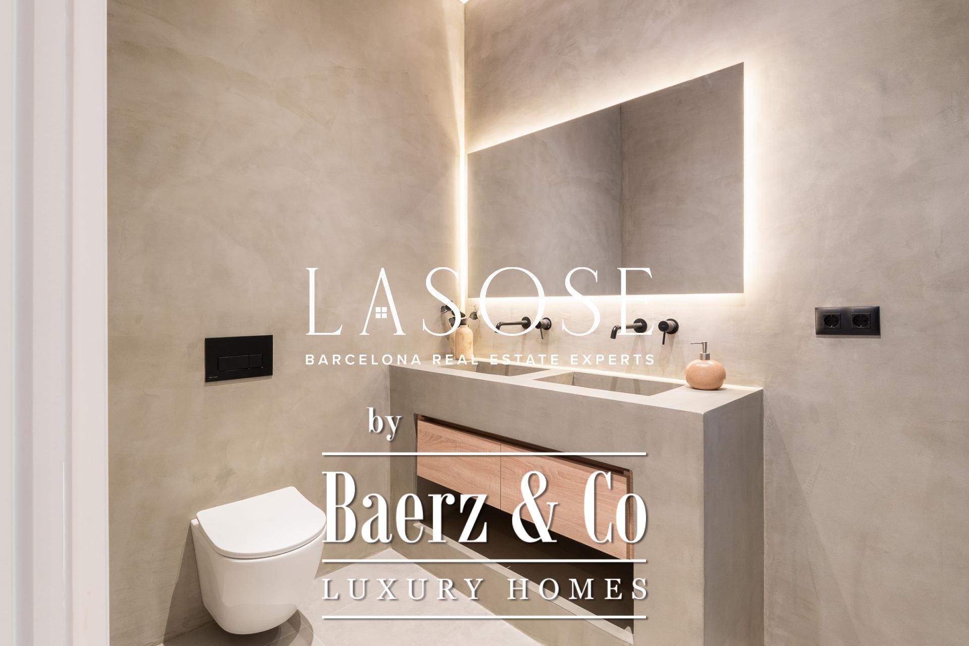 Three bedrooms, including a master suite with private bathroom and separate dressing room, are complemented by fitted wardrobes and custom carpentry. Comfort is assured through aerothermal air conditioning and double-glazed wooden windows. Residents benefit from the convenience of an elevator, concierge service, video intercom, and secure armored door. The long-tail variation luxury apartment for sale in Barcelona is well-suited for those who value discretion and design.