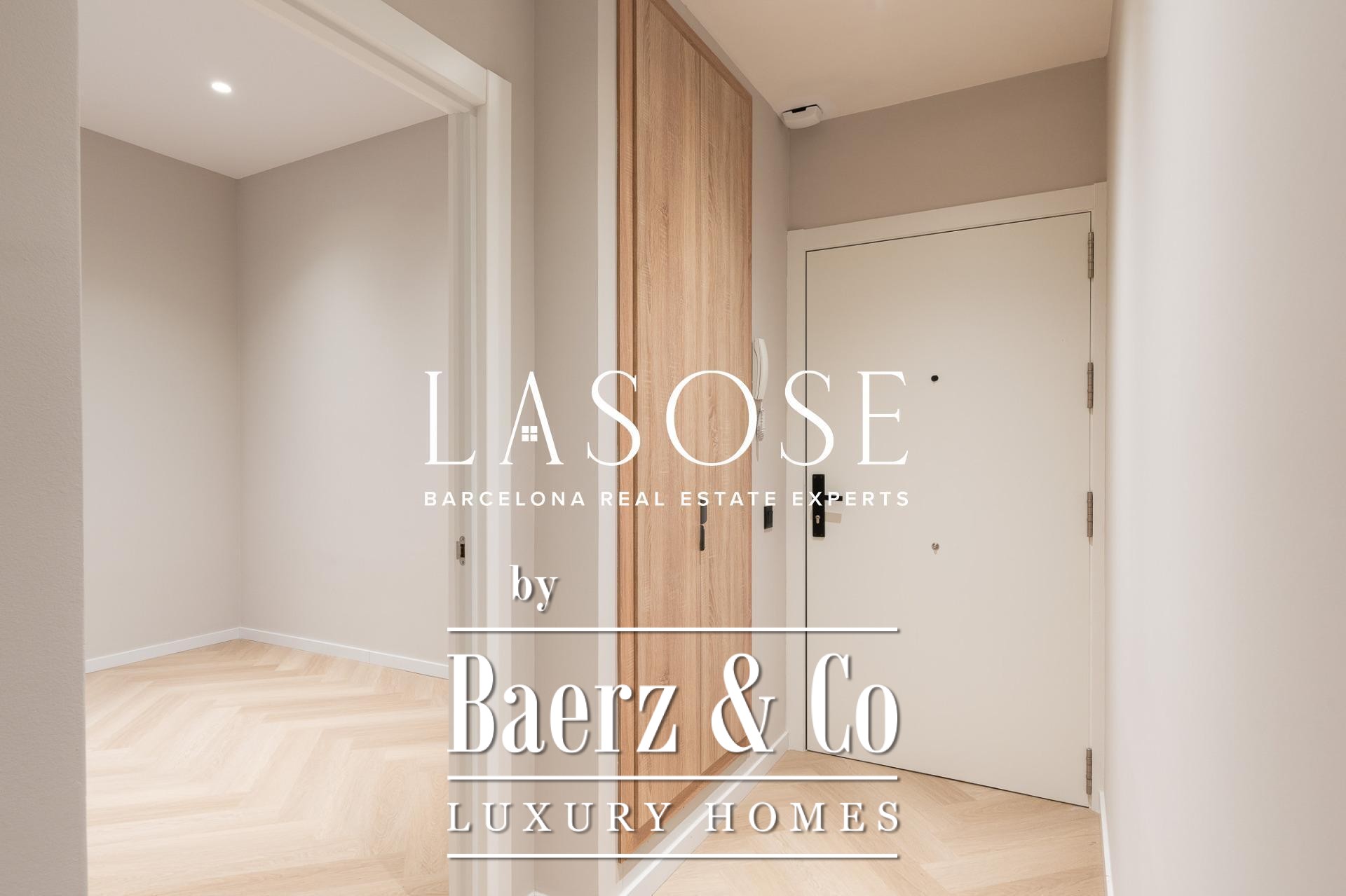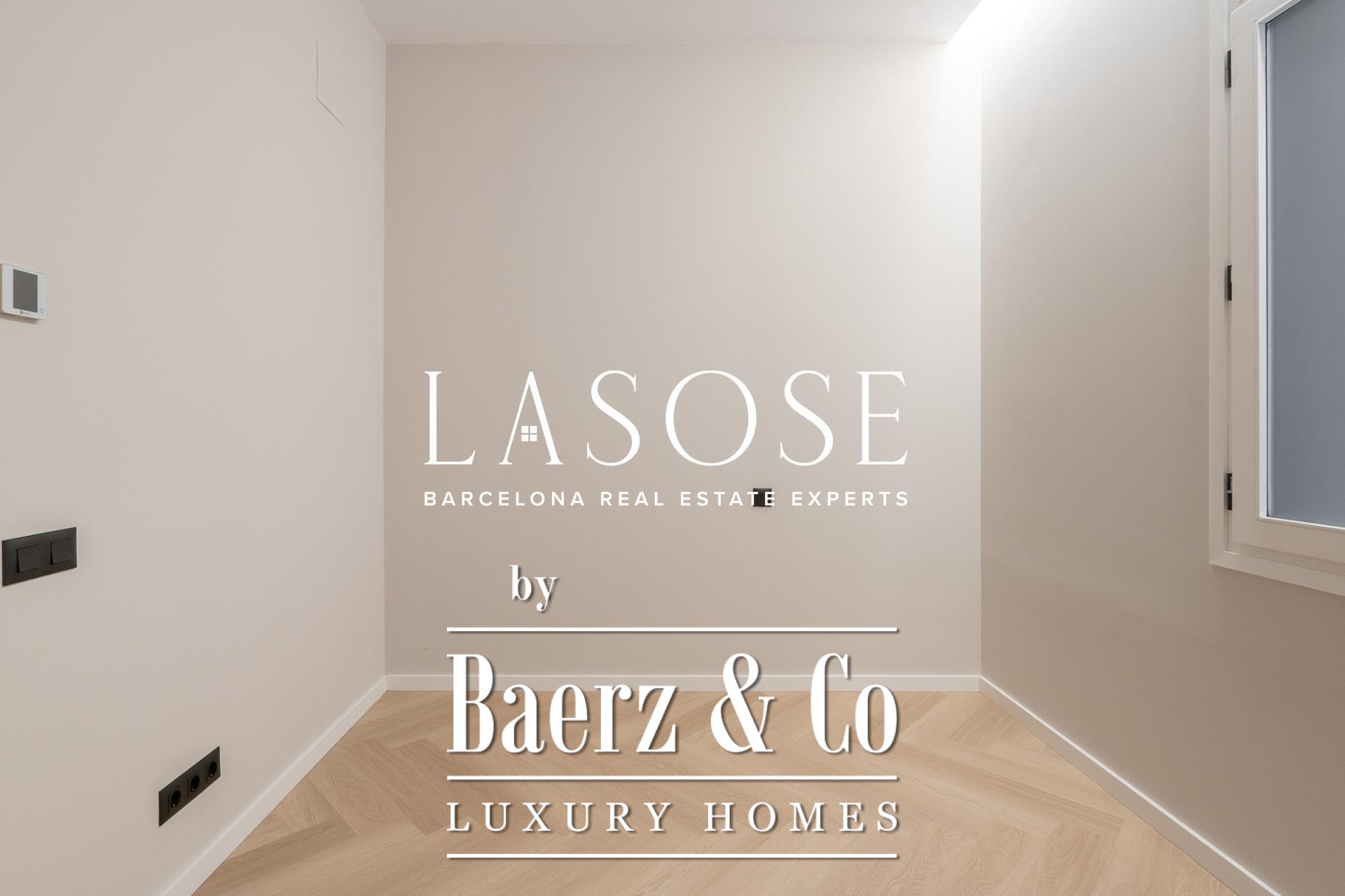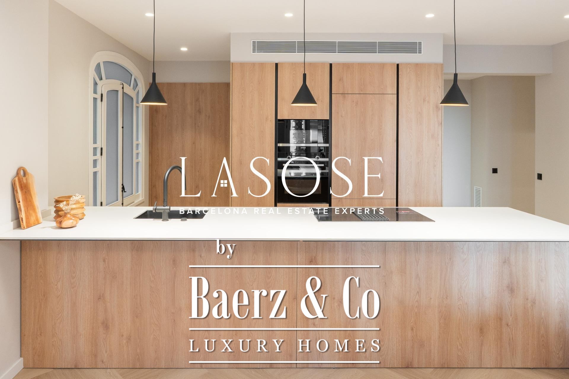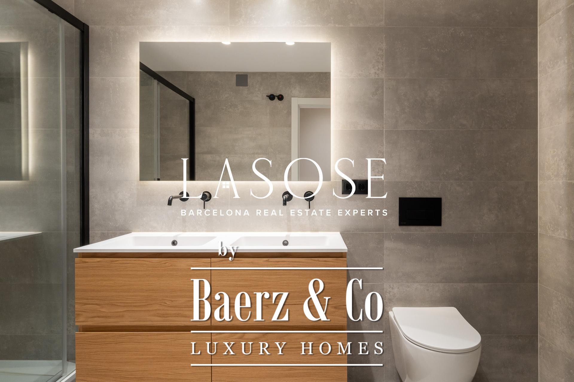 Three bedrooms, including a master suite with private bathroom and separate dressing room, are complemented by fitted wardrobes and custom carpentry. Comfort is assured through aerothermal air conditioning and double-glazed wooden windows. Residents benefit from the convenience of an elevator, concierge service, video intercom, and secure armored door. The long-tail variation luxury apartment for sale in Barcelona is well-suited for those who value discretion and design.