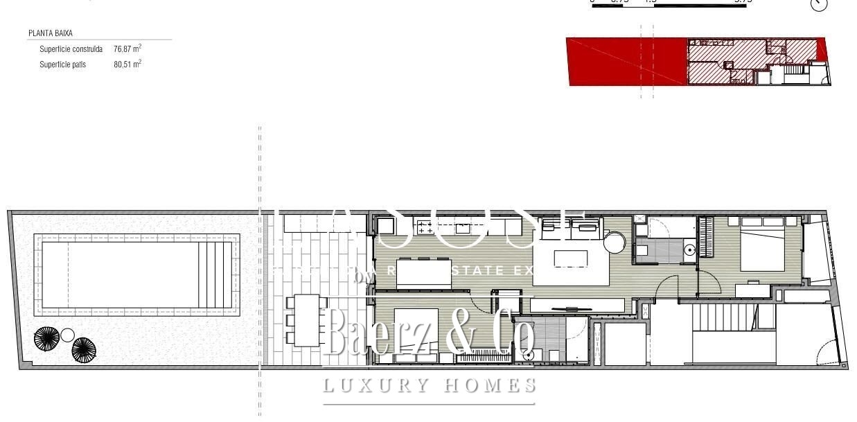 LASOSE presents just a few steps from the Rambla del Poblenou, this spectacular first floor apartment, which combines comfort, design and an excellent location. . . This exceptional ground floor of 77 m2 built surface + 80 m2 of garden has 2 spacious bedrooms and 2 bathrooms. The master bedroom is a bright suite with direct access to the private garden, where natural light floods every corner, creating a warm and cozy atmosphere.. . The kitchen, modern in style, is fully equipped with high-end appliances, designed to enjoy both day to day and special occasions. . . The air conditioning system works through aerothermal energy, the most efficient renewable energy technology on the market, providing hot water, heating and air conditioning in a sustainable way.. . Outside, the private garden is a true urban oasis. It will have a summer kitchen ideal for celebrations and unforgettable moments outdoors. In the background, an elegant swimming pool surrounded by greenery, decorative trees and high quality artificial grass, brings a touch of freshness and exclusivity to the whole.. . The images
