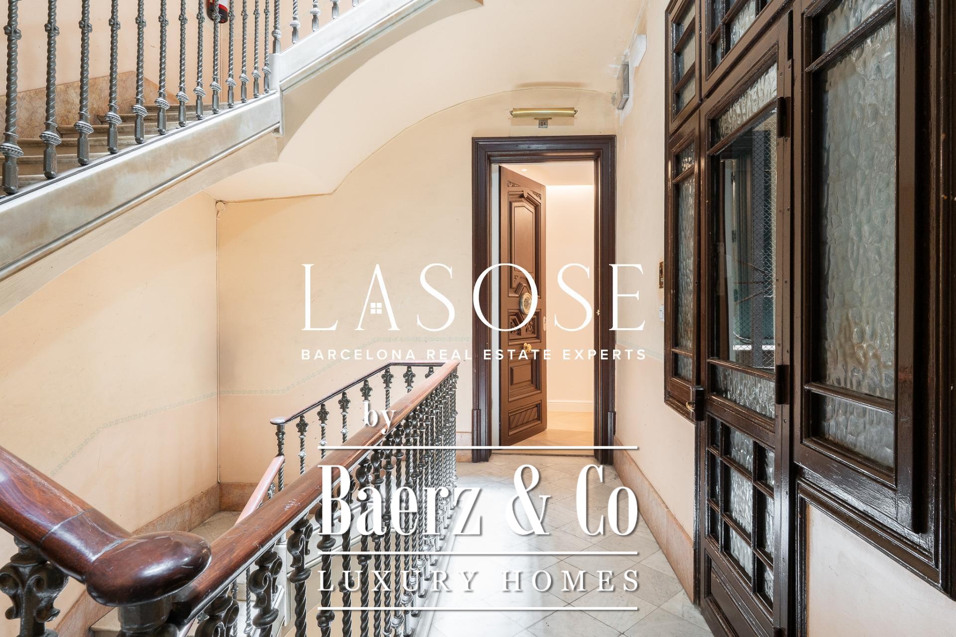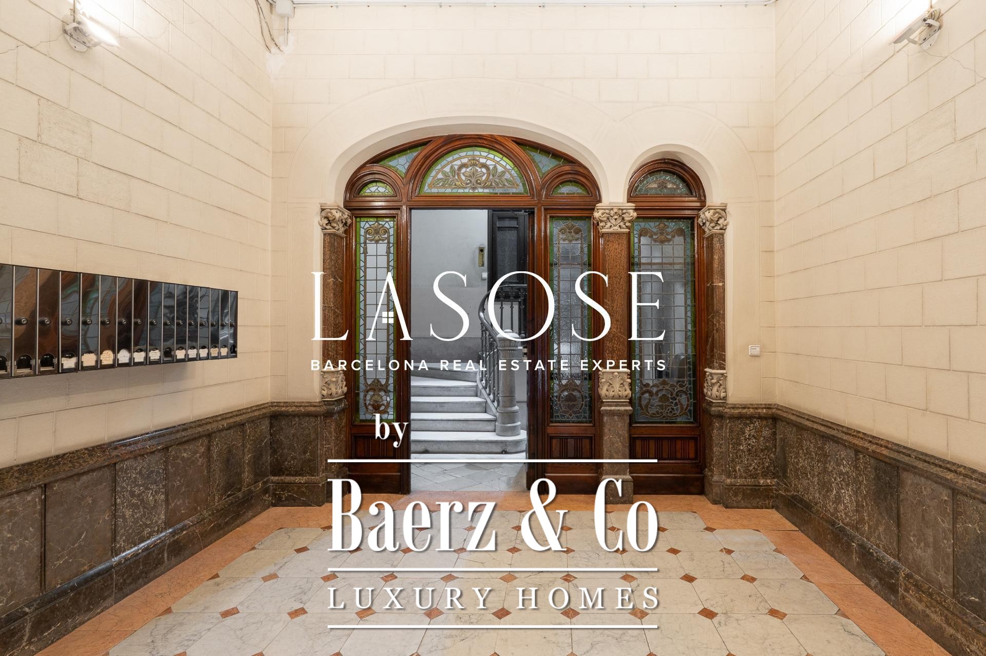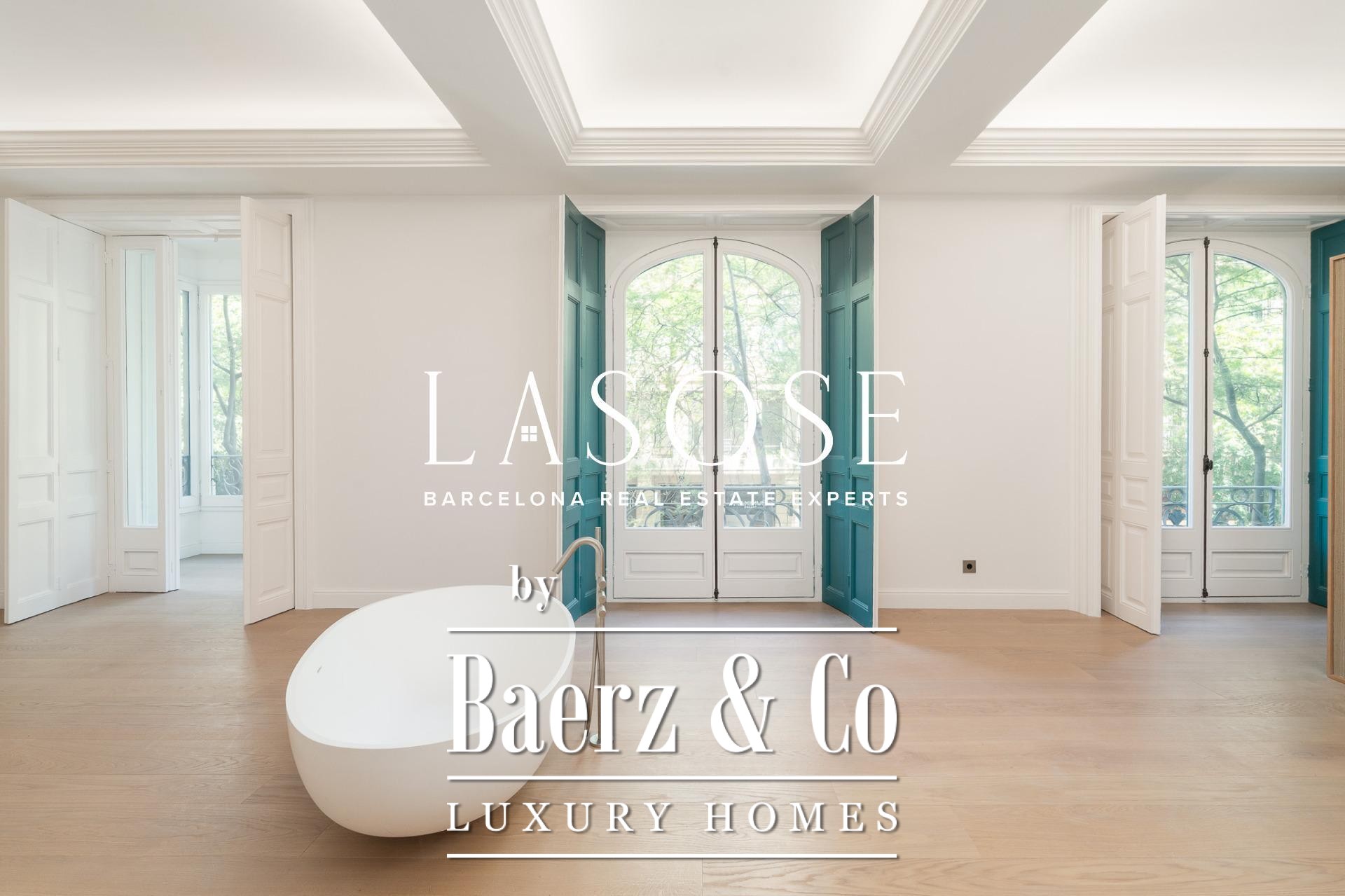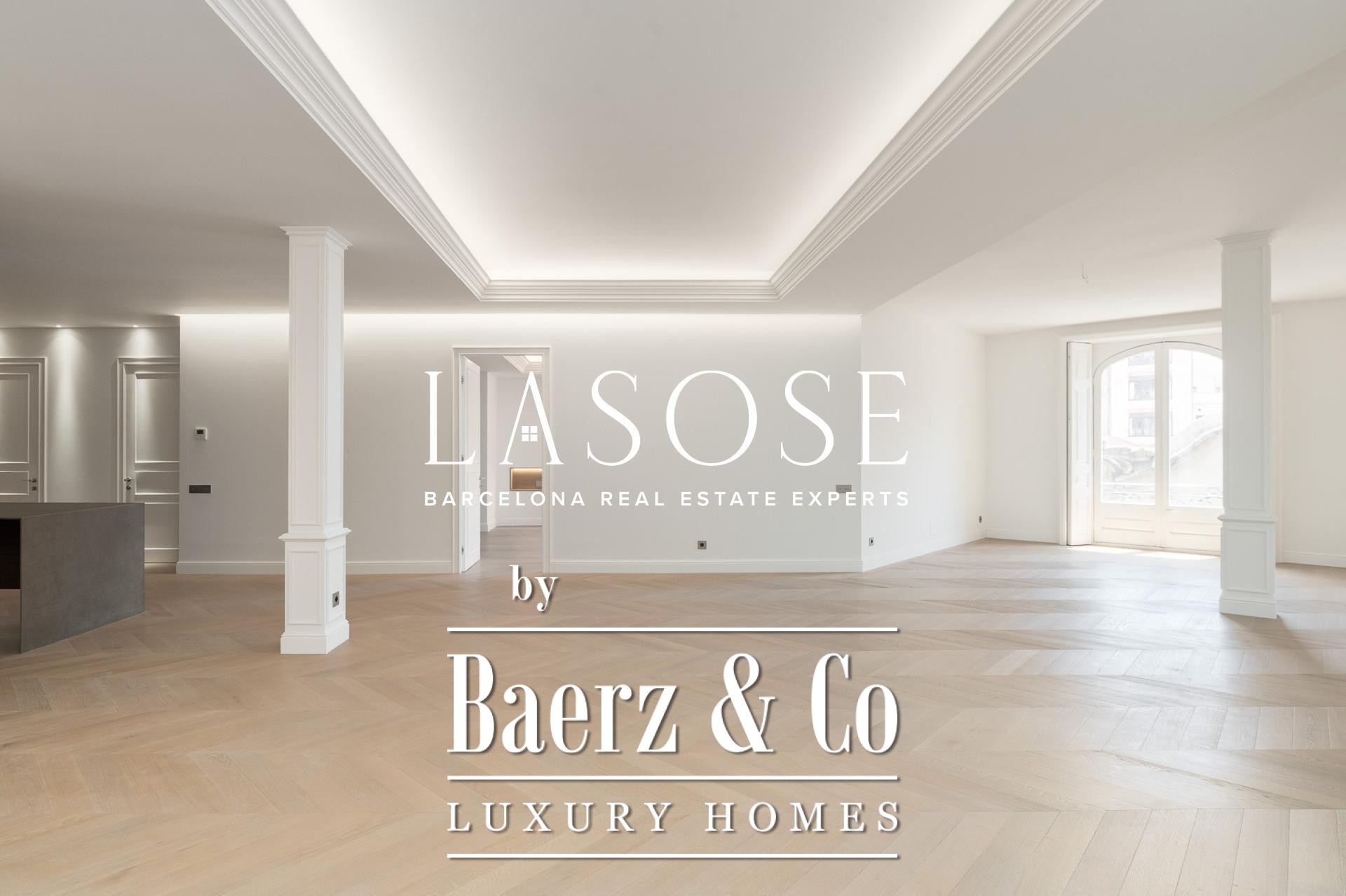 LASOSE presents this magnificent 347 m² property, completely renovated, which combines the charm of a classic estate with the comfort and sophistication of contemporary design. Located in an elegant regal estate dating from 1885, with elevator and in excellent condition, this property offers a unique experience in one of the most vibrant areas of the city.. . Located on the interfloor and with ceilings of 3.2 meters high, the apartment enjoys an exceptional luminosity thanks to its views to two streets and its southeast orientation. From the entrance, it surprises with a spectacular welcome area adorned with modernist details that make the difference.. . The day area consists of a large living-dining room with open kitchen, equipped with a central island space for six diners, ideal for meetings and dinners. This space is complemented by an elegant office, a guest toilet and a practical laundry area with washing machine, dryer and storage cabinets.. . The jewel of the home is its impressive 60 m² master suite, which