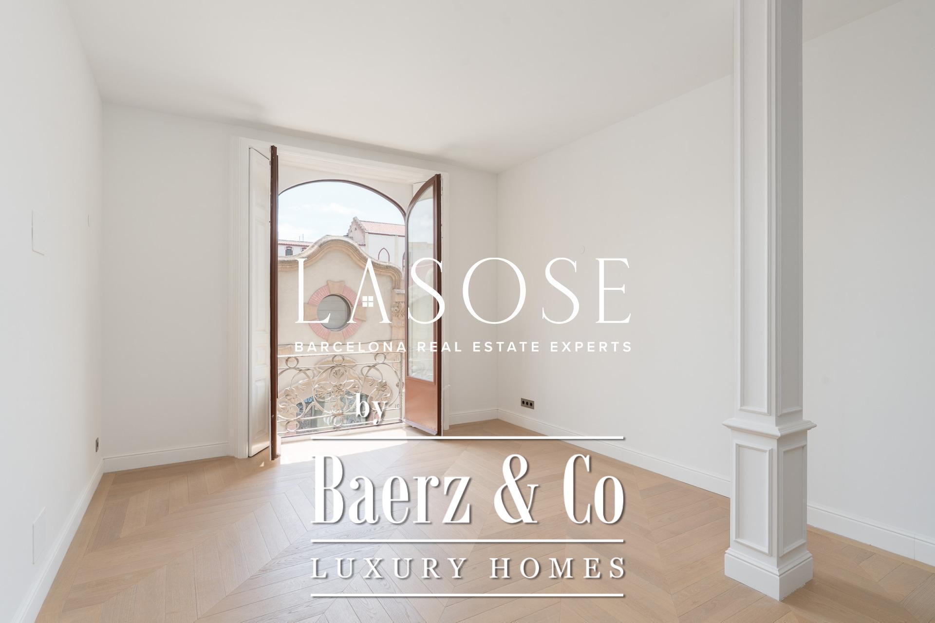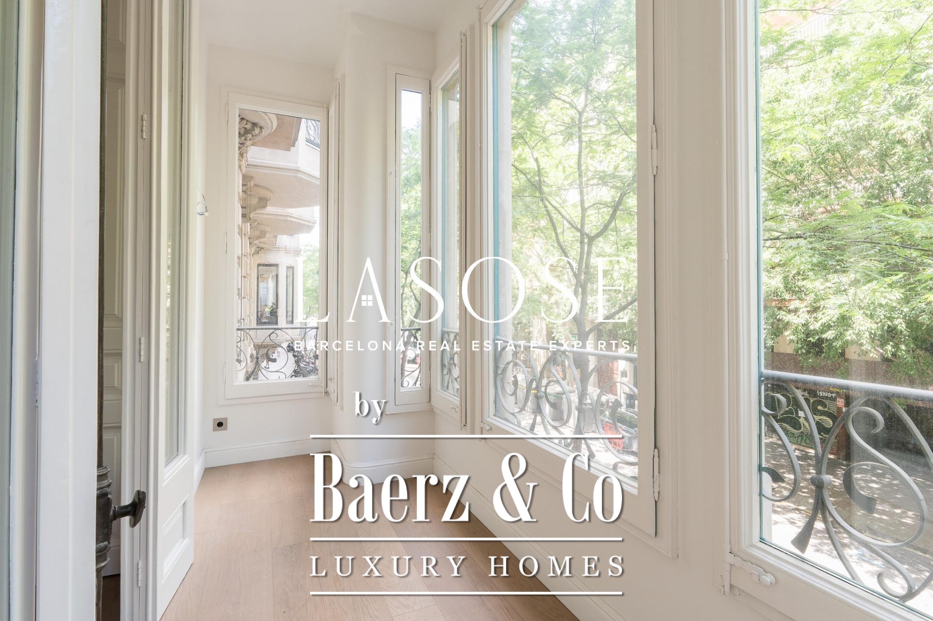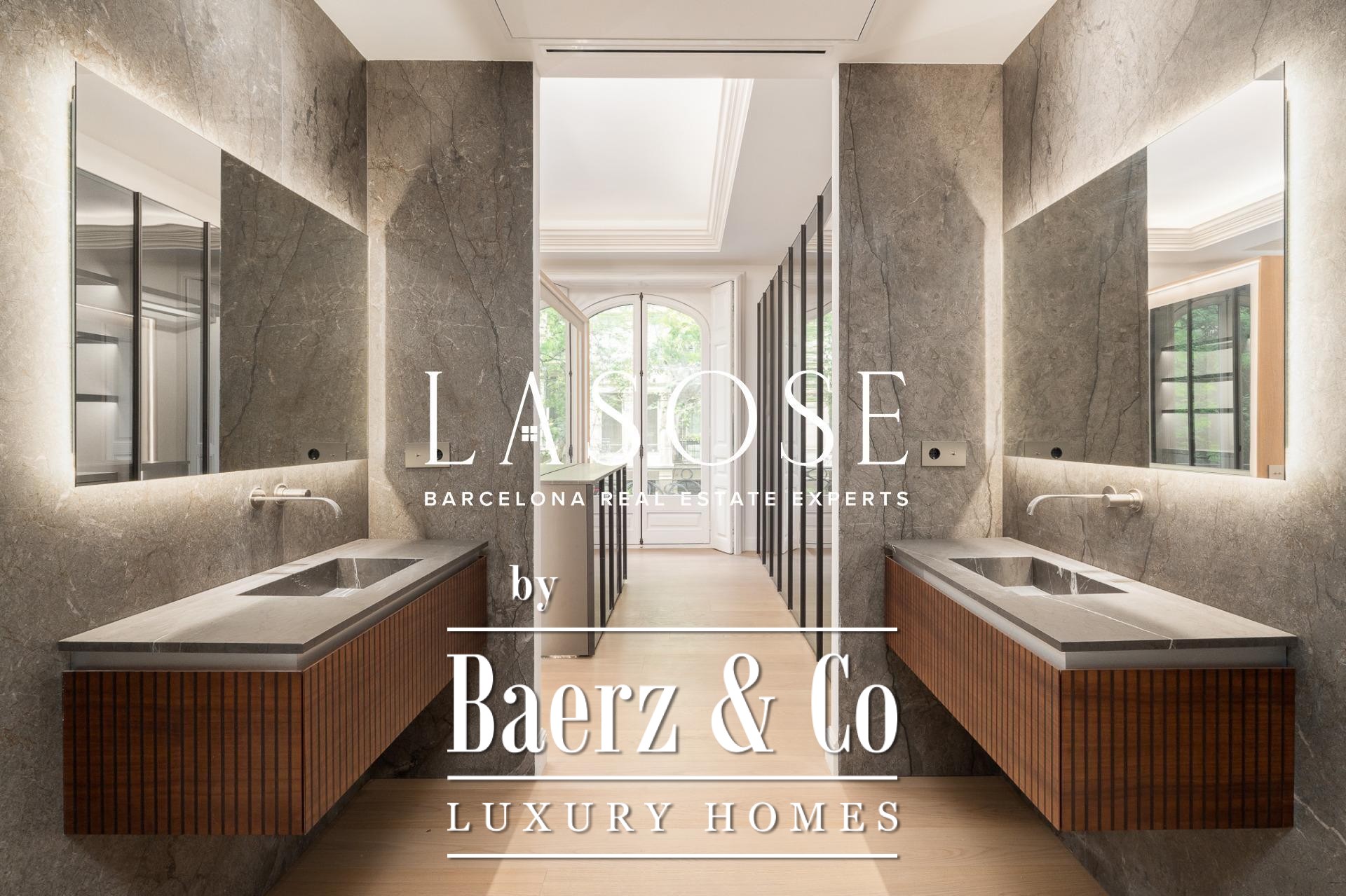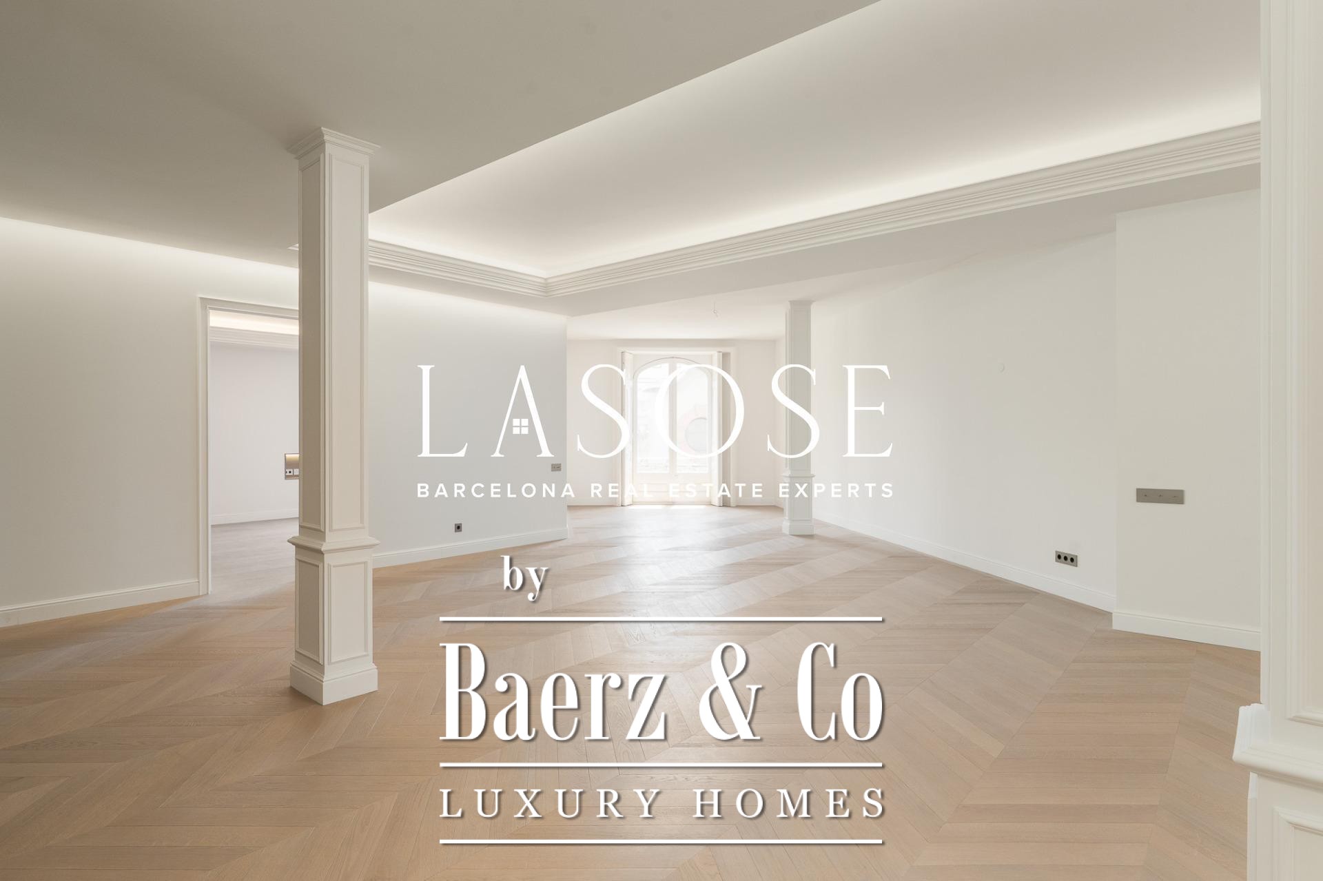 LASOSE presents this magnificent 347 m² property, completely renovated, which combines the charm of a classic estate with the comfort and sophistication of contemporary design. Located in an elegant regal estate dating from 1885, with elevator and in excellent condition, this property offers a unique experience in one of the most vibrant areas of the city.. . Located on the interfloor and with ceilings of 3.2 meters high, the apartment enjoys an exceptional luminosity thanks to its views to two streets and its southeast orientation. From the entrance, it surprises with a spectacular welcome area adorned with modernist details that make the difference.. . The day area consists of a large living-dining room with open kitchen, equipped with a central island space for six diners, ideal for meetings and dinners. This space is complemented by an elegant office, a guest toilet and a practical laundry area with washing machine, dryer and storage cabinets.. . The jewel of the home is its impressive 60 m² master suite, which