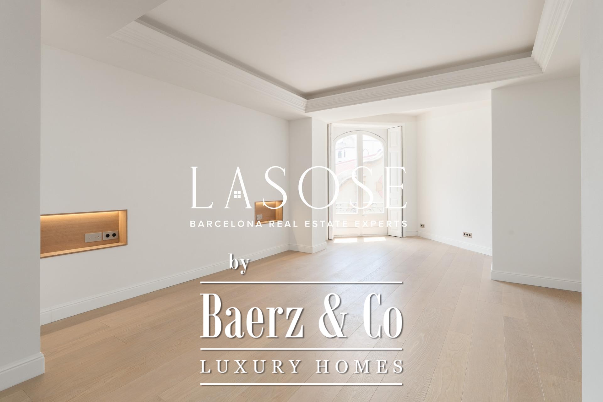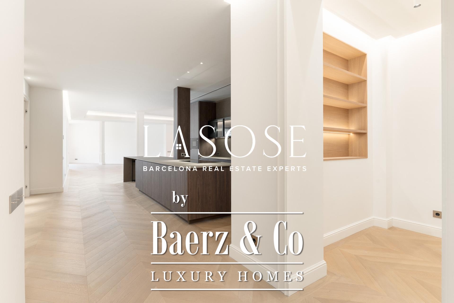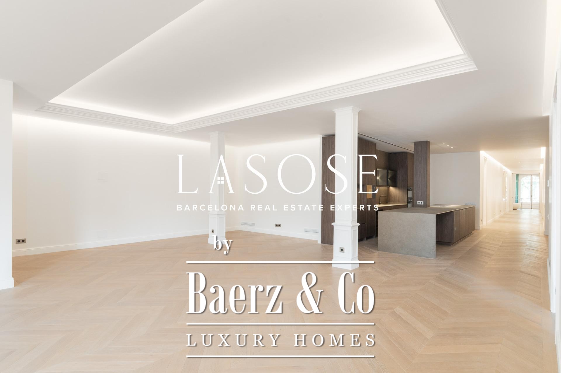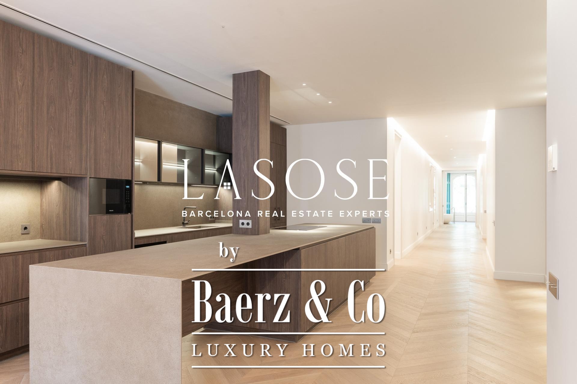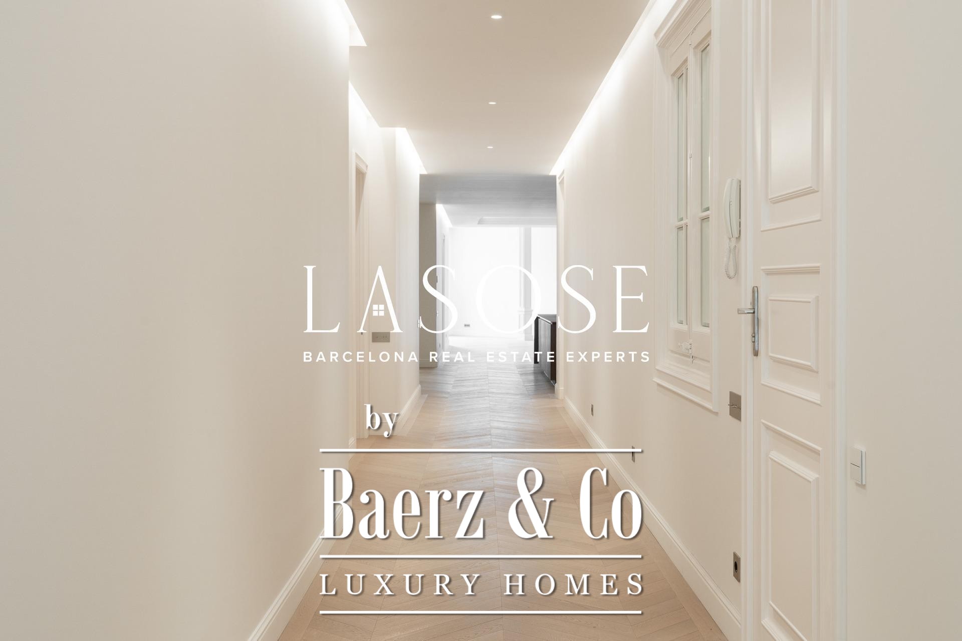 LASOSE presents this magnificent 347 m² property, completely renovated, which combines the charm of a classic estate with the comfort and sophistication of contemporary design. Located in an elegant regal estate dating from 1885, with elevator and in excellent condition, this property offers a unique experience in one of the most vibrant areas of the city.. . Located on the interfloor and with ceilings of 3.2 meters high, the apartment enjoys an exceptional luminosity thanks to its views to two streets and its southeast orientation. From the entrance, it surprises with a spectacular welcome area adorned with modernist details that make the difference.. . The day area consists of a large living-dining room with open kitchen, equipped with a central island space for six diners, ideal for meetings and dinners. This space is complemented by an elegant office, a guest toilet and a practical laundry area with washing machine, dryer and storage cabinets.. . The jewel of the home is its impressive 60 m² master suite, which