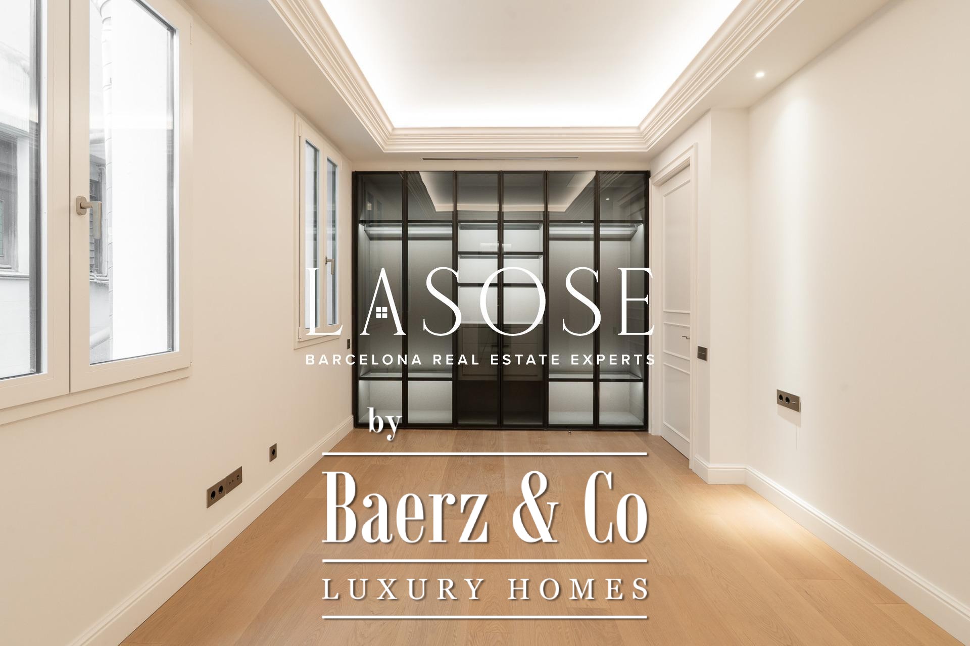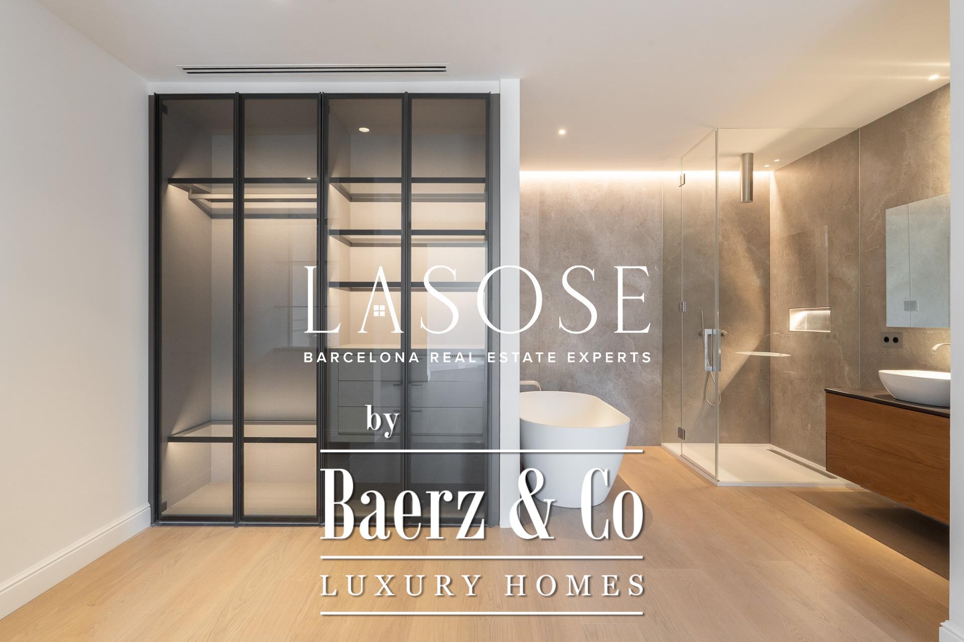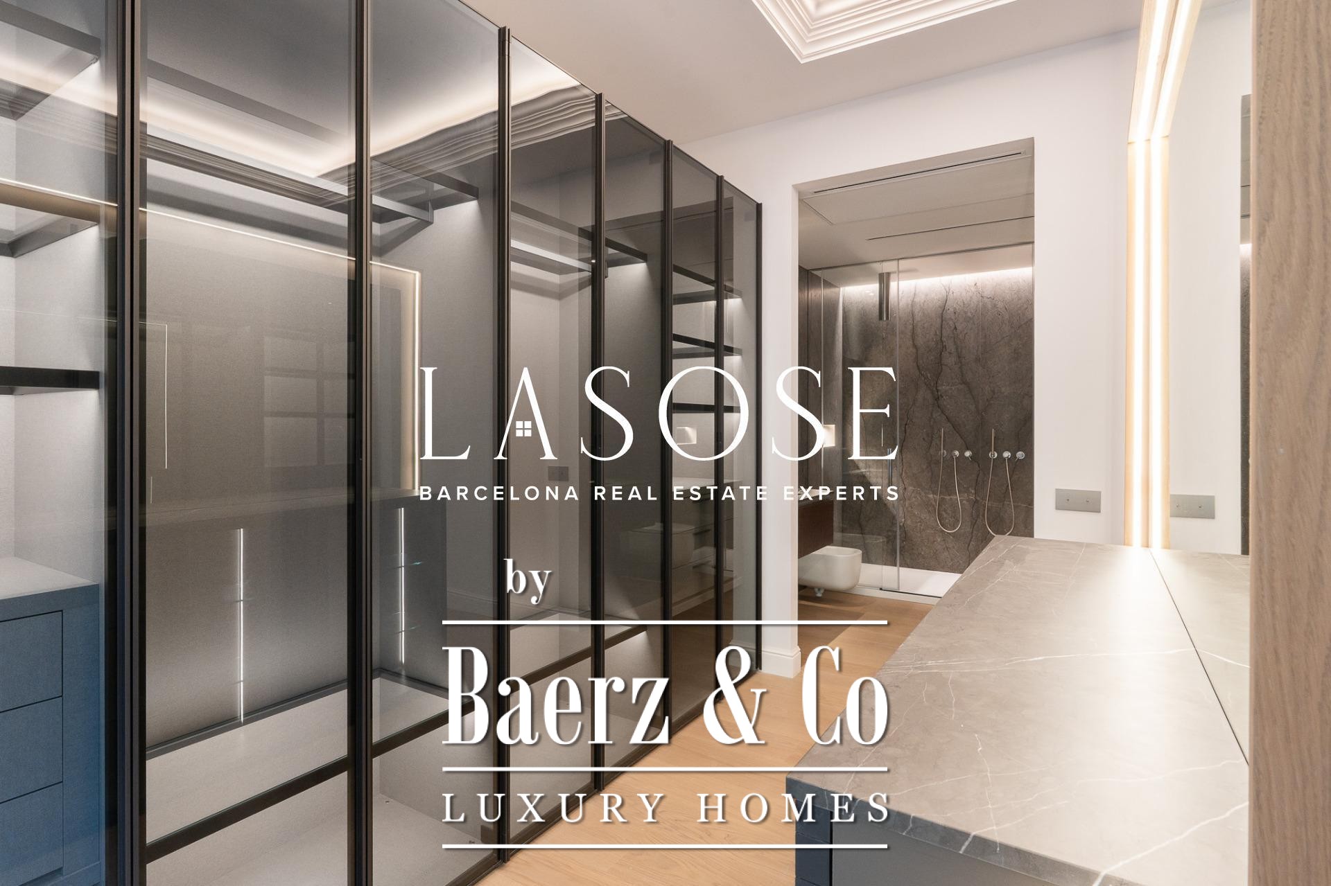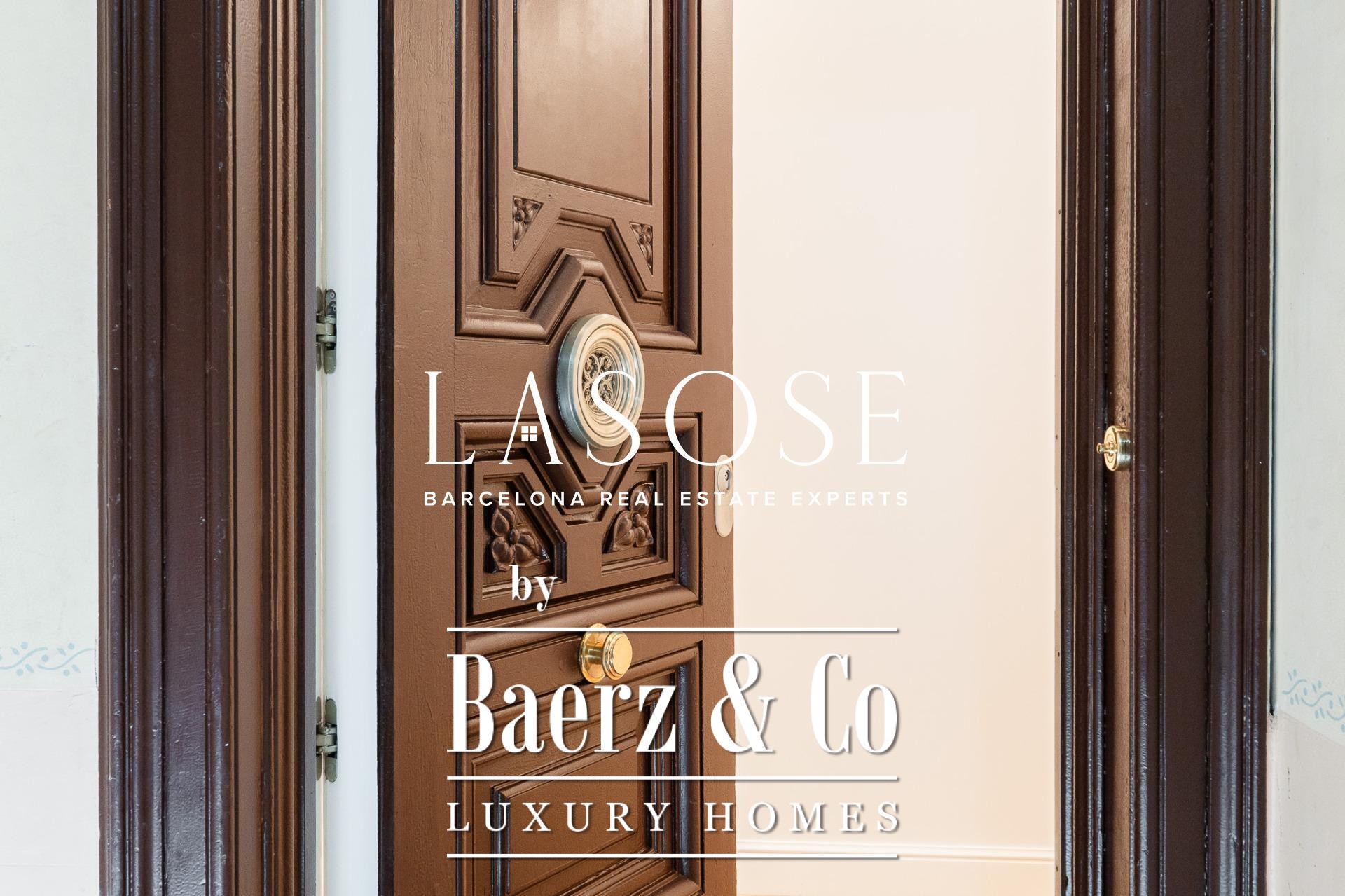 LASOSE presents this magnificent 347 m² property, completely renovated, which combines the charm of a classic estate with the comfort and sophistication of contemporary design. Located in an elegant regal estate dating from 1885, with elevator and in excellent condition, this property offers a unique experience in one of the most vibrant areas of the city.. . Located on the interfloor and with ceilings of 3.2 meters high, the apartment enjoys an exceptional luminosity thanks to its views to two streets and its southeast orientation. From the entrance, it surprises with a spectacular welcome area adorned with modernist details that make the difference.. . The day area consists of a large living-dining room with open kitchen, equipped with a central island space for six diners, ideal for meetings and dinners. This space is complemented by an elegant office, a guest toilet and a practical laundry area with washing machine, dryer and storage cabinets.. . The jewel of the home is its impressive 60 m² master suite, which