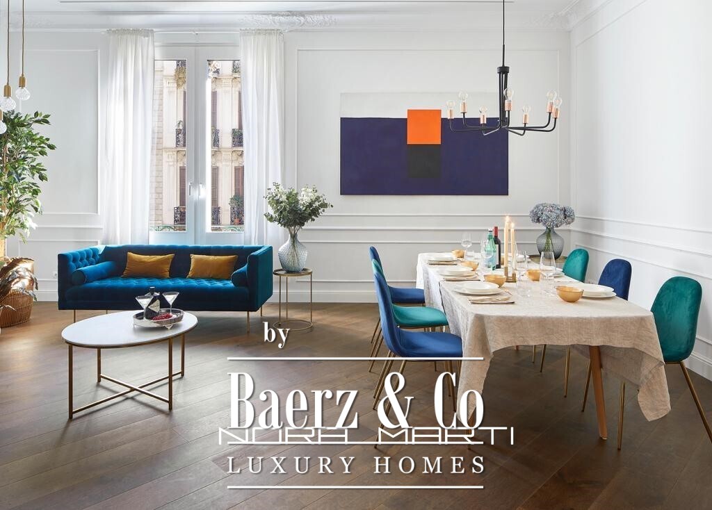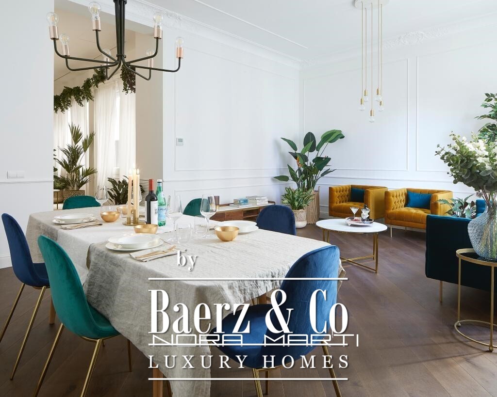 The spacious living-dining room stands out for its high ceilings, original moldings, and a carefully selected selection of furniture that combines vibrant tones with fine materials. The fully equipped kitchen and bathrooms offer top-quality finishes and a layout designed for everyday comfort.