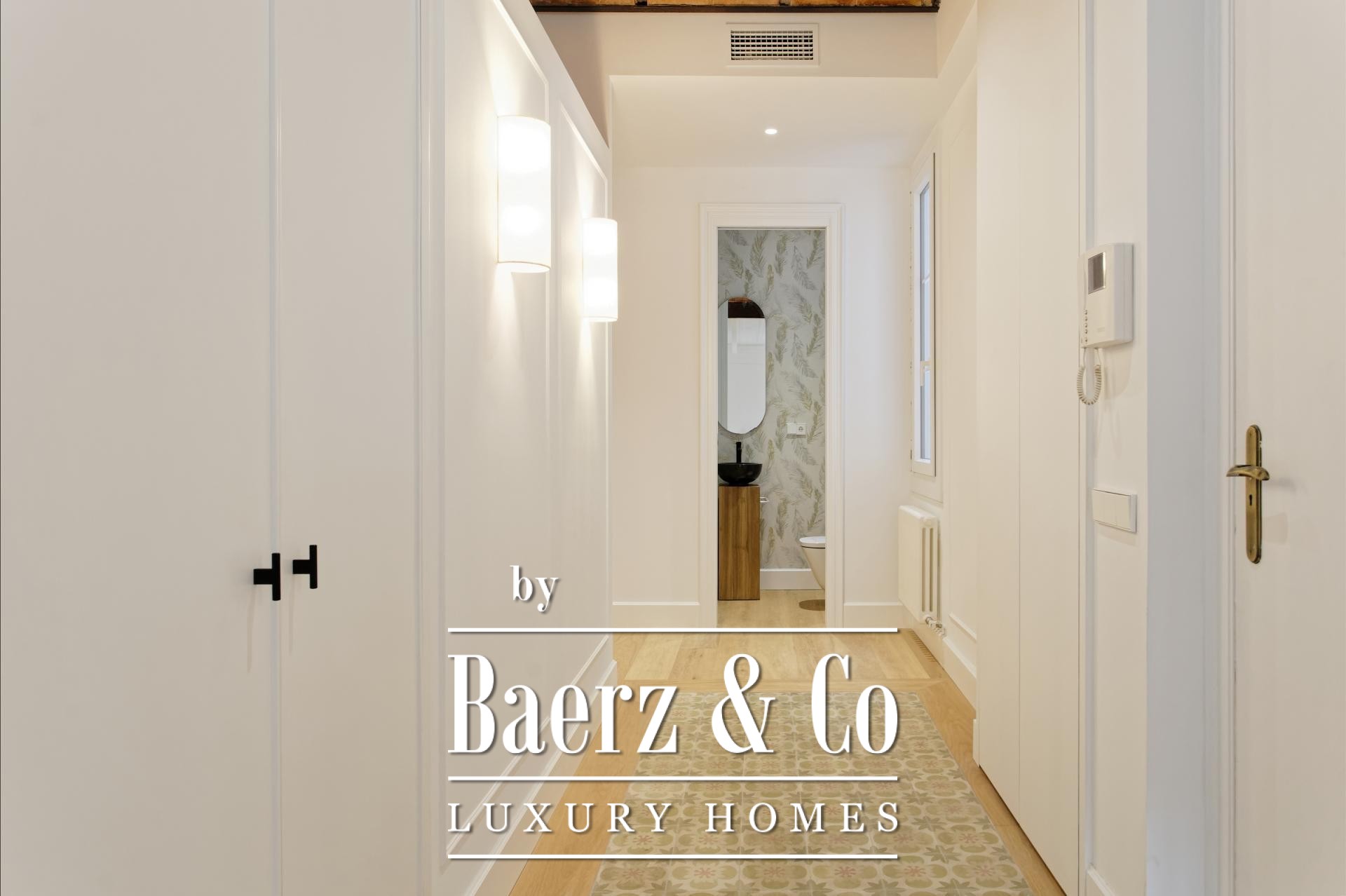 The living and dining spaces are shaped for both comfort and quiet hospitality, unfolding alongside a fully appointed kitchen and a separate laundry room. This carefully renovated apartment retains authentic elements while introducing contemporary finishes and access via elevator, creating an atmosphere of understated, historic Barcelona living.