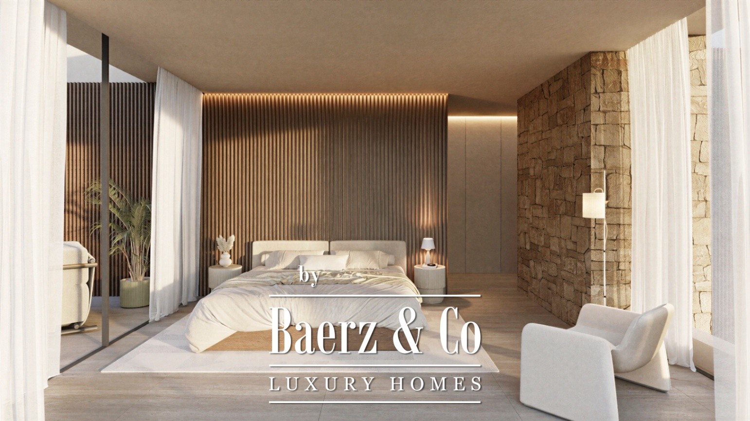This exclusive new build villa is situated on a plot of 800 m² just a stone's throw from La Fustera beach. The architecture combines Mediterranean warmth with contemporary elegance, blending natural stone, wood, and soft neutral tones, allowing the property to seamlessly integrate with the landscape. With a total built area of 716 m² spread over three floors, the villa offers a perfect balance of functionality, design, and comfort. The ground floor of 105.97 m² features a fully equipped gym, a laundry room, and technical rooms, with the possibility of adding extra spaces such as a wine cellar or cinema. This level also houses the pool's filtration system and water tanks, ensuring efficient management of all technical installations. The main level (ground floor), with an area of 137.93 m², has a bright, open layout that reflects the essence of Mediterranean living. The spacious living room, dining room, and kitchen provide access through large floor-to-ceiling windows to the main terrace and the infinity pool, with incredible panoramic sea views. Two double bedrooms, a complete