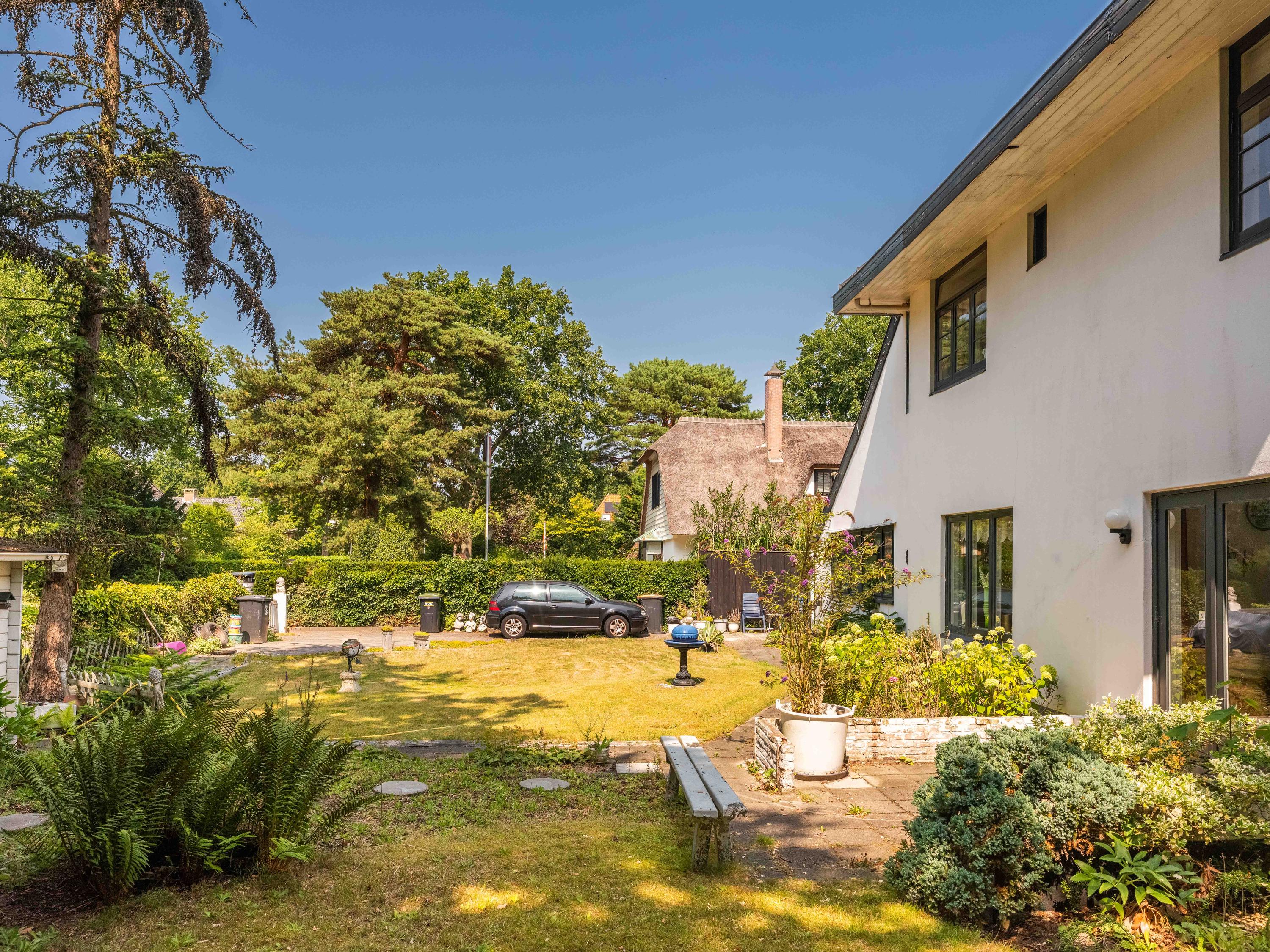 The driveway gives access to the plot. Here you will also find a large detached garage. Plenty of room for cars on private property. The villa is located on a spacious plot with beautifully landscaped trees and bushes all around.