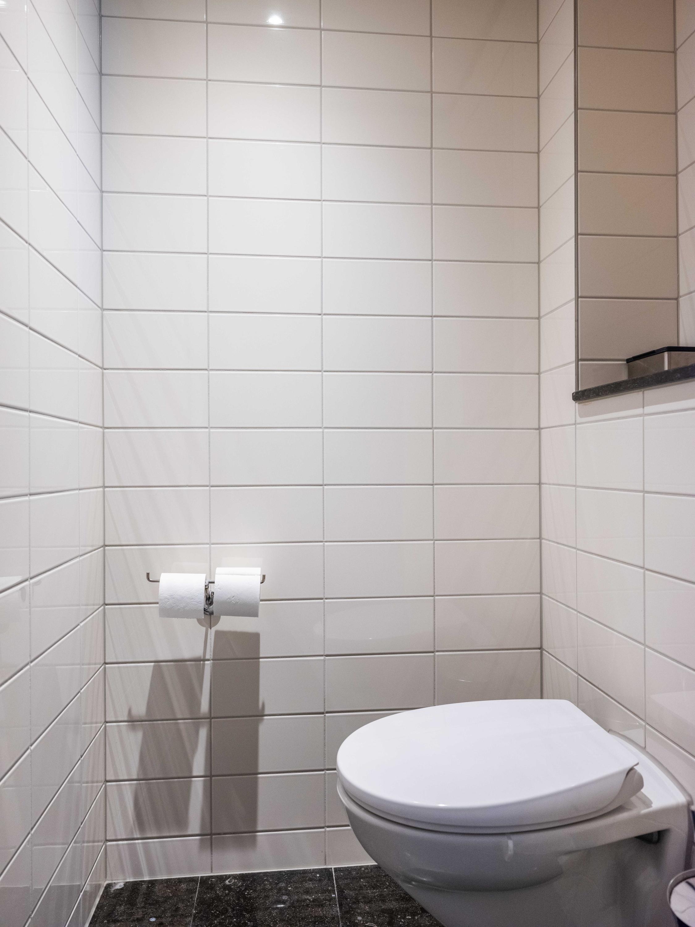 A few steps below, the playful half-hexagonal kitchen is fitted with modern built-in appliances and flows to a sunken dining area with space for large gatherings. Upstairs, three generous bedrooms await, including a master suite with gas fireplace, walk-in closet, balcony over the green garden, and access to two bathrooms—one with bathtub, shower, and wide sink, the other more intimate in scale.